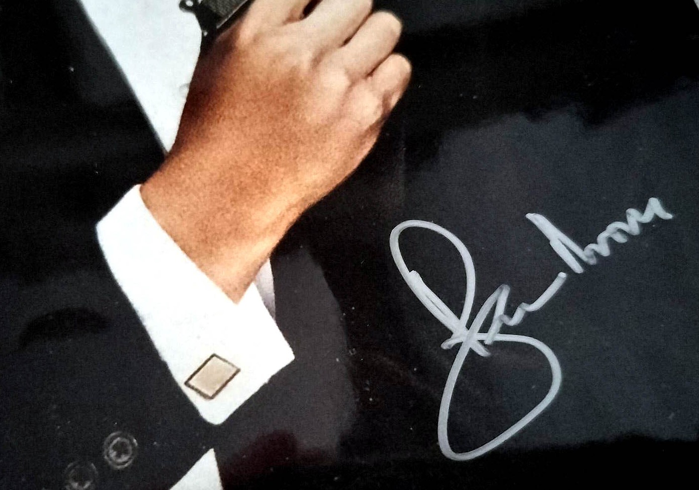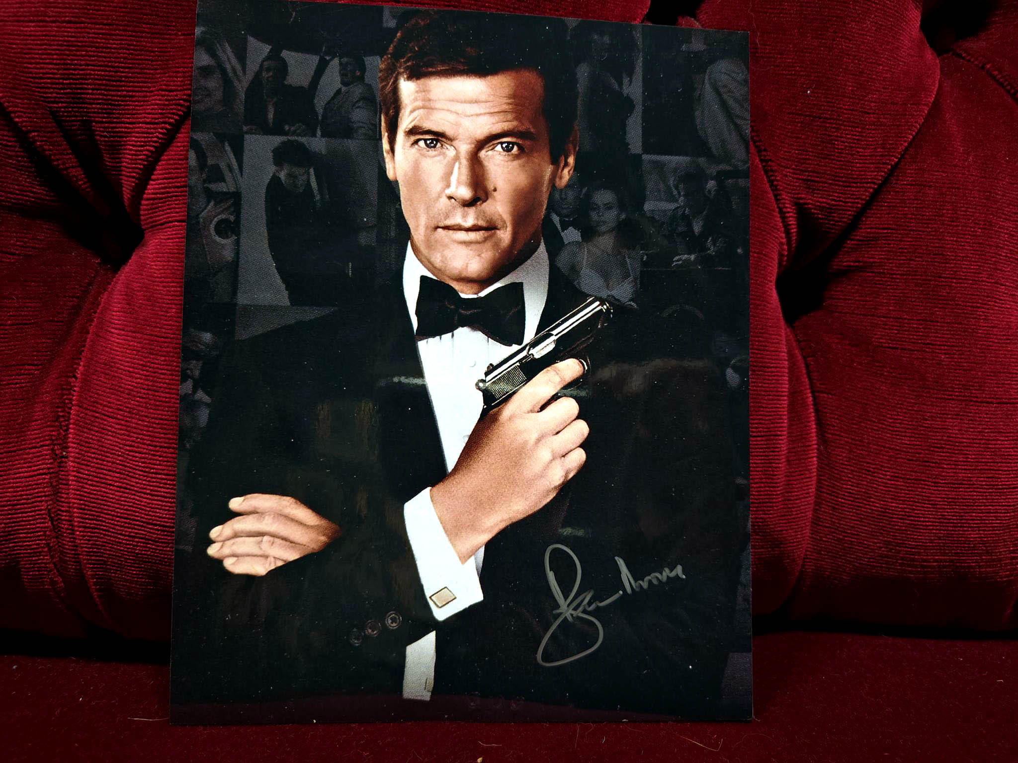 Kohde: Sir Roger Mooren alkuperäinen nimikirjoitus valokuvakortissa elokuvasta ”007 – The Spy Who Loved Me”, 1977
