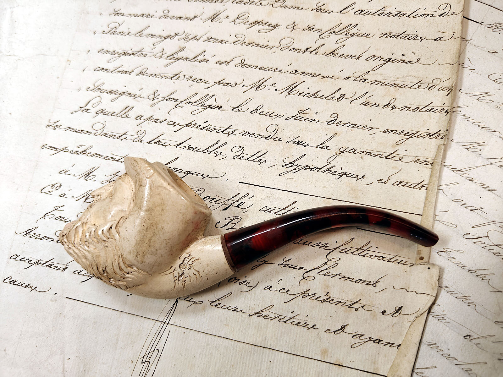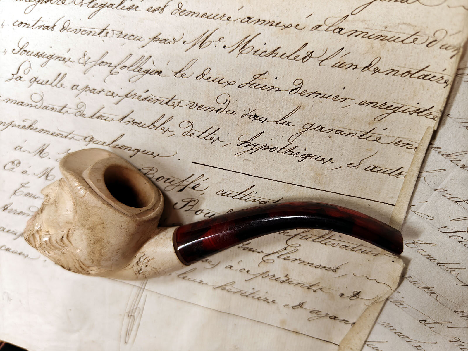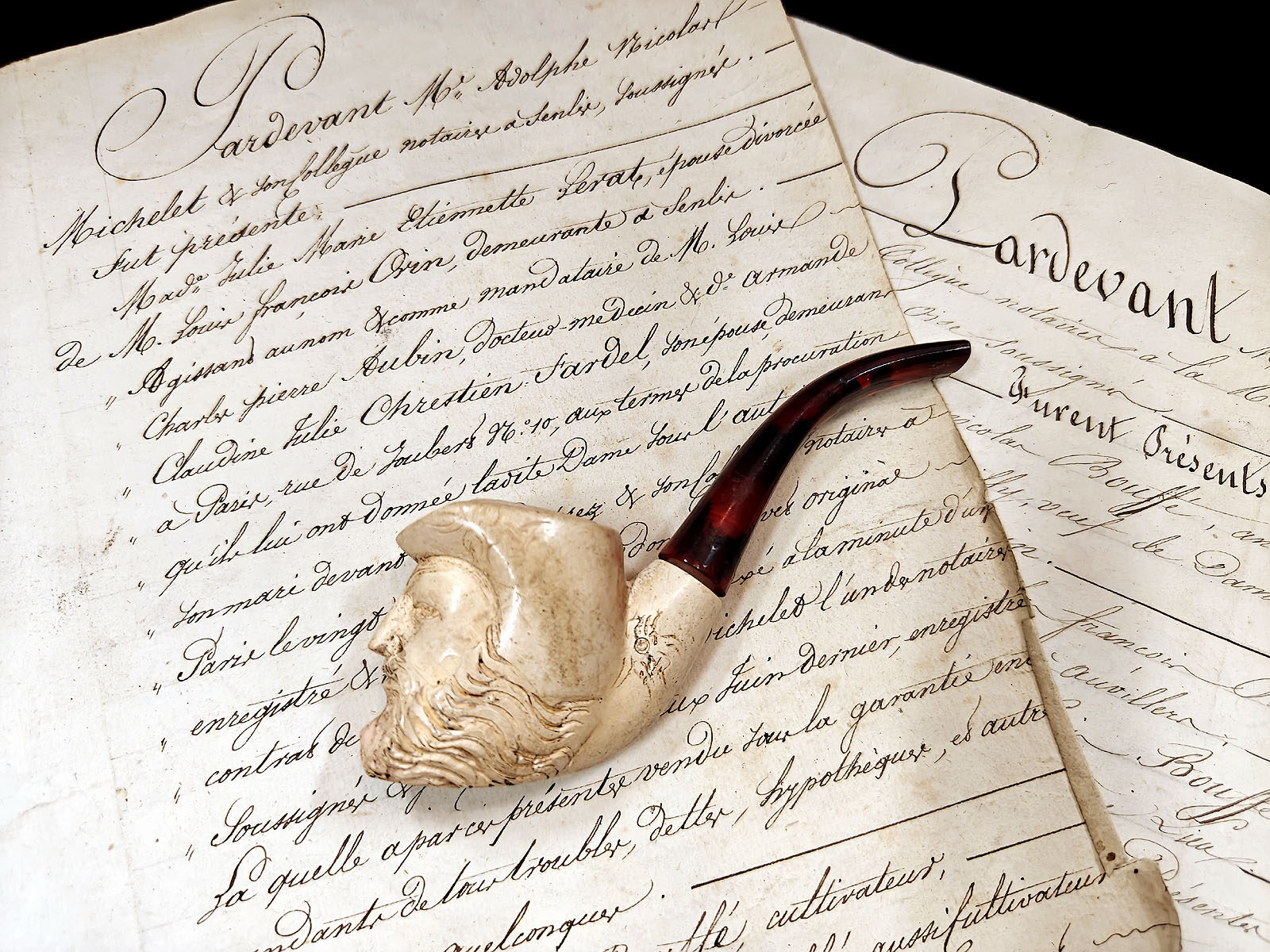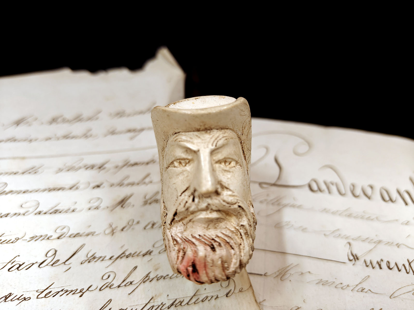 Toisin kuin puhtaat koristepiiput, tämä esine kantaa pinnassaan elettyä elämää: tupakan öljyt ovat hitaasti värjänneet vaalean merenvahan, antaen parralle lämpimän ja elävän sävyn. Kuvat paljastavat veistotyön syvyyden; hatun lieri kaartuu orgaanisesti pesän ympärille ja suojaa hahmon mietteliäitä kasvoja. Piippu on voinut aikoinaan kulkea wieniläisestä verstaasta pariisilaisen herrasmiehen tai seikkailijan taskuun. ”L’Aventurier” on upea ja harvinainen löytö, jossa piippumaailman ”valkoinen kulta” on saanut ylleen ajan arvokkaan hunnun.