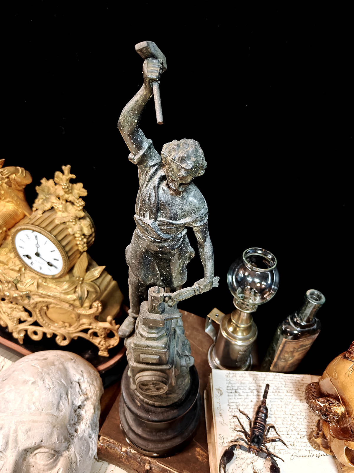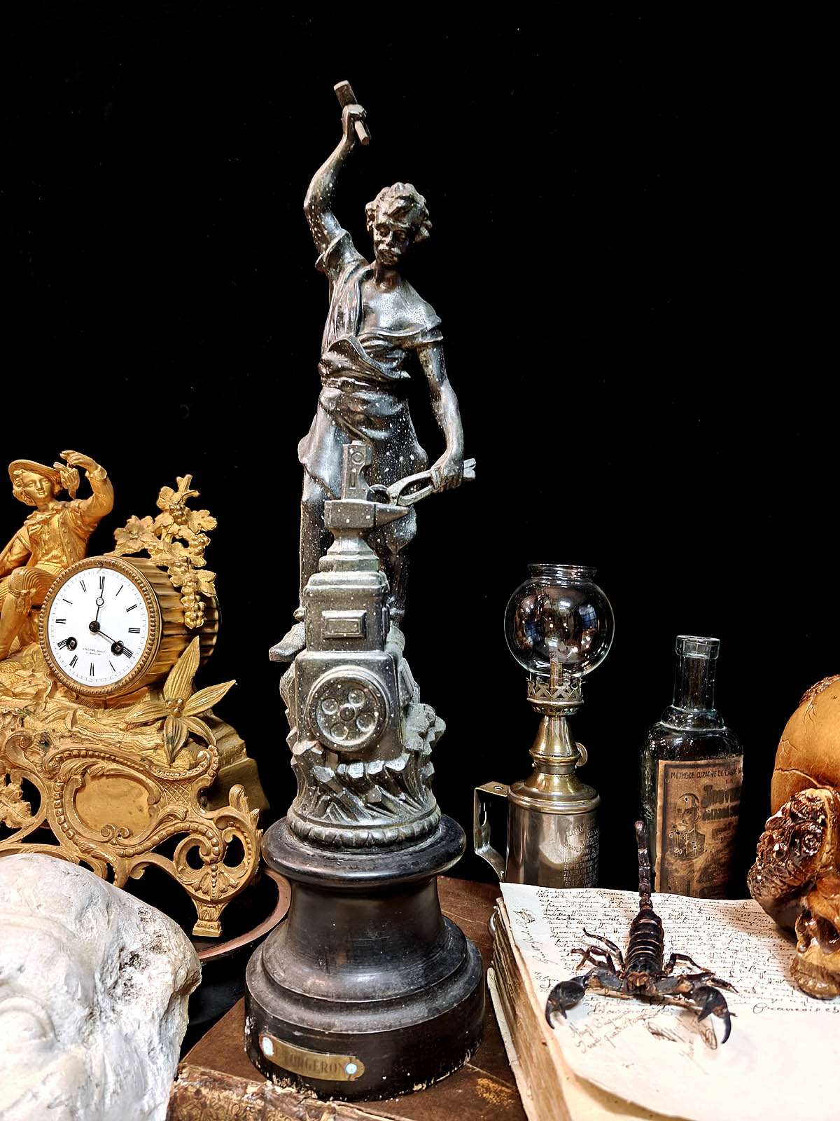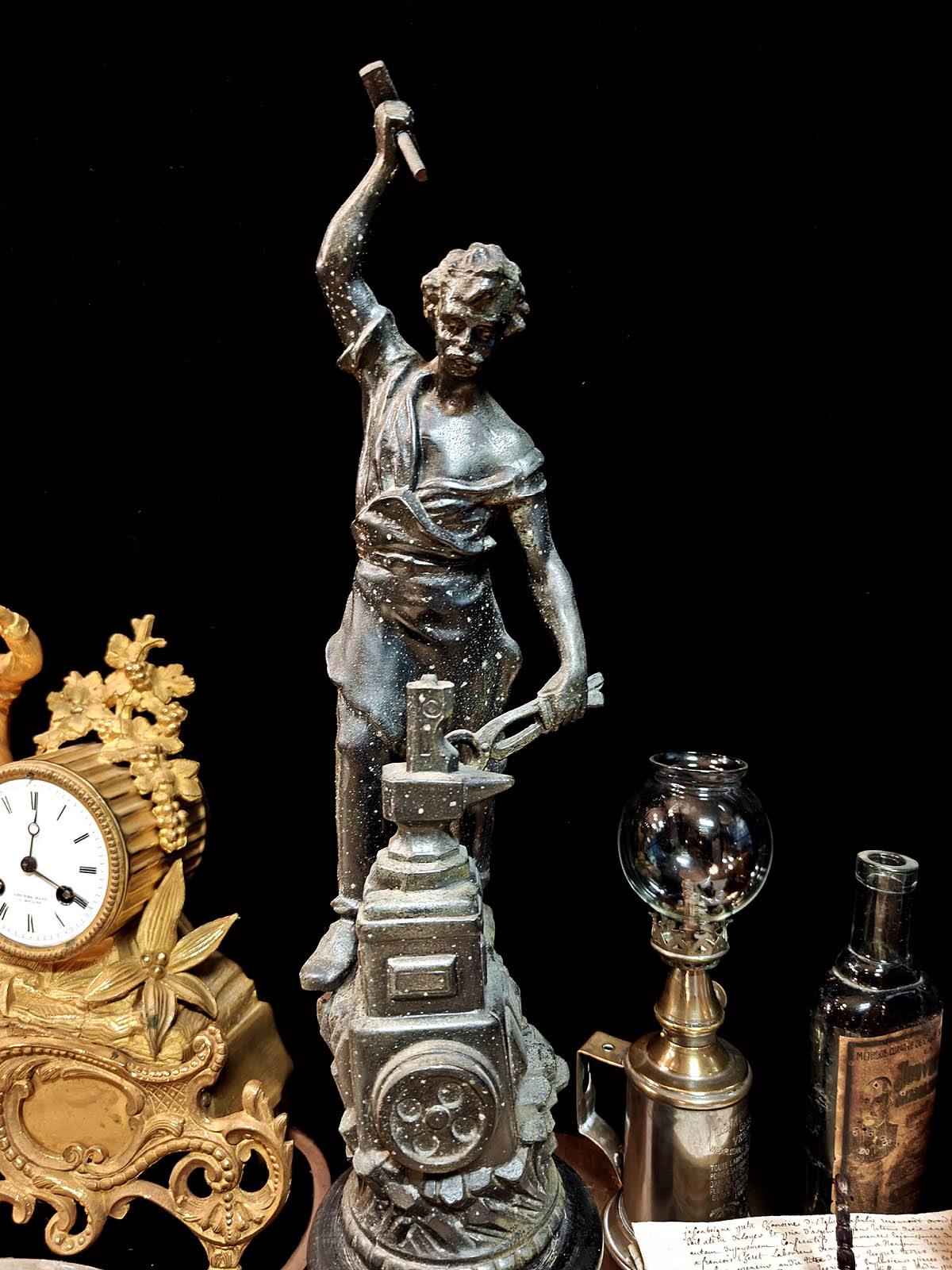 Muuta: Näyttävä ja kookas ranskalainen patsas, joka edustaa 1800–1900‑lukujen vaihteen ranskalaista teollisuusaiheista veistotaidetta. Se kuvaa seppää perinteisissä työvarusteissaan, pajavasara toisessa kädessä ja pihdit toisessa, alasimella työskentelemässä. Alasin on asetettu hammasrattaita sisältävän koneiston päälle, mikä symboloi käsityöperinteen ja modernin teollisuuden kohtaamista.Kokonaisuus on vaikuttava katseenvangitsija, joka tuo tilaan näyttävyyttä, historiallista eleganssia ja toimii samalla erinomaisesti paraatipaikan keskipisteenä.