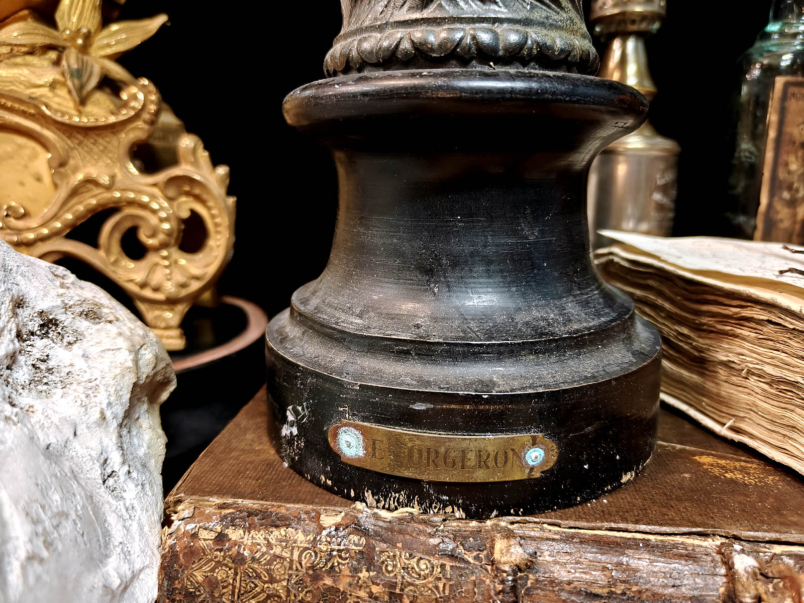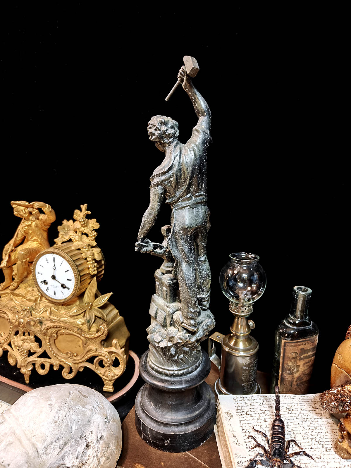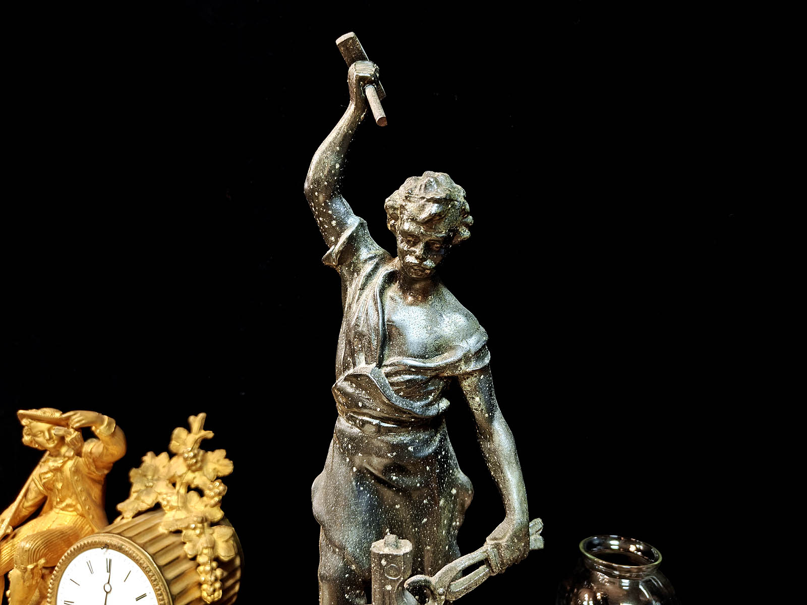 Muuta: Näyttävä ja kookas ranskalainen patsas, joka edustaa 1800–1900‑lukujen vaihteen ranskalaista teollisuusaiheista veistotaidetta. Se kuvaa seppää perinteisissä työvarusteissaan, pajavasara toisessa kädessä ja pihdit toisessa, alasimella työskentelemässä. Alasin on asetettu hammasrattaita sisältävän koneiston päälle, mikä symboloi käsityöperinteen ja modernin teollisuuden kohtaamista.Kokonaisuus on vaikuttava katseenvangitsija, joka tuo tilaan näyttävyyttä, historiallista eleganssia ja toimii samalla erinomaisesti paraatipaikan keskipisteenä.