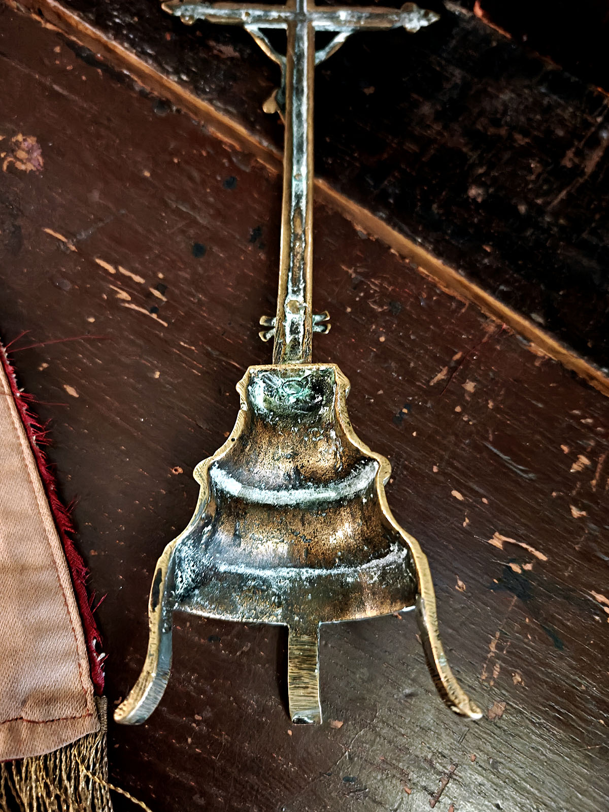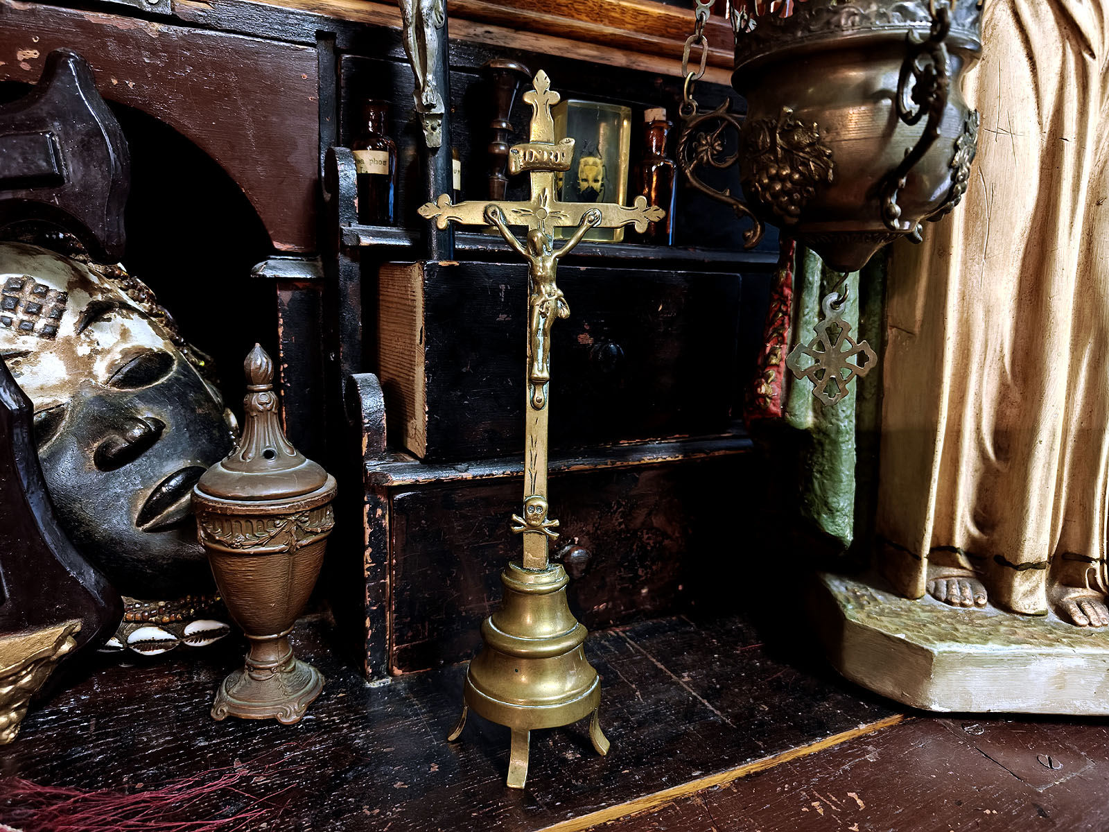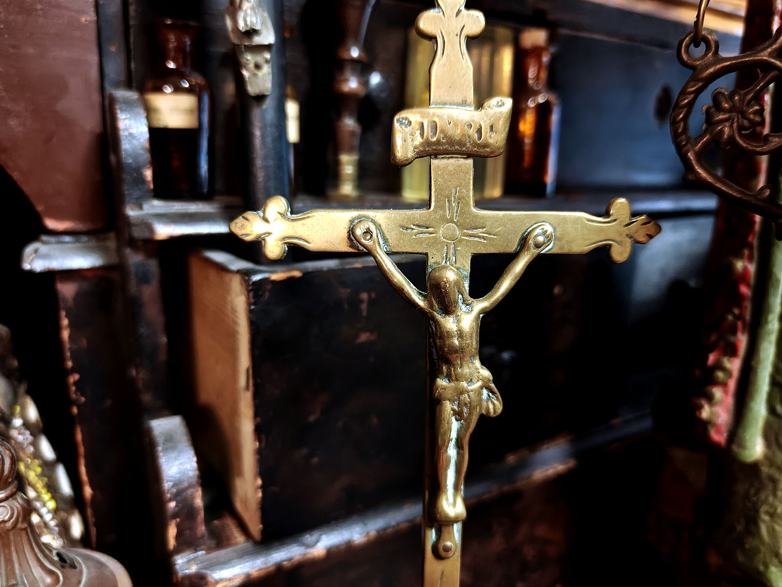 Muuta: Tämä messinkinen pöytäkrusifiksi on tyylipuhdas esimerkki uskonnollisesta esineistöstä, jossa yhdistyvät hartaus ja kuoleman muistaminen. Ristin päiden apilanlehtimuotoilu symboloi pyhää kolminaisuutta ja Kristuksen pään takana oleva kaiverrettu sädekehä korostaa hänen jumalallisuuttaan kärsimyksen keskellä.