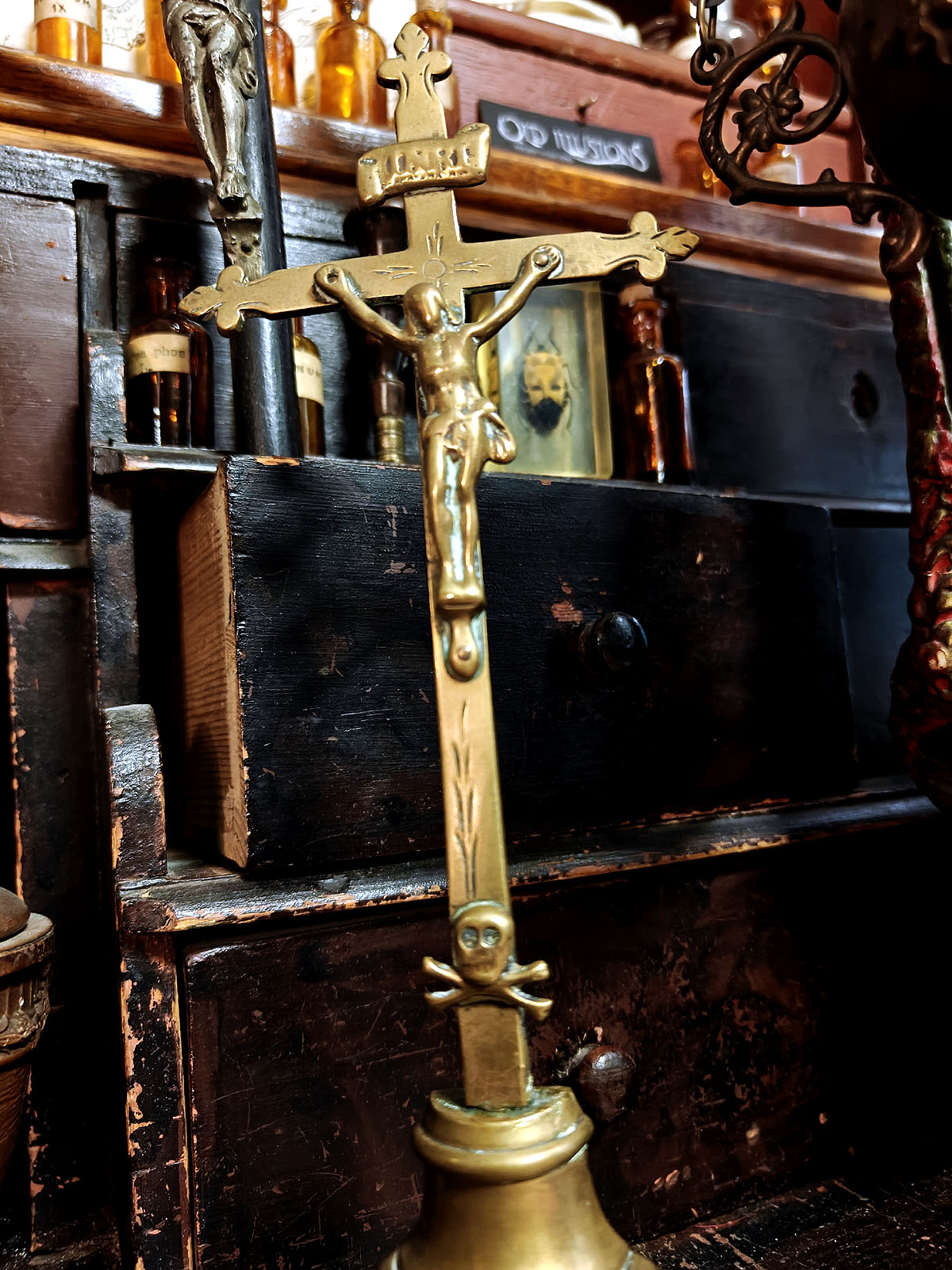 Ristin alaosassa sijaitseva pääkallo ja ristikkäiset luut edustavat kristillisen taiteen voimakasta Memento Mori -perinnettä, joka muistuttaa katsojaa elämän rajallisuudesta ja kuoleman vääjäämättömyydestä. Teologisesti symboli viittaa Golgatan, eli ”Pääkallonpaikan” merkitykseen: perimätiedon mukaan Kristus ristiinnaulittiin ensimmäisen ihmisen, Aadamin, hautapaikalle, jolloin pääkallo ristin juurella symboloi Kristuksen saavuttamaa voittoa kuolemasta ja synnistä. Tämä 27 cm korkea krusifiksi on paitsi uskonnollinen artefakti, myös puhutteleva historiallinen esine, joka sopii täydellisesti osaksi kuriositeettikabinettia tai antiikkikokoelmaa.