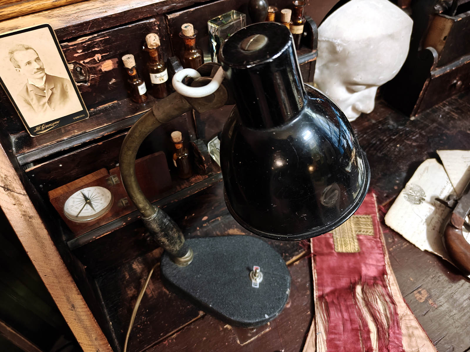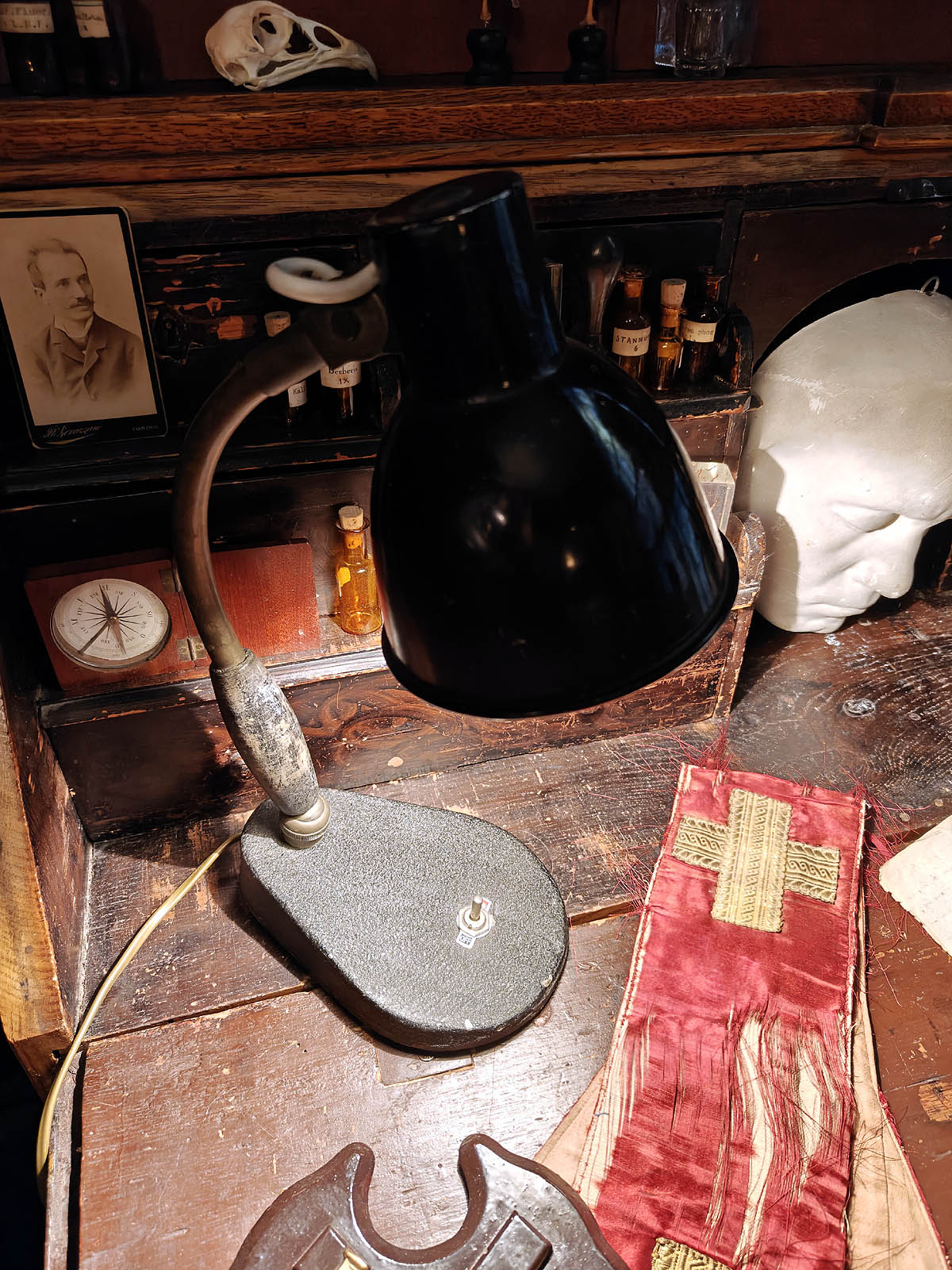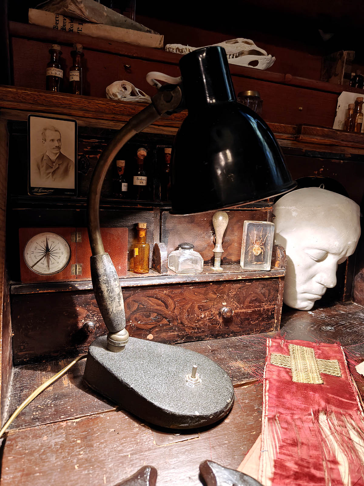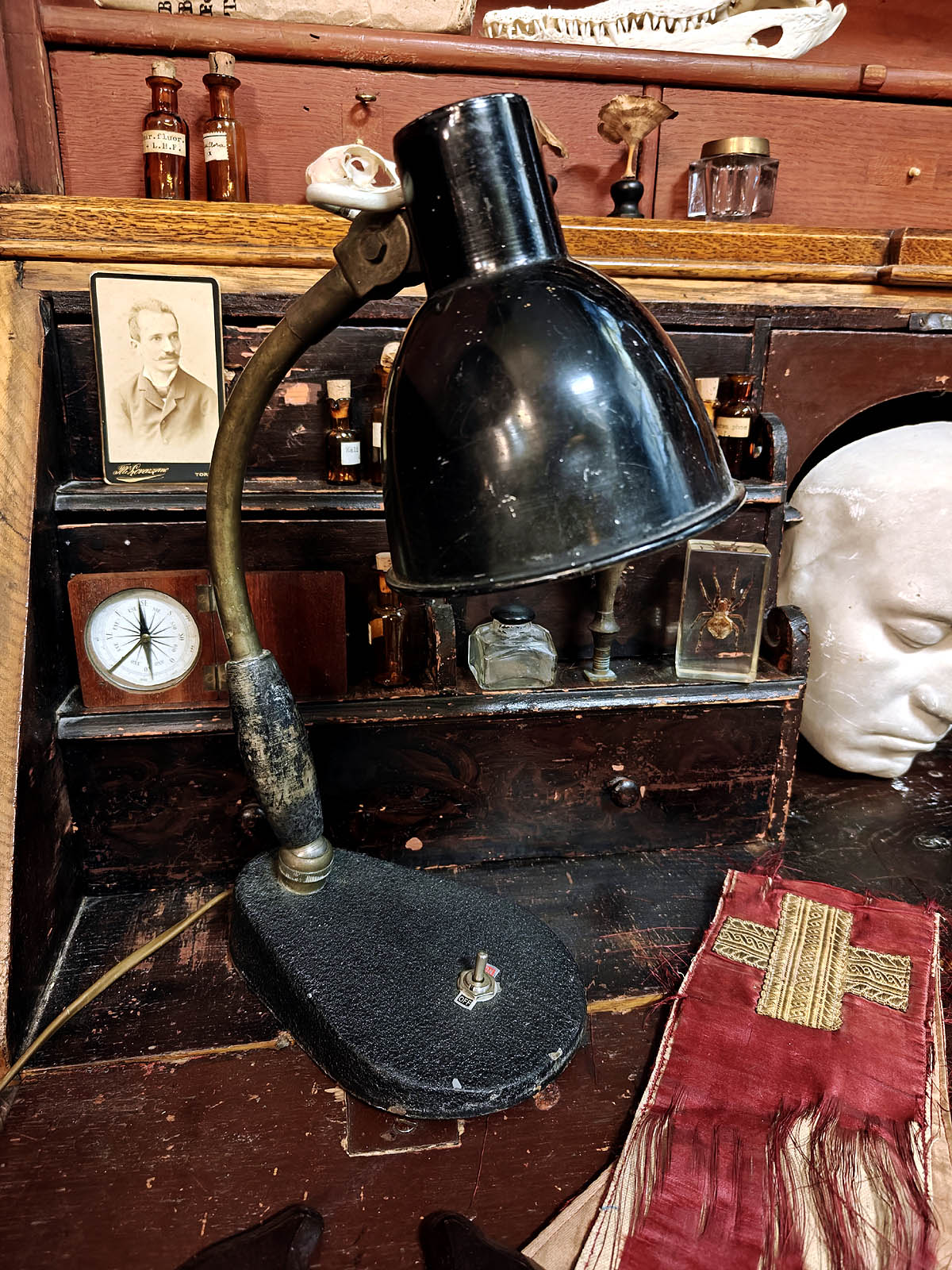 Muuta: Tämä 1930-luvun teollisuuspöytälamppu edustaa Bauhaus liikkeen puhdaslinjaista estetiikkaa, jossa funktionaalisuus, materiaalin rehellisyys ja selkeä geometria ovat kaiken ytimessä. Mustasta alumiinista valmistettu säädettävä varjostin ja raskas valurautajalka ovat tyypillisiä piirteitä, jotka yhdistävät lampun Marianne Brandtin ja Christian Dellin suunnitteluperinteeseen. Hieno ja tyylikäs valaisin esim. vanhan työhuoneen miljööseen.
