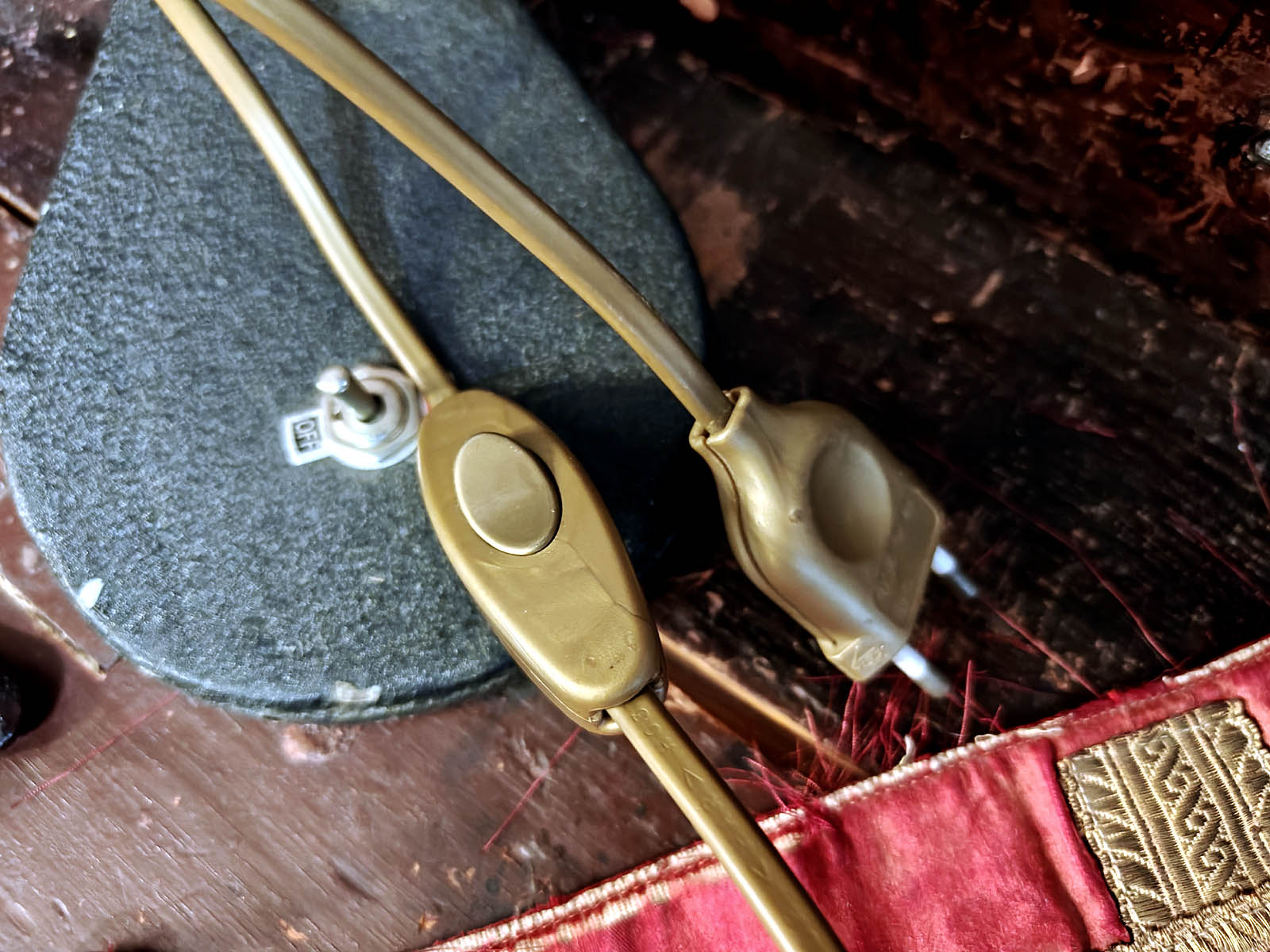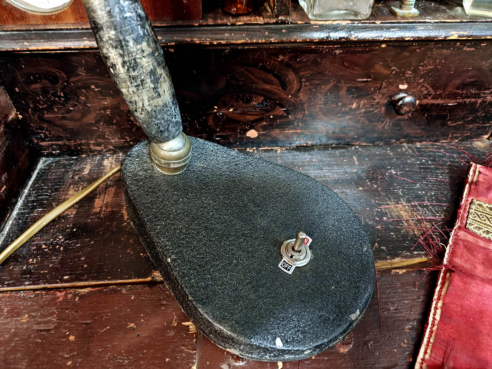 Kunto: Hyvä, ajan patina säilynyt kauniisti. Alkuperäinen jalustassa oleva päälle/pois -kytkin poistettu käytöstä