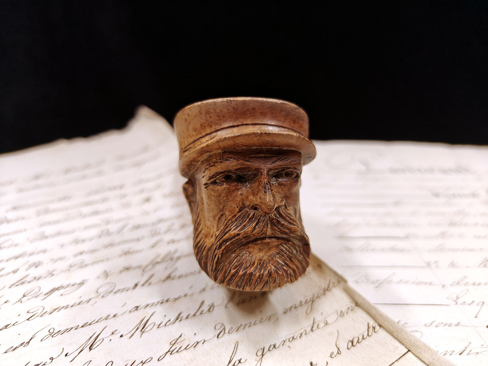 Muuta: Tämä ilmeikäs figuraalinen piippu on hieno esimerkki ranskalaisesta piipputaiteesta, jossa käyttöesine muuttuu pienoisveistokseksi. Piippu esittää iäkkäämpää, parrakasta miestä, jonka päähineenä on klassinen sotilas- tai virkamieslakki. Hahmo, joka tunnetaan keräilijöiden keskuudessa usein nimellä ”Le Capitaine”, huokuu vanhan maailman auktoriteettia ja tyyntä viisautta.