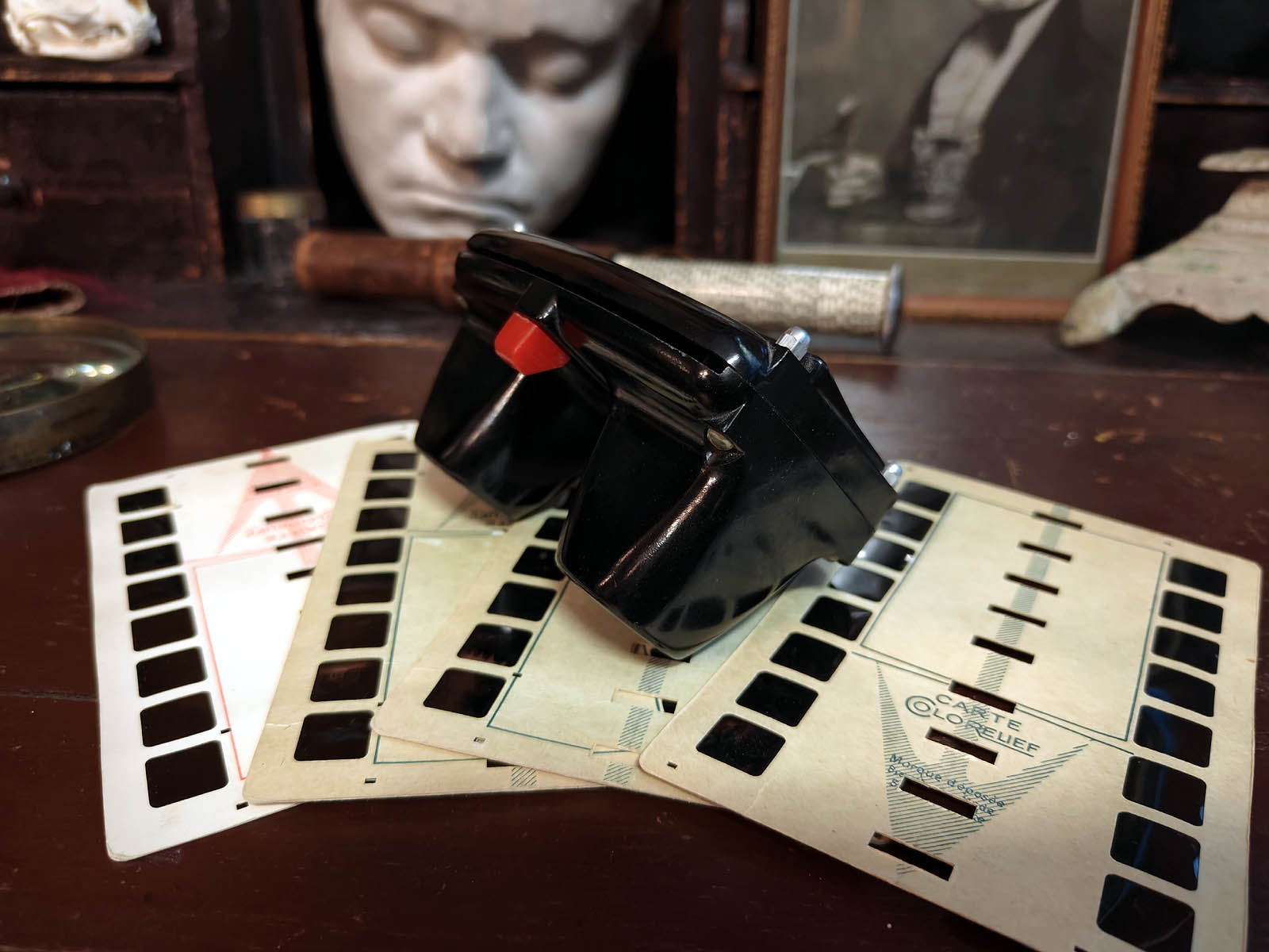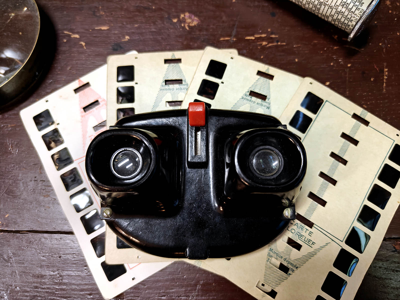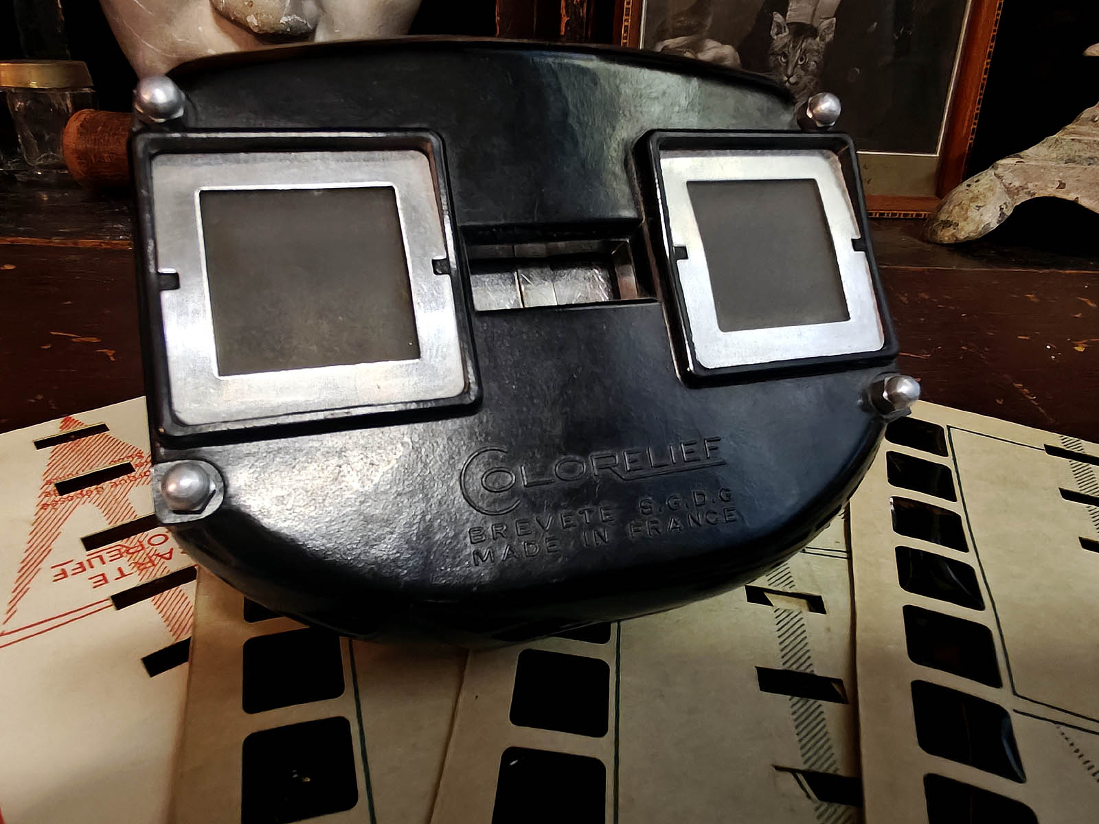 Muuta: Tämä Colorelief stereoskooppi edustaa 1950-luvun ranskalaista optista viihdeteknologian aikakautta parhaimmillaan, jolloin kolmiulotteinen kuva oli vielä pieni ihme ja bakeliitti oli modernin muotoilun jalokivi. Laitteen kahdet linssit ja suuret valoaukot luovat kirkkaan syvän 3D- efektin, kun katselukortti liukuu mekanismin läpi kuva kuvalta.