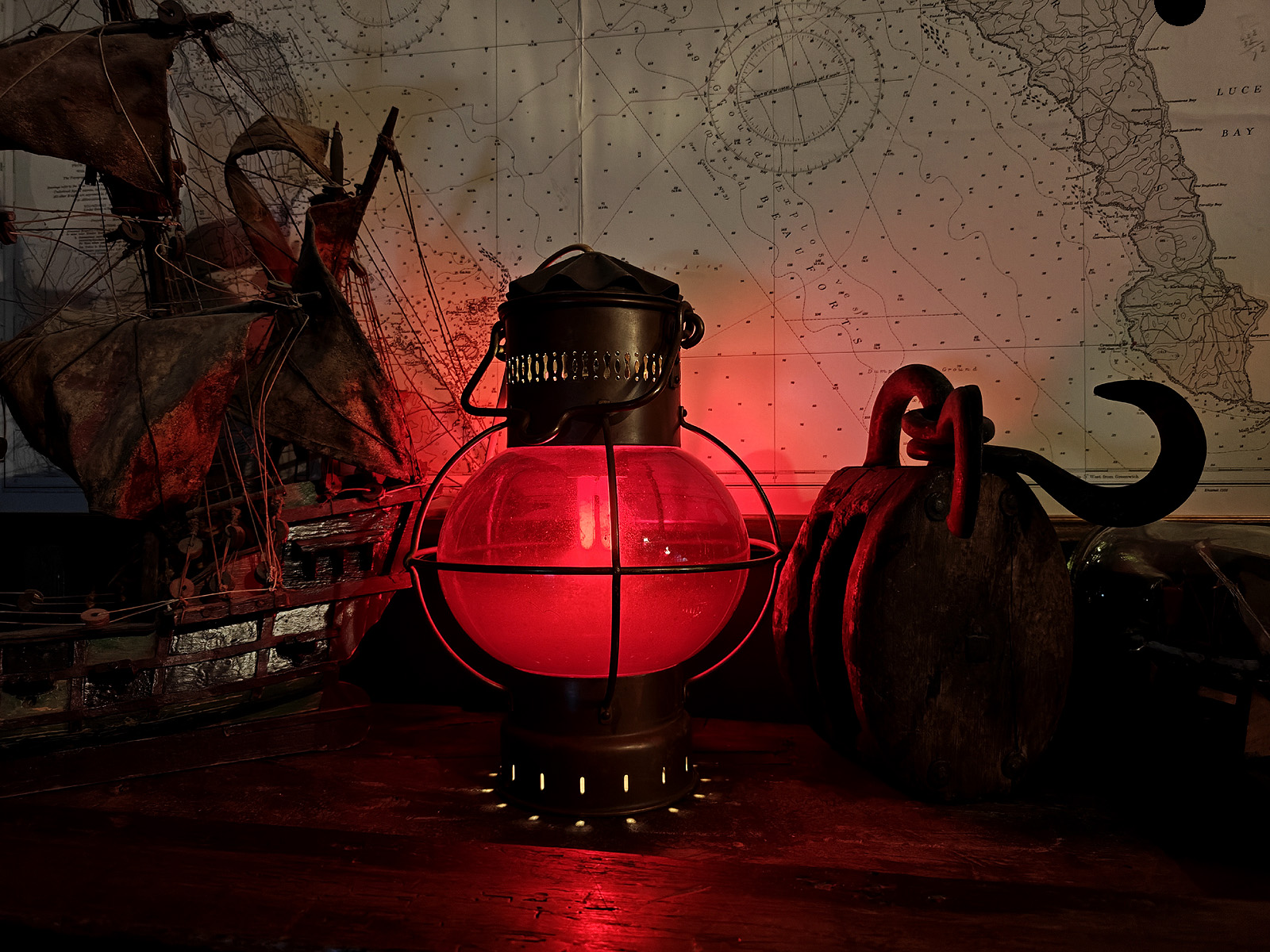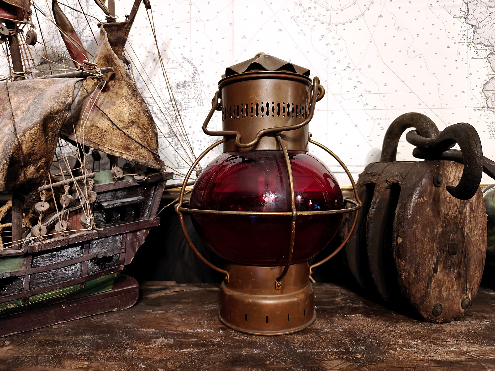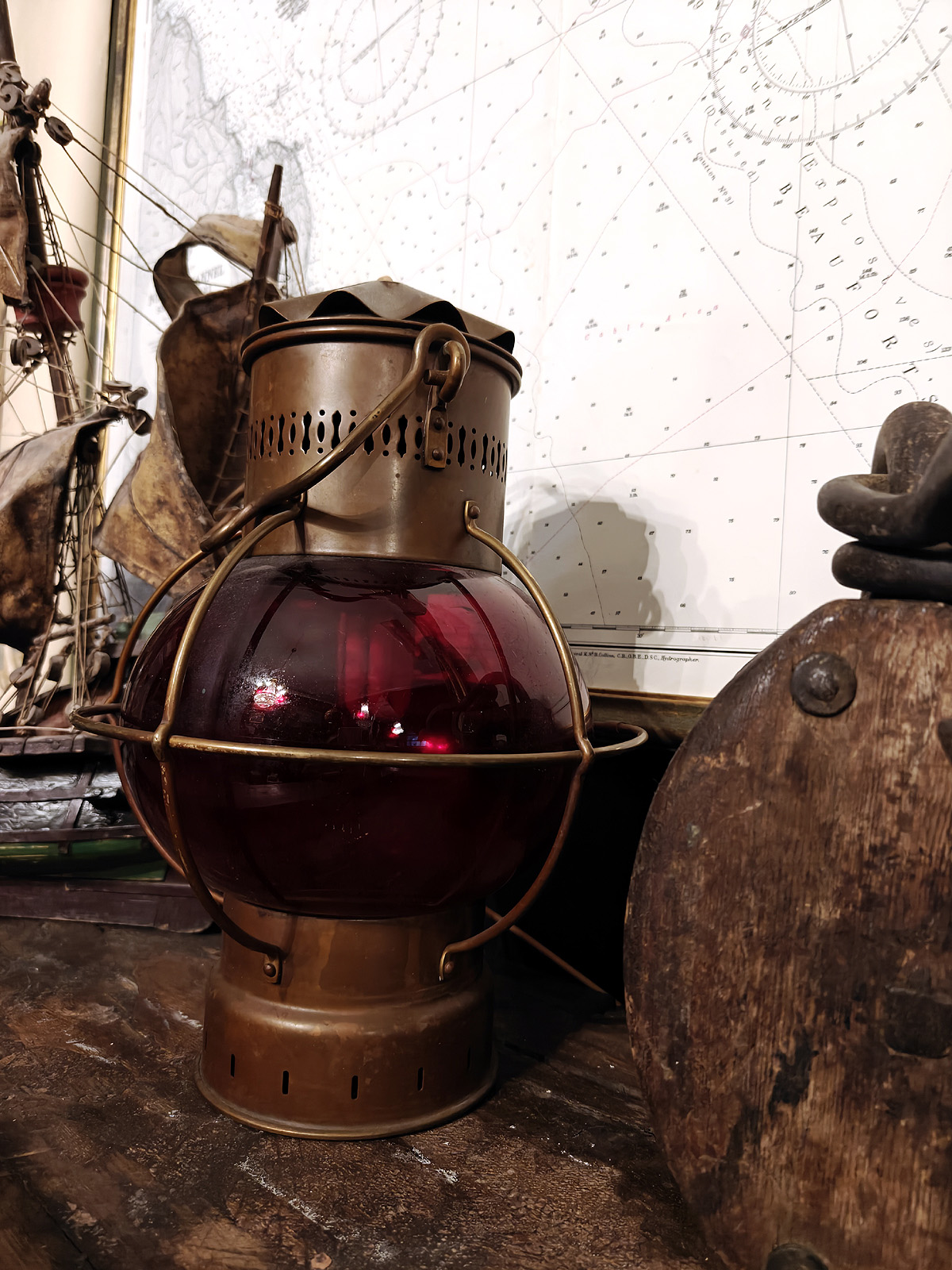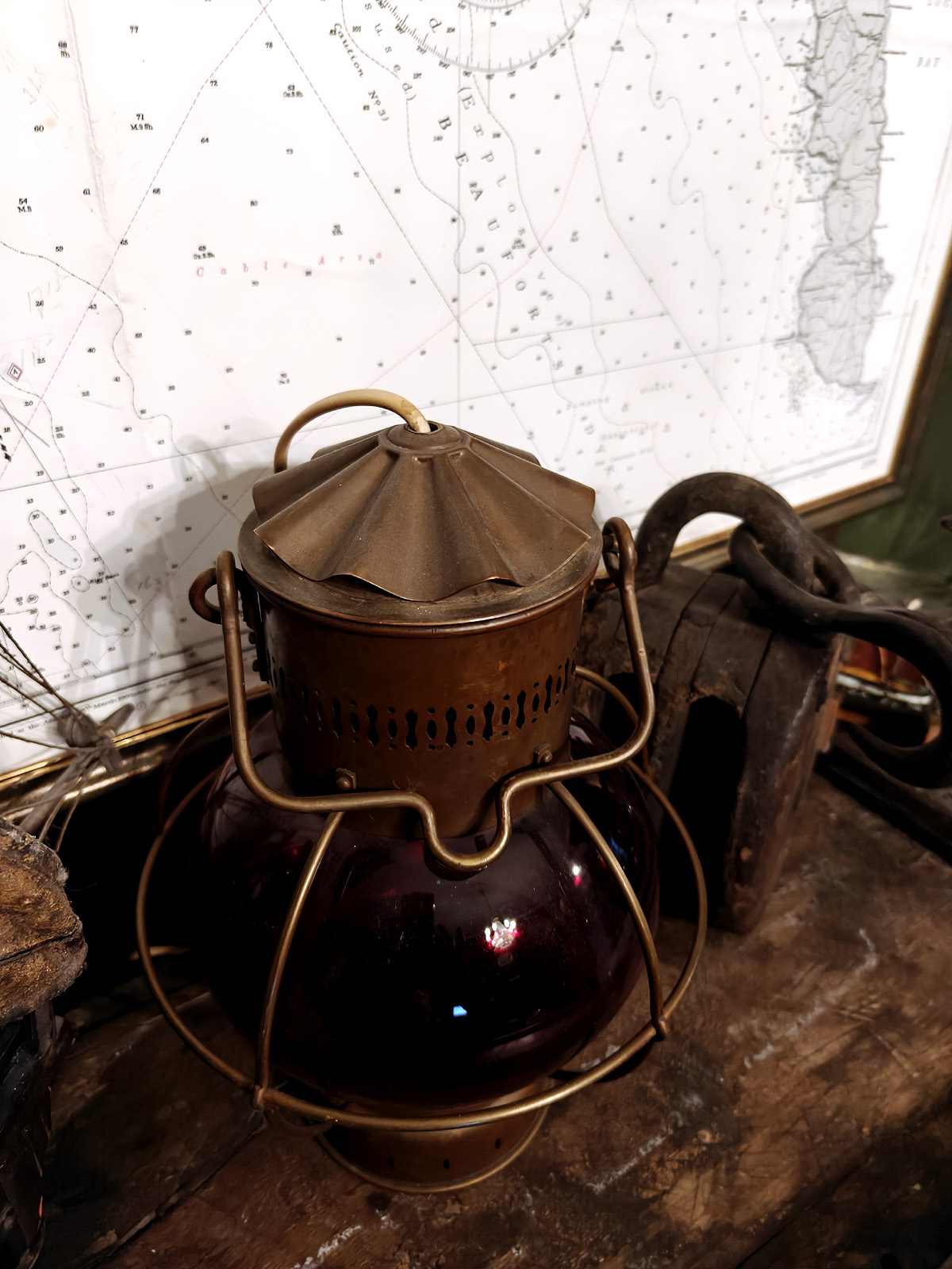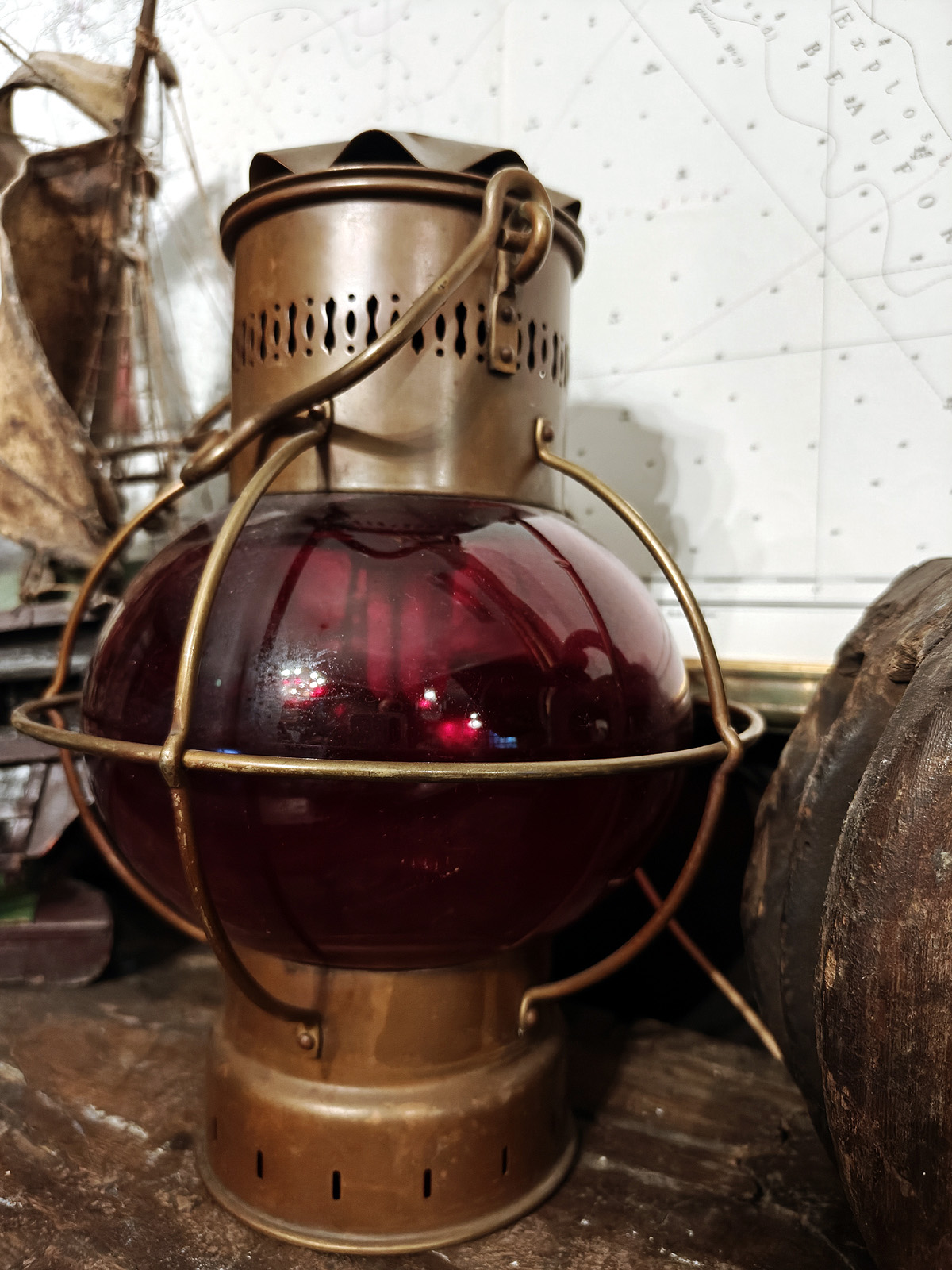 Muuta: Tämä vaikuttava merilyhty (portside-lyhty) edustaa aikansa merenkulun käytännöllistä estetiikkaa. Sen sipulinmuotoinen punainen lasikupu on klassinen piirre tuon ajan öljy ja kerosiinilyhdyistä, joita käytettiin alusten paapuurin puolen kulkuvaloina kansainvälisten navigointisääntöjen mukaisesti (punainen väri viittaa aluksen vasemman puolen navigointivaloon, oikealla puolella käytetään vihreää väriä). Punainen valo kertoi muille aluksille suunnan ja aseman, eli kyseessä yksinkertainen, mutta elintärkeä osa meriturvallisuutta.