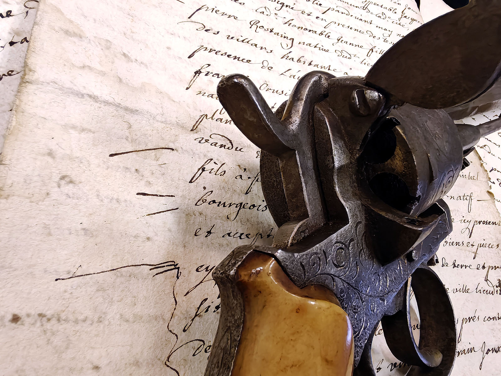 Muuta: Tämä on poikkeuksellisen hieno, harvinainen ja massiivinen yksilö, joka edustaa piikkipatruuna-aikakauden raskainta ja ylellisintä päätä. Sen 13mm kaliiperi on erittäin suuri ja harvinainen, mikä viittaa siihen, että ase on tarkoitettu mahdollisimman suureen pysäytystehoon. Aseen näyttävät ja hyvin säilyneet kahvat ovat aitoa norsunluuta (perusteena kahvojen hienovarainen syykuvio ja kellertävä patina), mikä yhdistettynä rungon ja rullan runsaisiin kukkaiskaiverruksiin viittaa varakkaan omistajan, kuten korkean upseerin, tilaustyönä valmistettuun aseeseen. Piipun selkeä rihlaus on merkki laadusta, joka myös erottaa tämän yksilön tavanomaisista massatuotantoaseista.