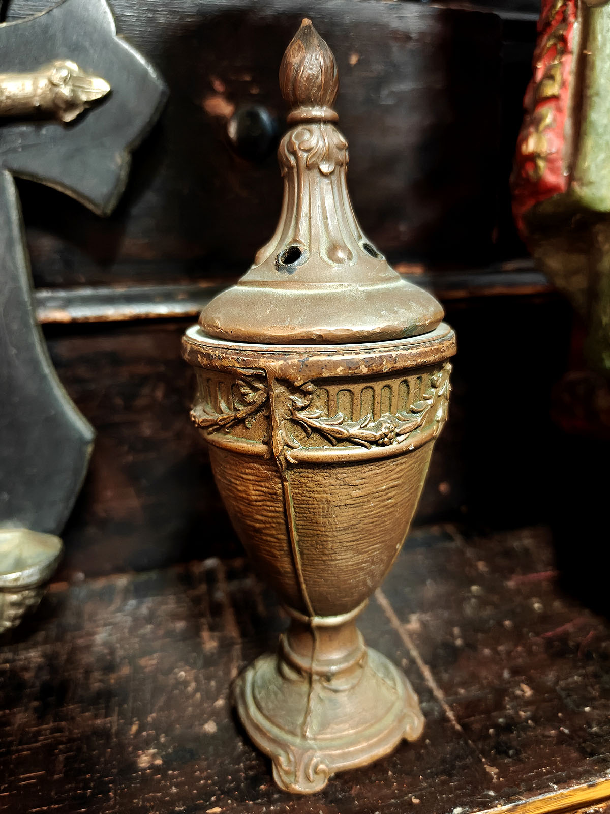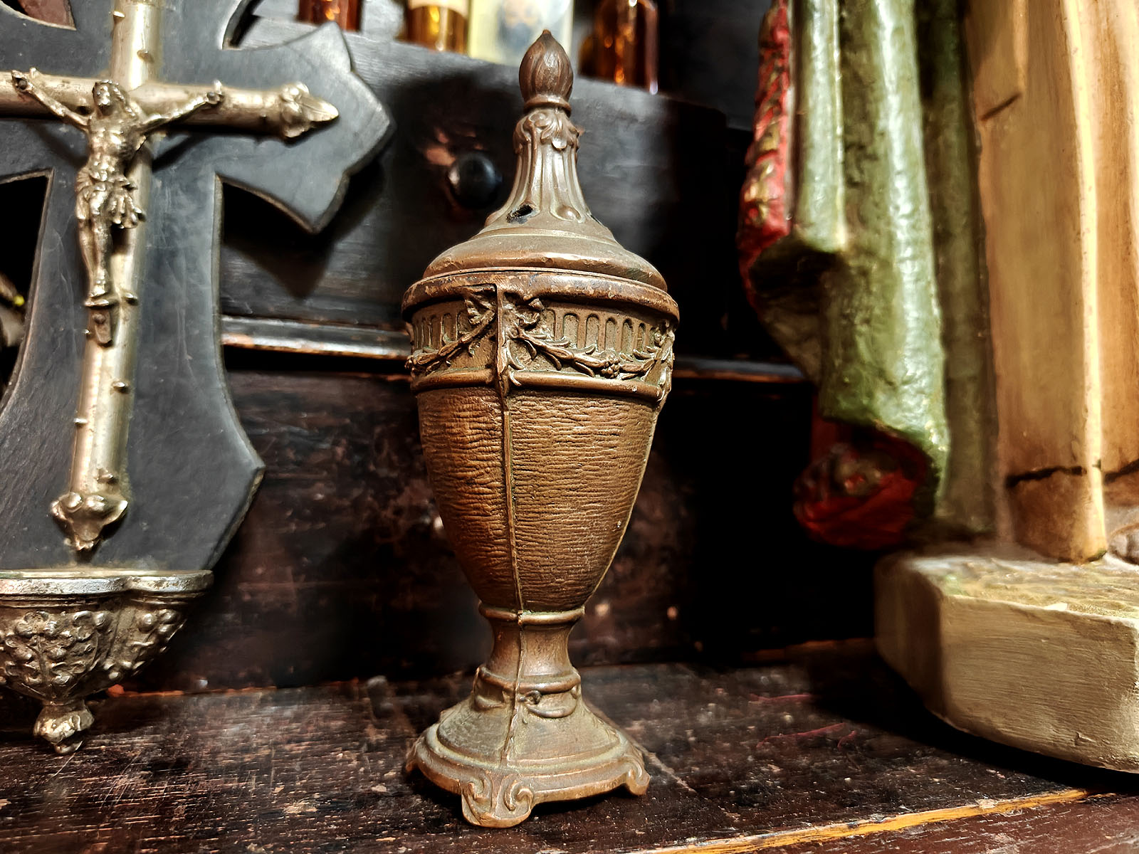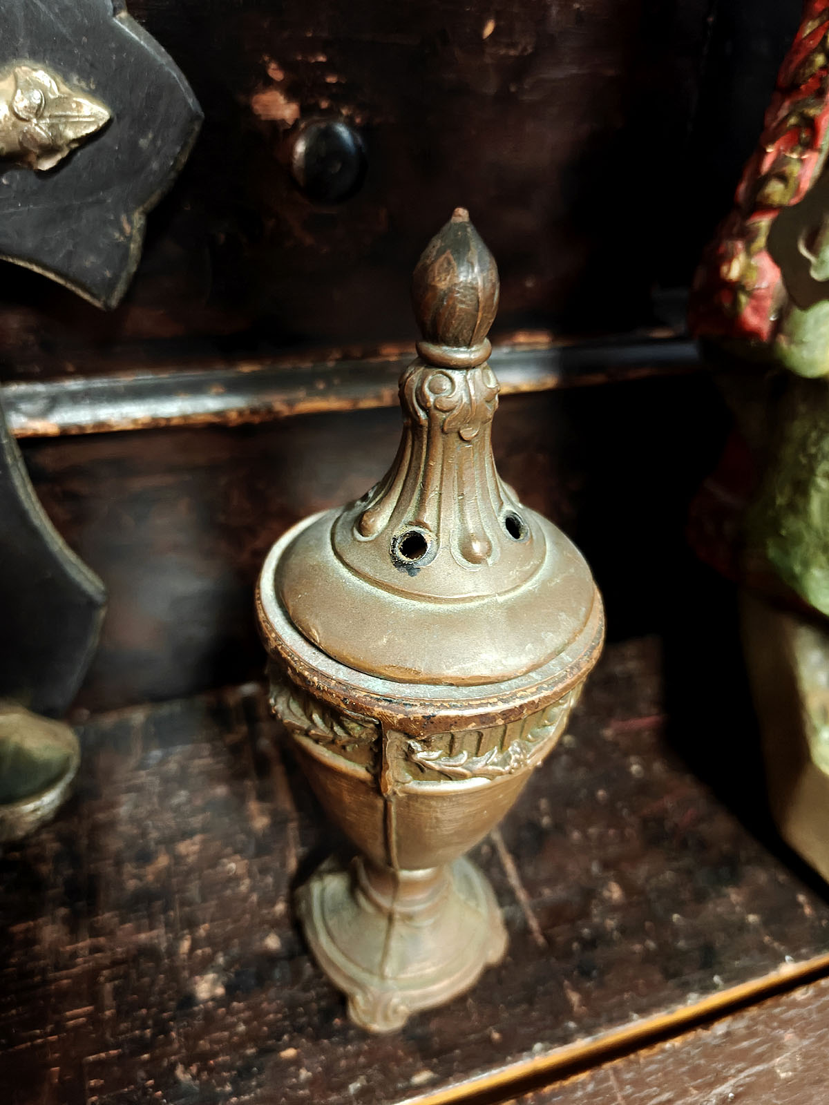 Esineen sydän on sen kuparipitoinen sisämalja, jonka pohjalle kertynyt syvä, turkoosi hapettuma kertoo tarinaa vuosisatojen aikana poltetuista pihkoista, yrteistä ja tuoksuöljyistä. Kun kansi on suljettu, sen kolme aukkoa toimivat kuin pienet savupiiput, joiden kautta lämmin ja tuoksuva savu on hitaasti täyttänyt salonkeja tai hartauskammioita. Tämä uurna ei ole vain koristeellinen pronssiteos, vaan se kantaa sisällään näkymätöntä historiaa menneiden aikojen tunnelmista, tehden siitä hätkähdyttävän lisän mihin tahansa kuriositeettikabinettiin tai historialliseen kokoelmaan.