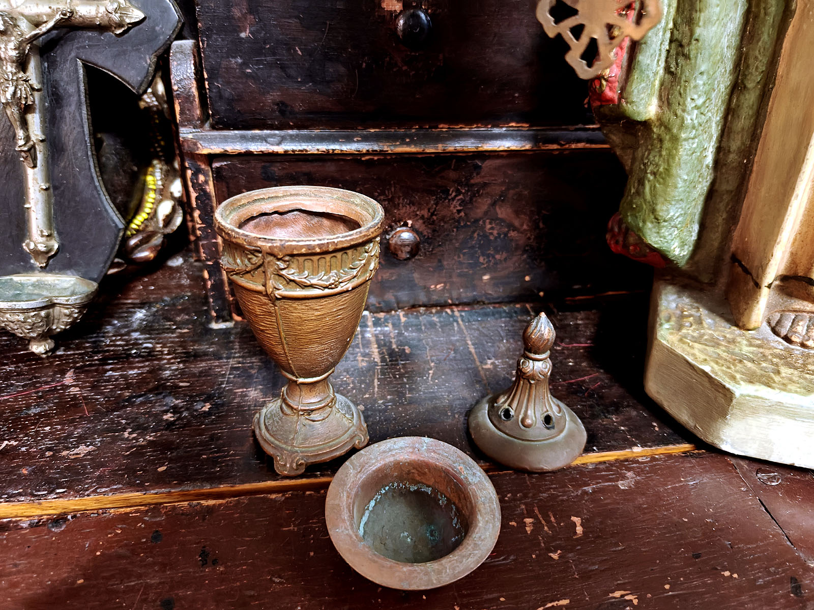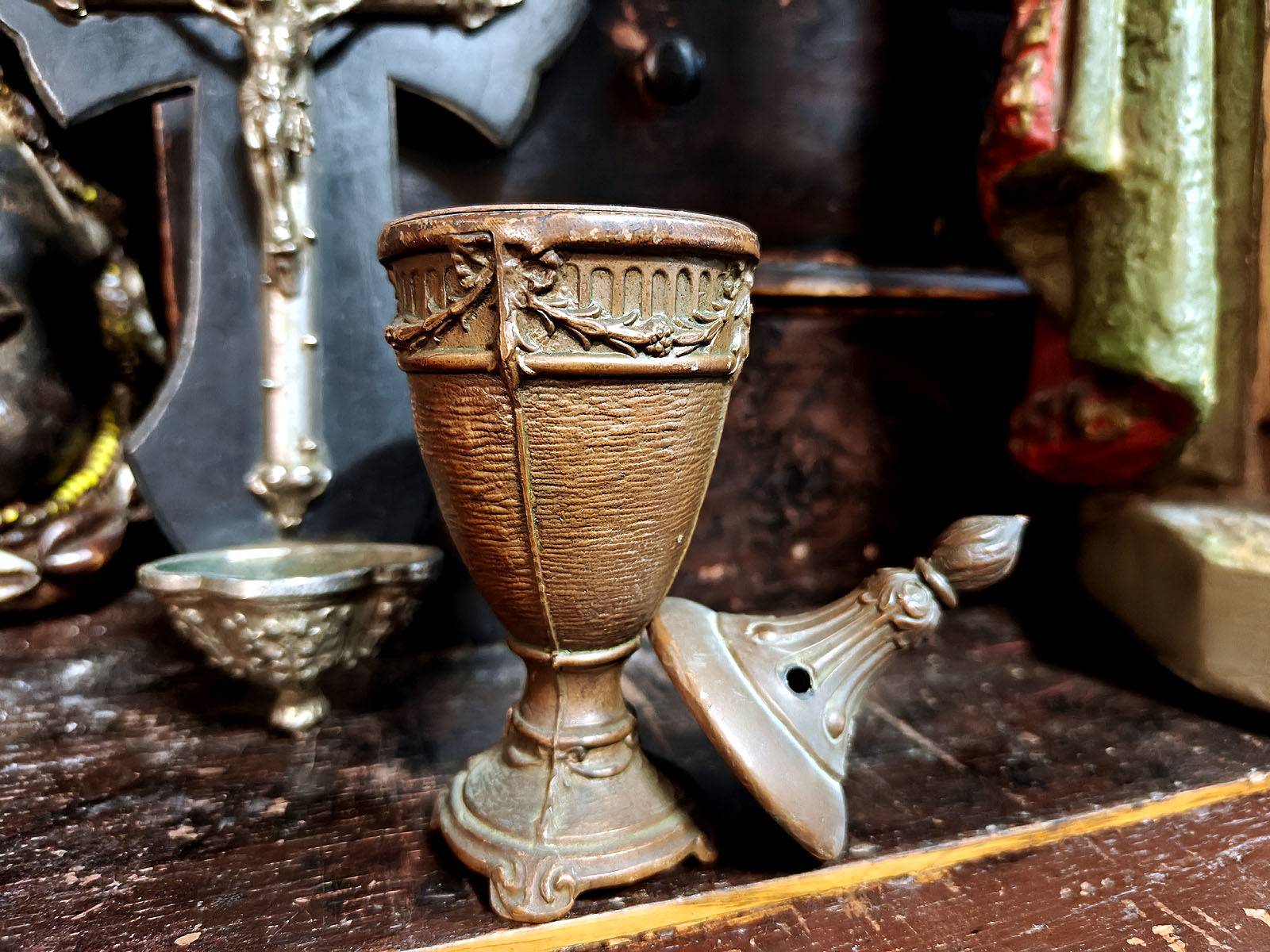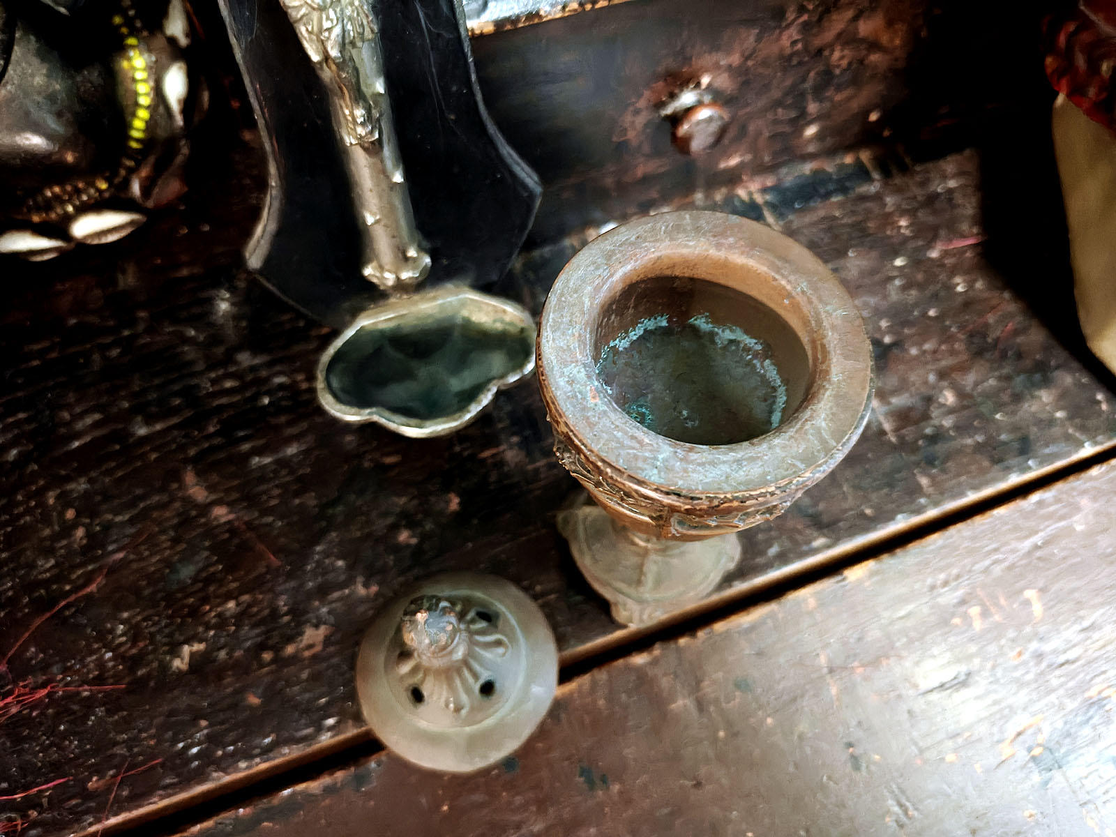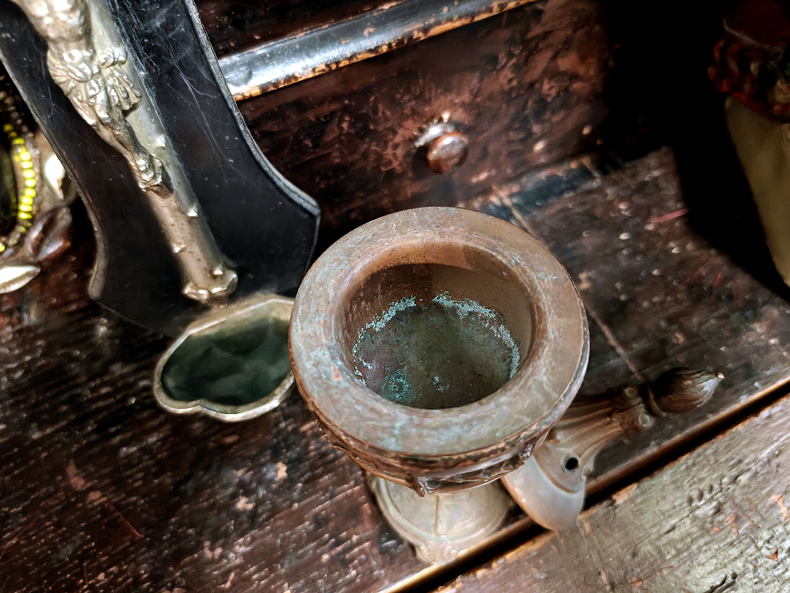Esineen sydän on sen kuparipitoinen sisämalja, jonka pohjalle kertynyt syvä, turkoosi hapettuma kertoo tarinaa vuosisatojen aikana poltetuista pihkoista, yrteistä ja tuoksuöljyistä. Kun kansi on suljettu, sen kolme aukkoa toimivat kuin pienet savupiiput, joiden kautta lämmin ja tuoksuva savu on hitaasti täyttänyt salonkeja tai hartauskammioita. Tämä uurna ei ole vain koristeellinen pronssiteos, vaan se kantaa sisällään näkymätöntä historiaa menneiden aikojen tunnelmista, tehden siitä hätkähdyttävän lisän mihin tahansa kuriositeettikabinettiin tai historialliseen kokoelmaan.