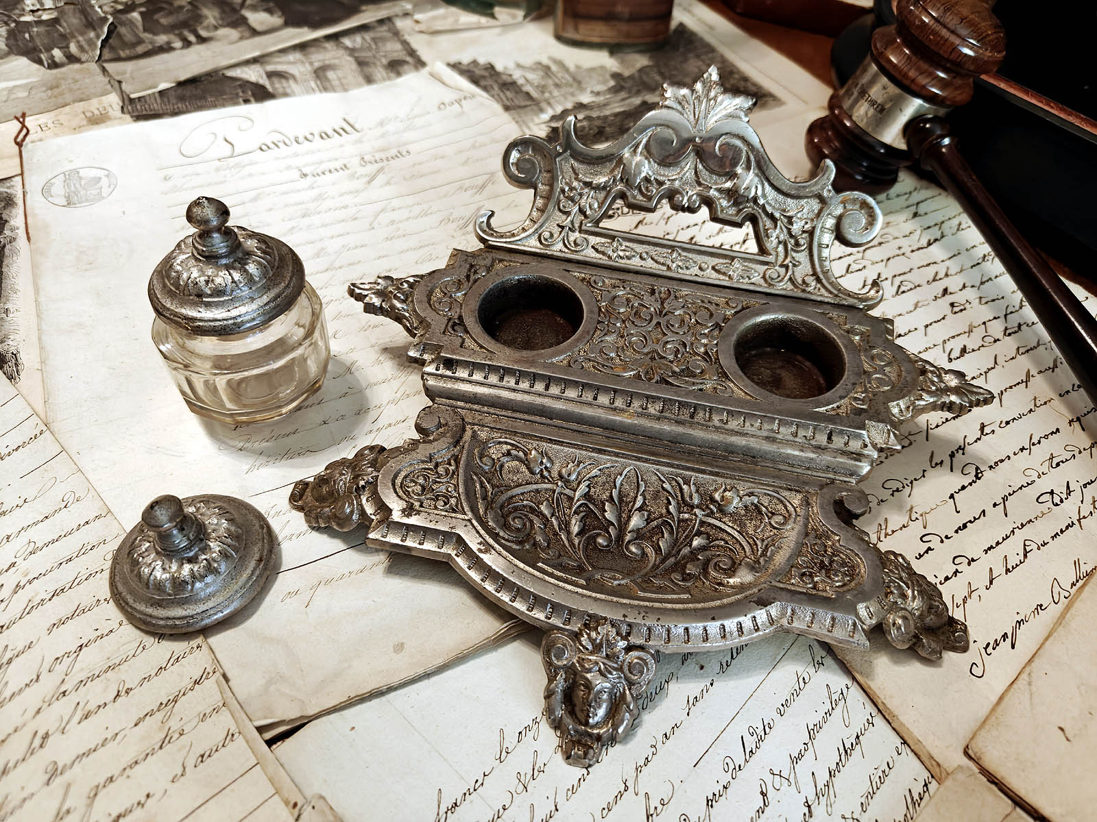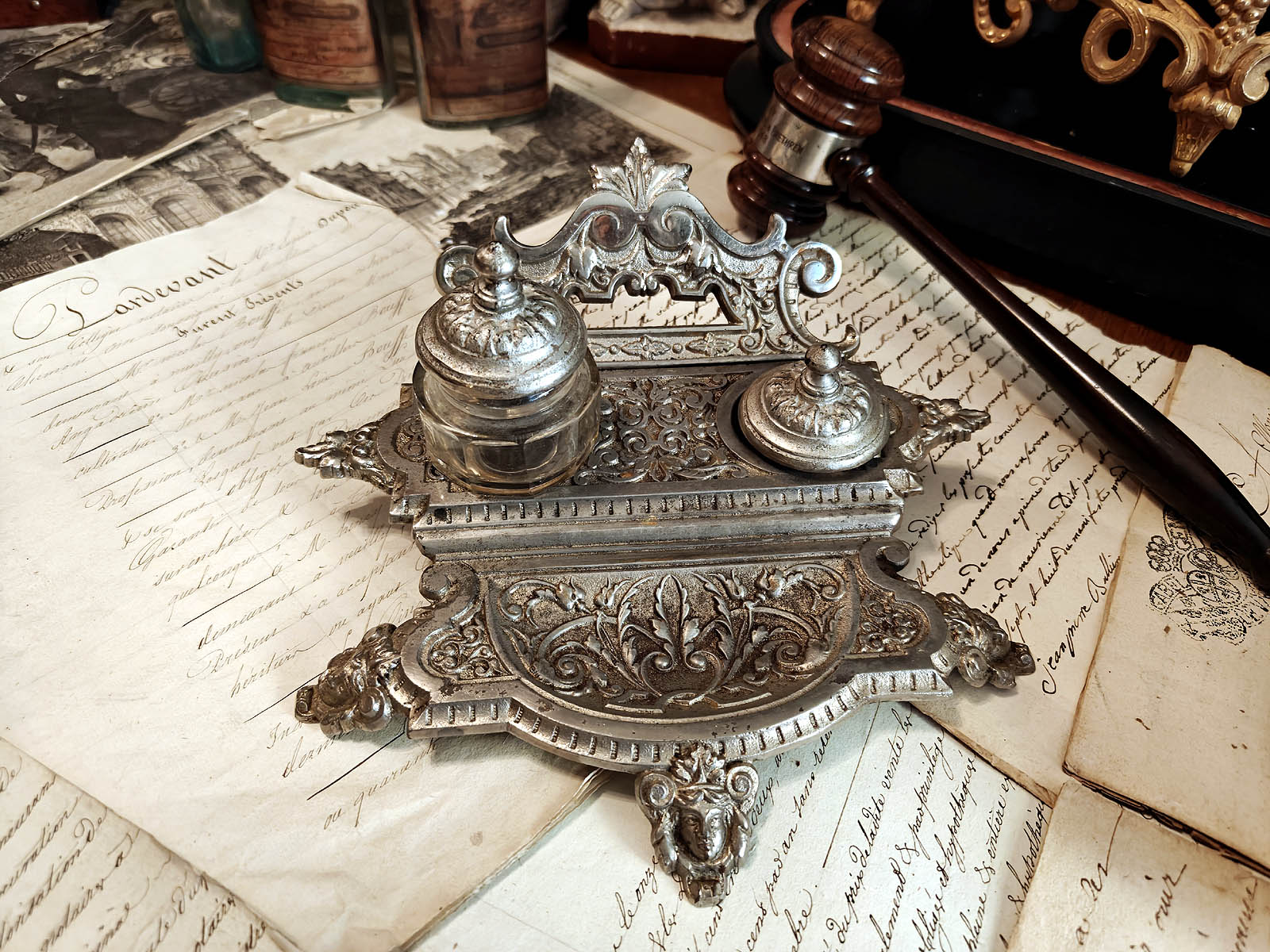 Kokonaisuus sisältää yhden kristalli- tai lasiastian hopeoidulla kannella ja yhden ns. kokometallisen musteastian, joka on tyypillinen viranomais- ja notaarikäytössä. Telineen etuosan kouru on tarkoitettu kynille ja sen runsas valukoristelu (kuten voluutit ja kukkaornamentit) heijastavat jugend‑tyylin vaikutteita, joita WMF ja muut saksalaiset valmistajat suosivat 1900‑luvun alussa. Pohjan numeroleima 4418 on mallinumero, jota käytettiin suurten metallitehtaiden tuoteluetteloissa. Tämä mustepulloteline ei ole ollut vain pelkkä koriste, vaan se on ollut aktiivisessa käytössä, jonka kautta on laadittu kirjeitä, sopimuksia ja virallisia asiakirjoja. Pohjan kulunut pinta ja metallin pehmeä patina kertovat esineen pitkästä elämästä ja siitä, että se on palvellut useita omistajia vuosikymmenten ajan. Upea ja näyttävä esine!