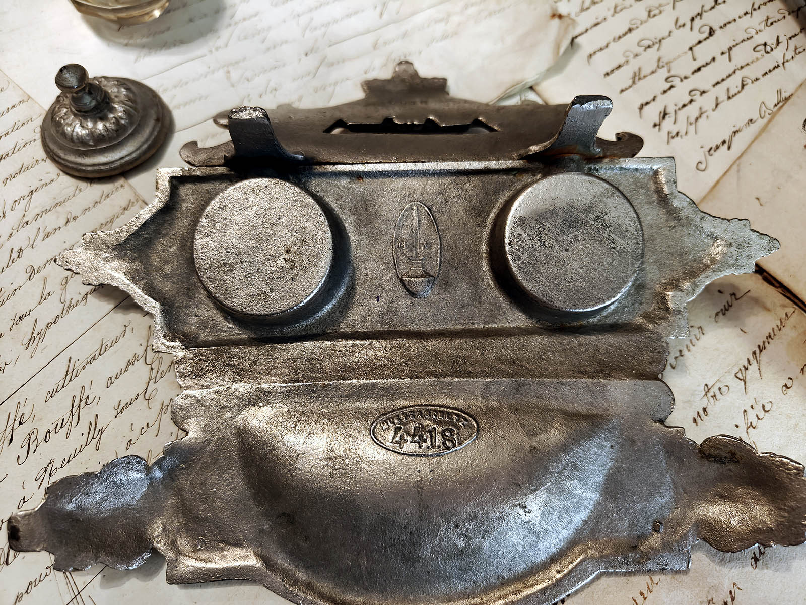 Muuta: Tämä upea ja aidosti vanha mustepulloteline edustaa aikakautensa kodin hienostunutta luksusta: esineitä, jotka loivat hopeaesineiden arvokkaan ilmeen, mutta olivat silti saavutettavissa tavallisille kotitalouksille. Runko on valettu ilmeisesti uushopeasta (alpakasta) tai Britannia‑metallista, jotka pinnoitettiin ohuella hopeakerroksella sähkökemiallisesti. Ajan myötä hopeointi on kulunut, paljastaen alta harmahtavan perusmetallin ja luoden kauniin, epätasaisen antiikkihopeisen patinan.