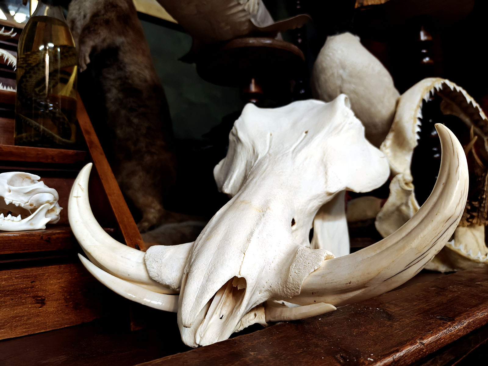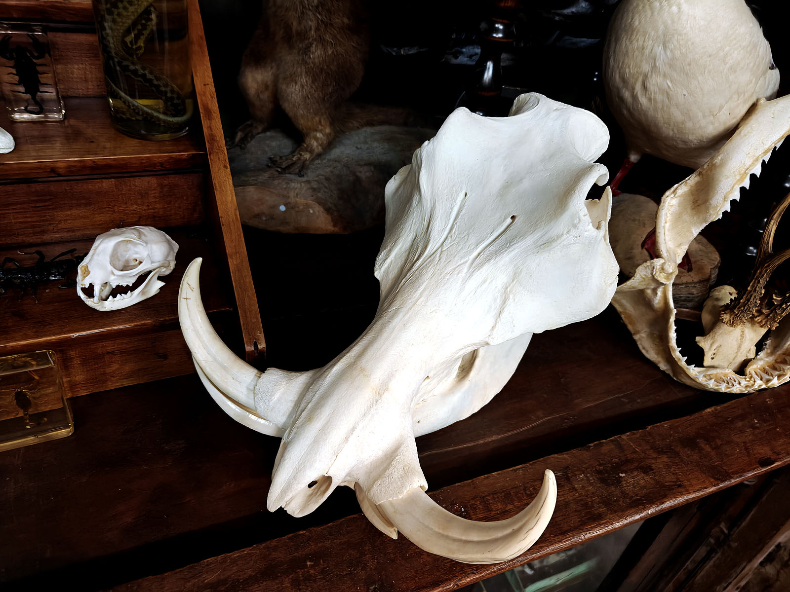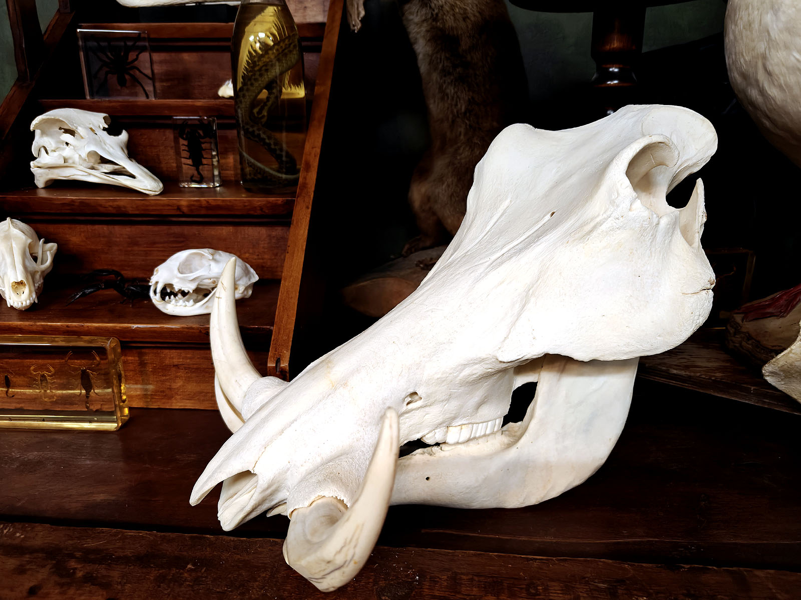 Muuta: Tämä äärimmäisen vaikuttava pahansian kallo on erinomainen esimerkki afrikkalaisen savannin suurista kasvinsyöjistä, joiden anatomia on kehittynyt ravinnonhankinnan ja puolustautumisen tarpeisiin. Urokselle tyypilliset massiiviset, kaarevat syöksyhampaat hallitsevat kallon profiilia. Ne voivat kasvaa jopa 60 senttimetrin mittaisiksi ja niiden tehtävänä on ollut mahdollistaa kaivaminen, sekä antaa paras mahdollinen taisteluväline urosten välisissä yhteenotoissa.