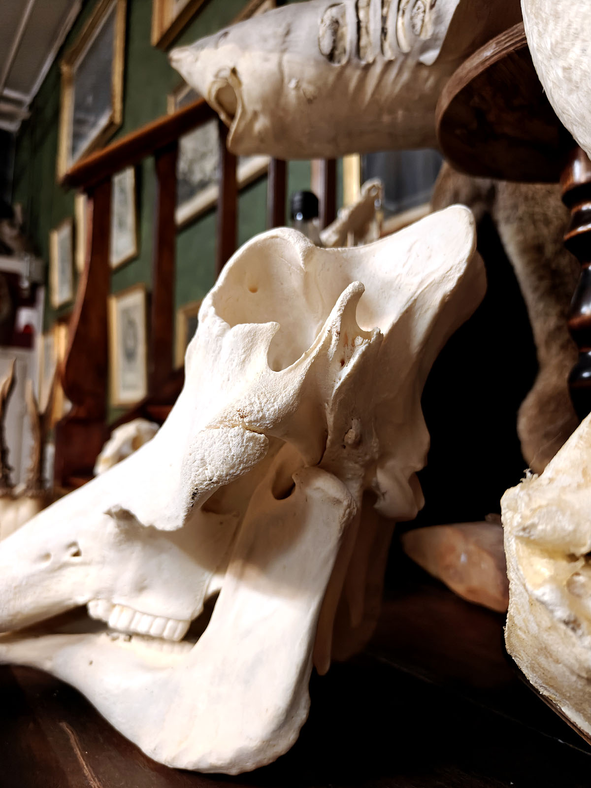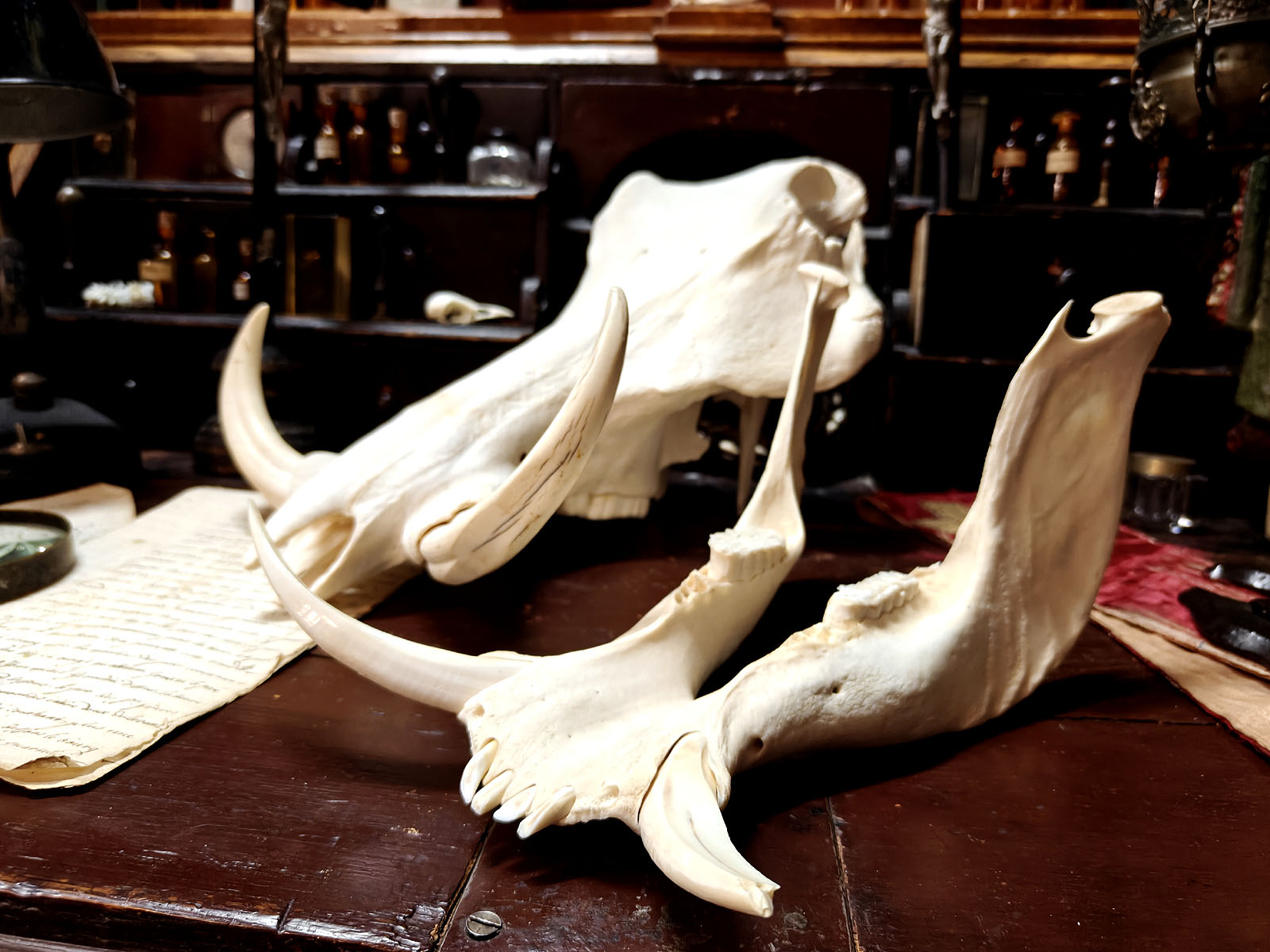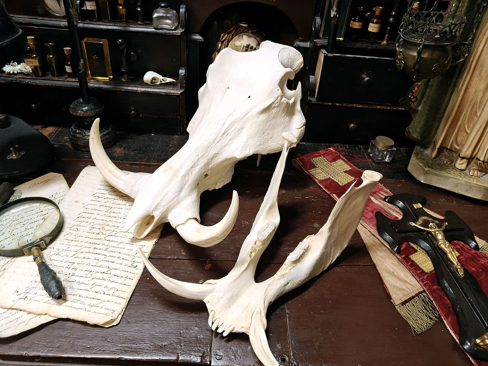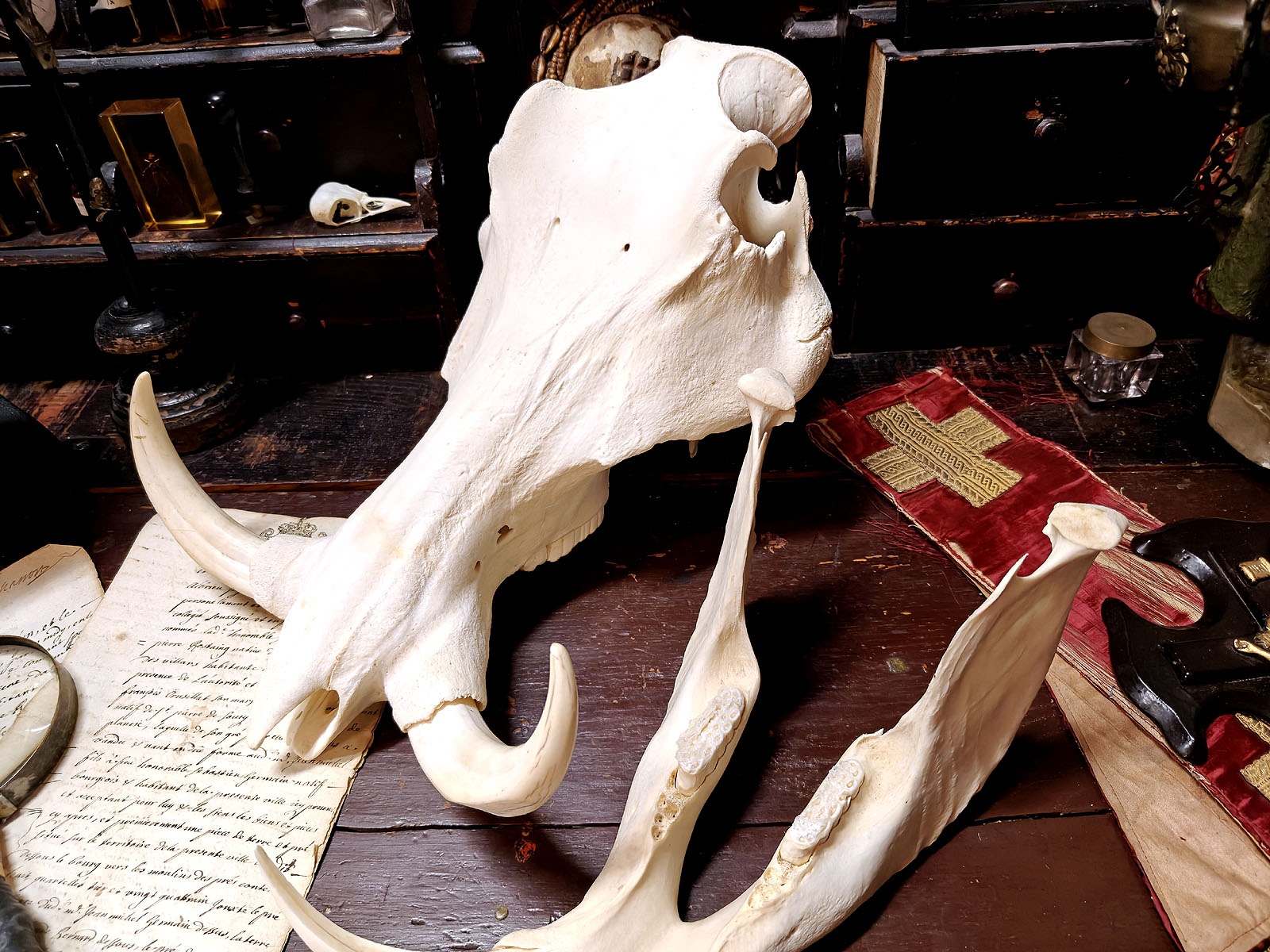 Muuta: Tämä äärimmäisen vaikuttava pahansian kallo on erinomainen esimerkki afrikkalaisen savannin suurista kasvinsyöjistä, joiden anatomia on kehittynyt ravinnonhankinnan ja puolustautumisen tarpeisiin. Urokselle tyypilliset massiiviset, kaarevat syöksyhampaat hallitsevat kallon profiilia. Ne voivat kasvaa jopa 60 senttimetrin mittaisiksi ja niiden tehtävänä on ollut mahdollistaa kaivaminen, sekä antaa paras mahdollinen taisteluväline urosten välisissä yhteenotoissa.