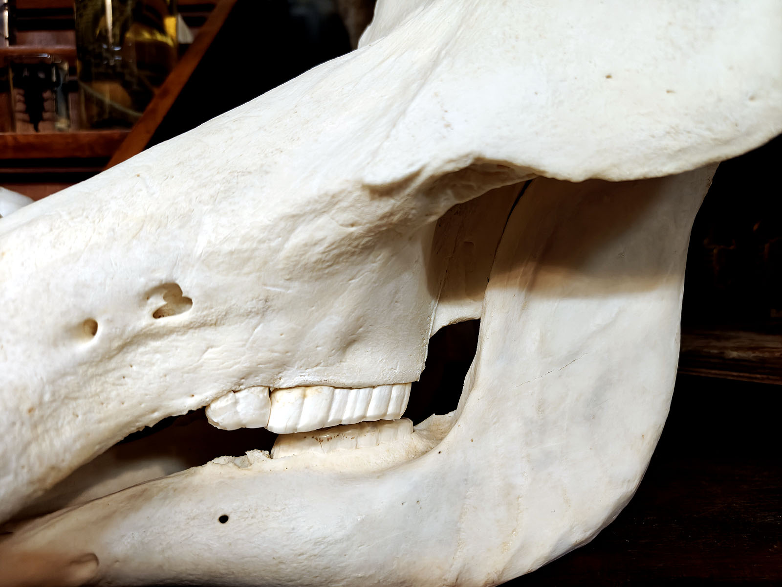 Kallon rakenteessa näkyy selvästi lajin evolutiivinen erikoistuminen. Ylä- ja alakulmahampaiden välinen jatkuva hankaus pitää hampaat terävinä ja toimivina. Hampaissa on niin sanottu “itseteroittuva” mekanismi, joka on yksi pahansian tunnetuimmista biologisista piirteistä. Silmäkuoppien sijainti kallon takaosassa kertoo lajin laajasta näkökentästä, joka on ollut elintärkeä avoimilla savanneilla, missä petojen havaitseminen ajoissa on ratkaisevaa. Kallon muoto, leveä otsa ja voimakas poskiluu viittaavat täysikasvuiseen urokseen. Hampaiden kulumisen perusteella yksilö on elänyt aikuisikään asti ja käyttänyt hampaitaan aktiivisesti. Tämä on merkki luonnonmukaisesta elämästä, jossa ravinto on ollut karkeaa ja hiekkapitoista.