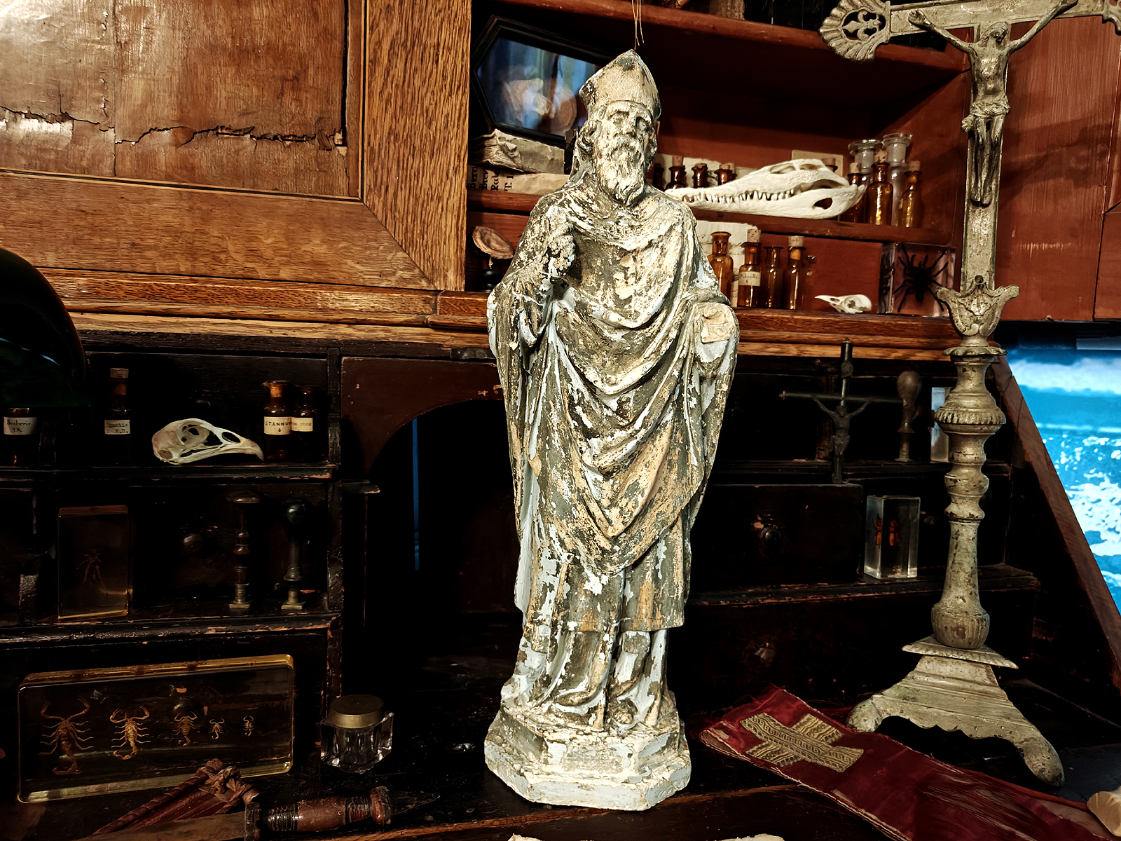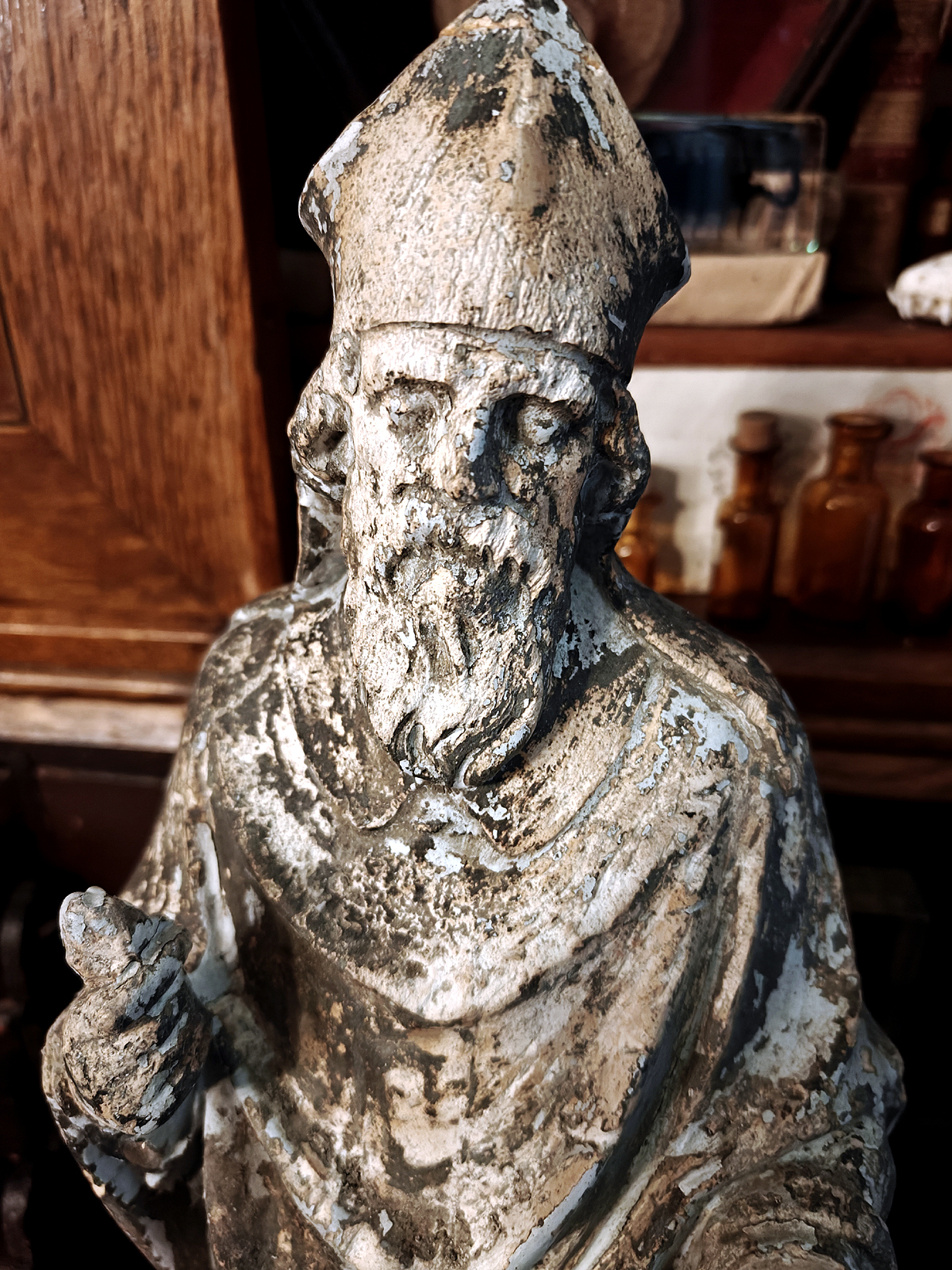 Muuta: Tämä poikkeuksellisen harvinainen ns. piispanveistos on peräisin 1800-luvun alkupuolelta ja se on ollut esillä Liègen Saint Lambertin kirkossa, mikä tekee siitä varsin merkittävän liturgisen esineen. Veistos edustaa tuon kyseisen aikakauden uskonnollista kuvanveistoa, jossa kaikki yksityiskohdat (esim. piispan mitra, kasvonpiirteet ja liturginen asu) on saatu hienosti veistokseen mukaan. Tällaiset kappaleet olivat osa kirkkojen hengellistä symboliikkaa, jolloin nämä pyhimykset ja piispahahmot toimivat esikuvina ja suojelijoina.