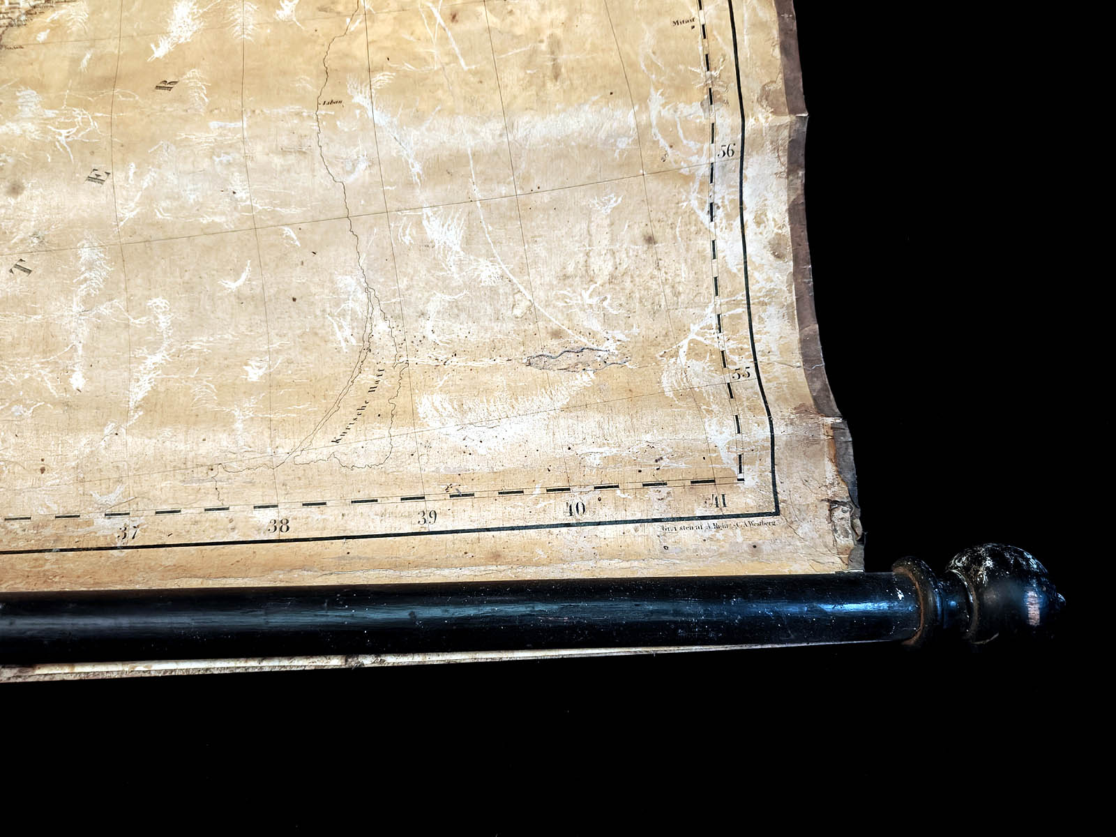 Kunto: Kohtalainen, haalistumia, repeämiä ja kulumaa, jotka ovat tyypillisiä 1800‑luvun opetuskartoille