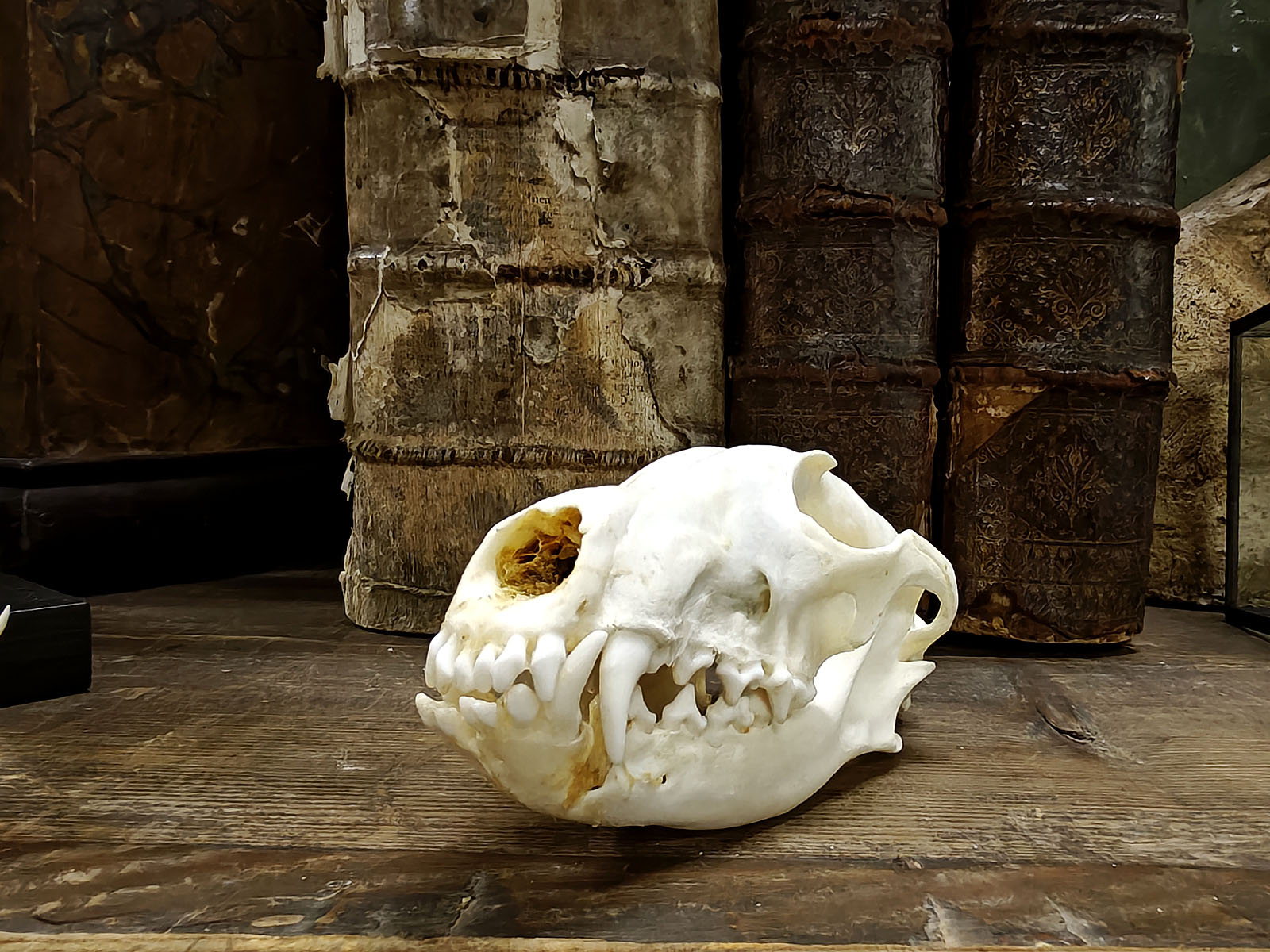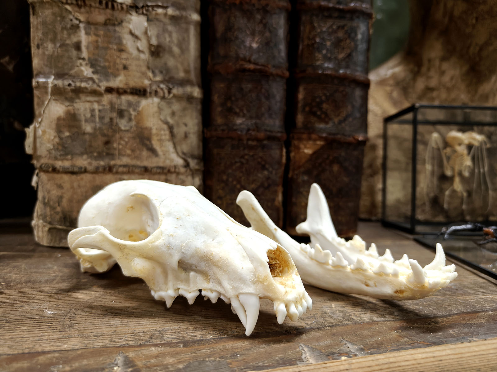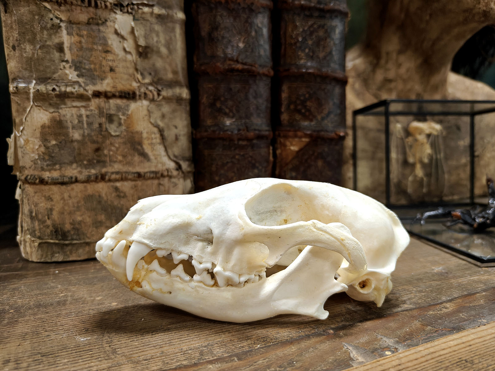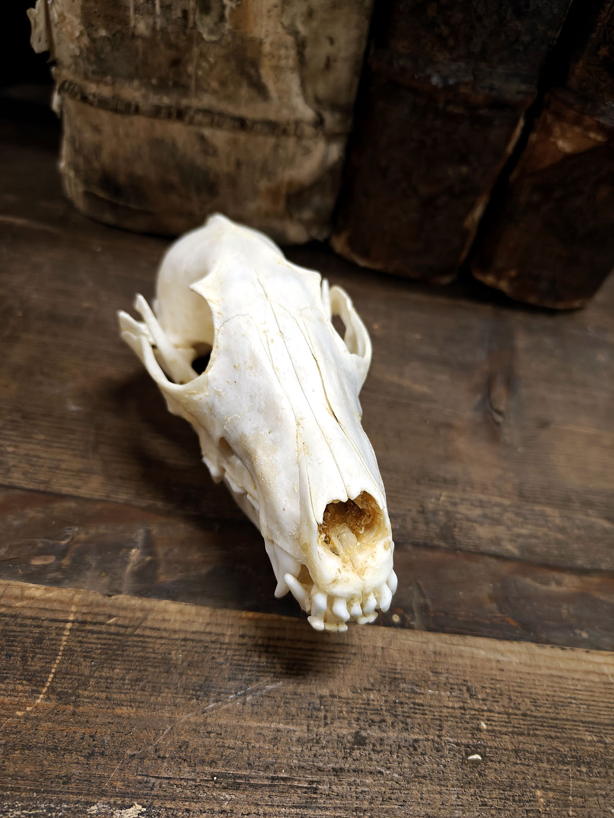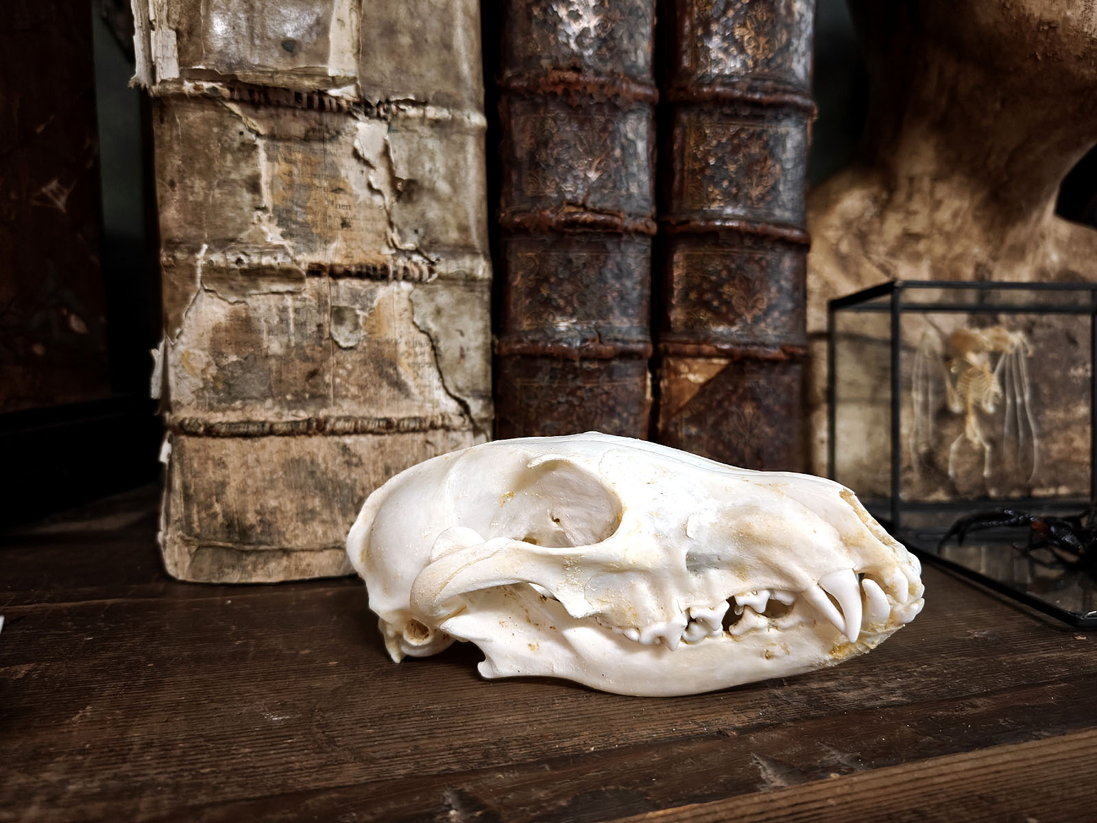 Ketun hampaat soveltuvat saaliin tappamiseen ja kasvien sekä hyönteisten käsittelyyn, mikä tekee siitä ekologisesti joustavan lajin. Kallon muoto on myös esteettisesti kiinnostava — symmetrinen, kompakti ja evoluution viimeisen päälle hioma. Meidän hyllyssä tämä kallo toimii luonnonhistorian ja eläinanatomian klassikkona. Täydellinen kohde esim. kallokokoelmaan tai vaikkapa ns. biologiseen esillepanoon!