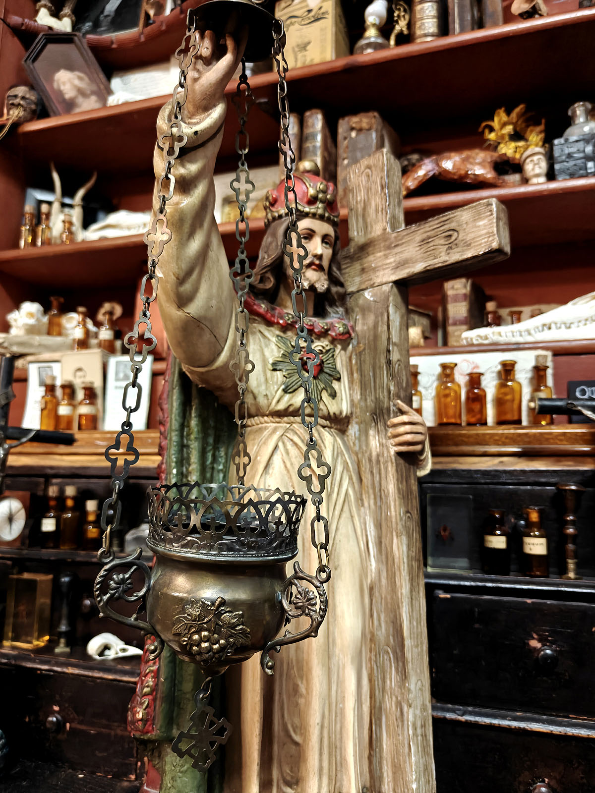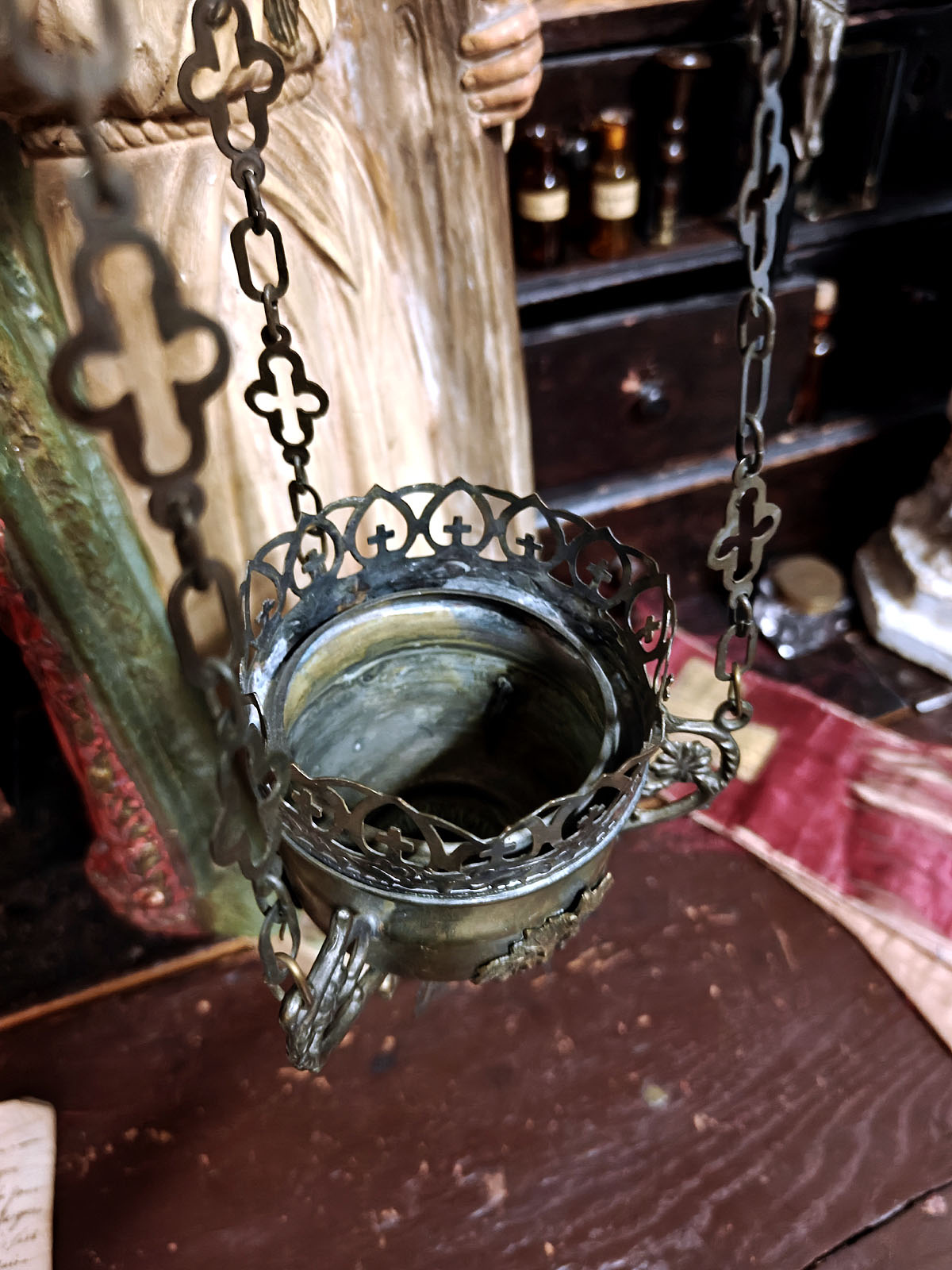 Muuta: Tämä upea ranskalainen pyhäkkölamppu (sanctuary lamp” on valmistettu pronssista 1900-luvun alussa ja edustaa hienosti perinteistä kristillistä hartausestetiikkaa, jossa muoto, symboliikka ja käyttötarkoitus kietoutuvat toisiinsa. Vaikka sen ulkoinen hahmo muistuttaa suitsutusastiaa, rakenteen avoimuus, kiinteä ripustus ja kuppimainen yläosa osoittavat sen olevan nimenomaan pyhäkkölamppu. Lampukka on siis jatkuva valon lähde, joka merkitsee Kristuksen läsnäoloa alttarilla tai pyhäkön edessä. Tällaiset lampukat ovat olleet osa kirkollista sisustusta vuosisatojen ajan ja niiden tehtävä on ollut yhtä aikaa käytännöllinen ja teologinen.