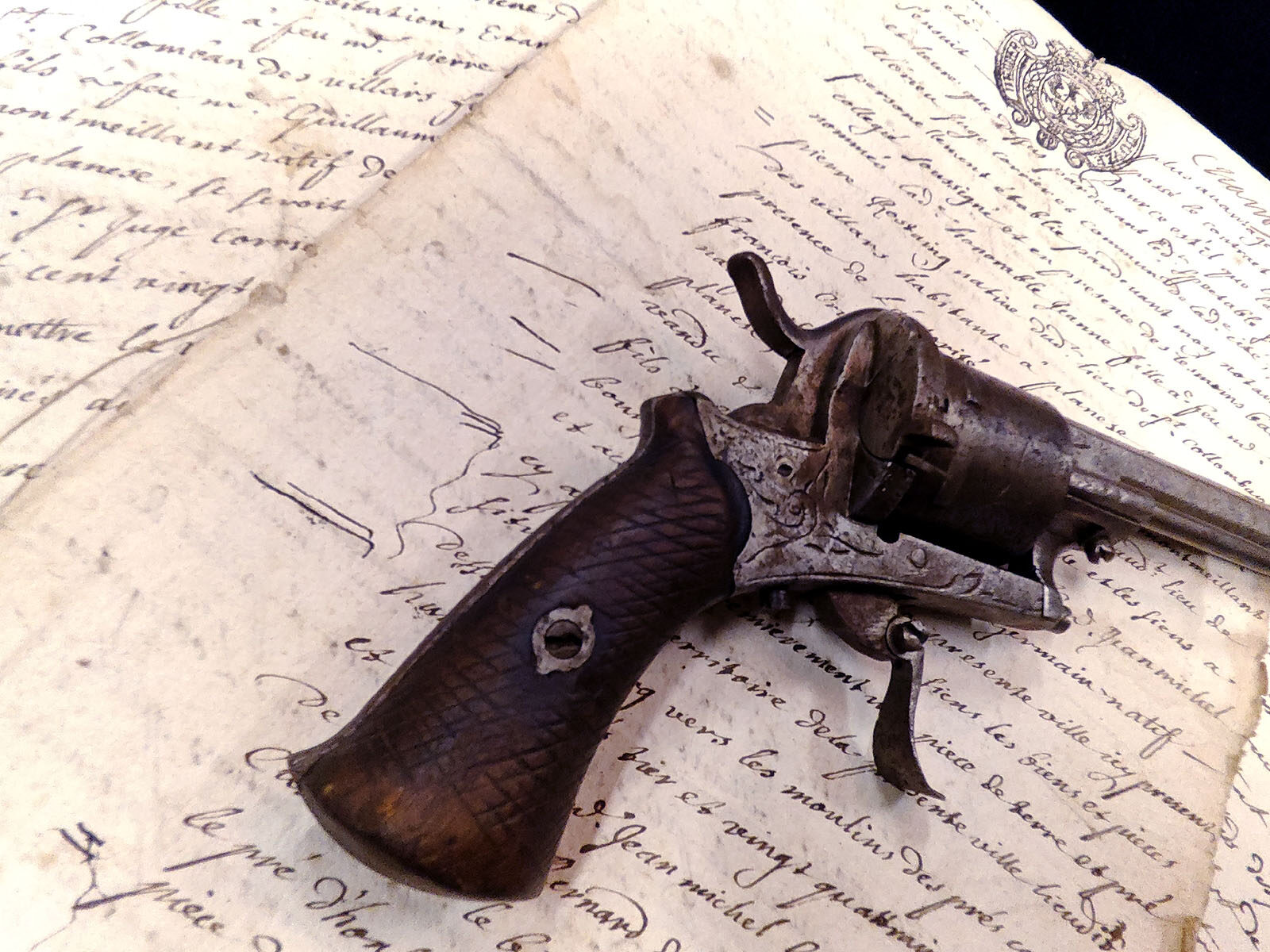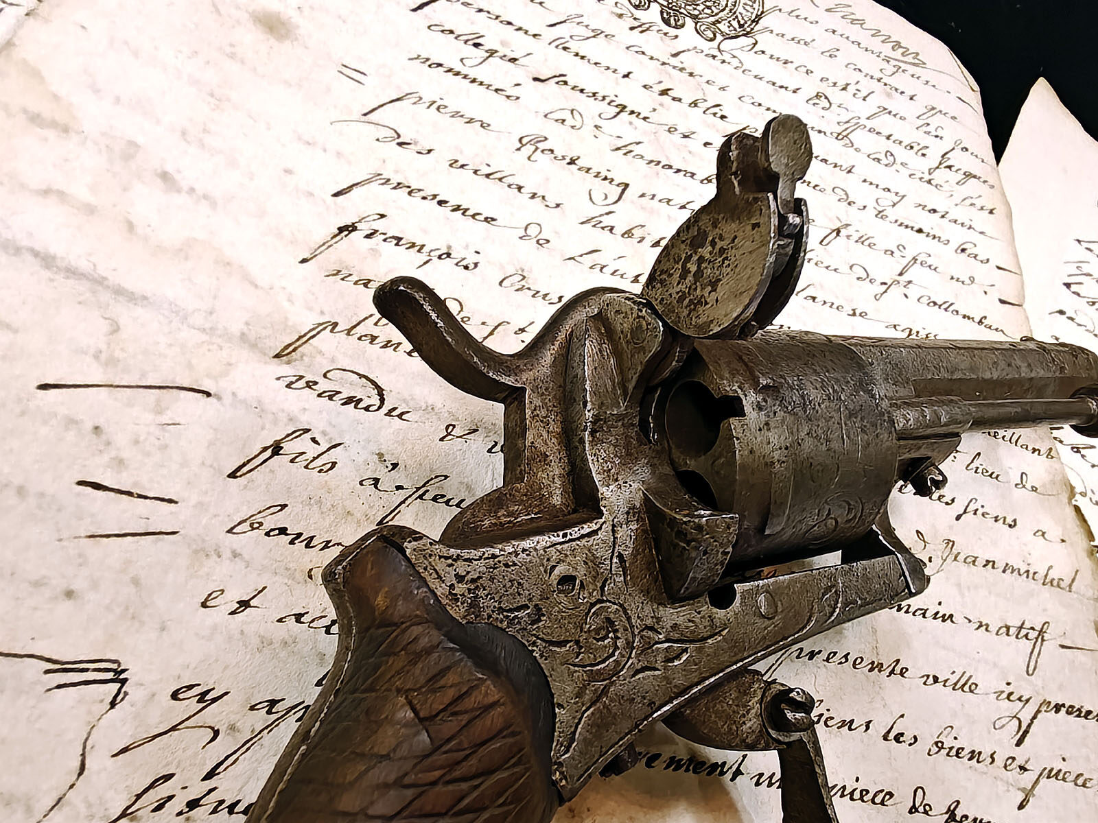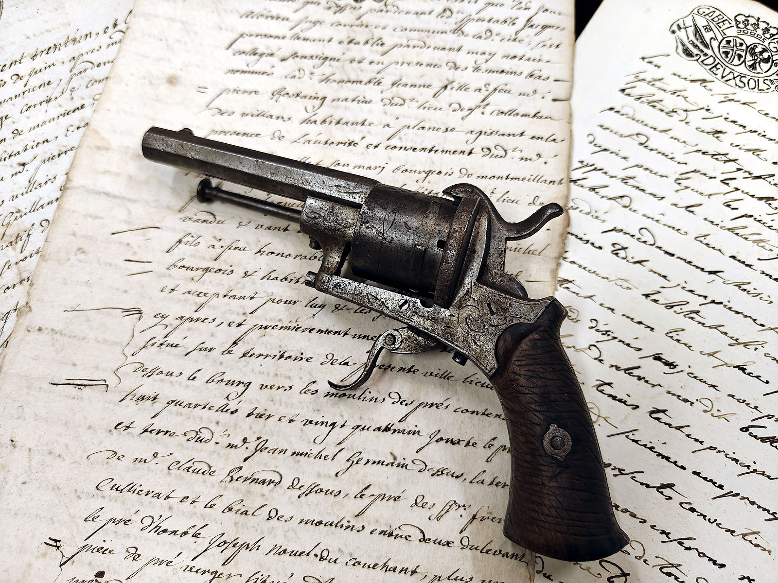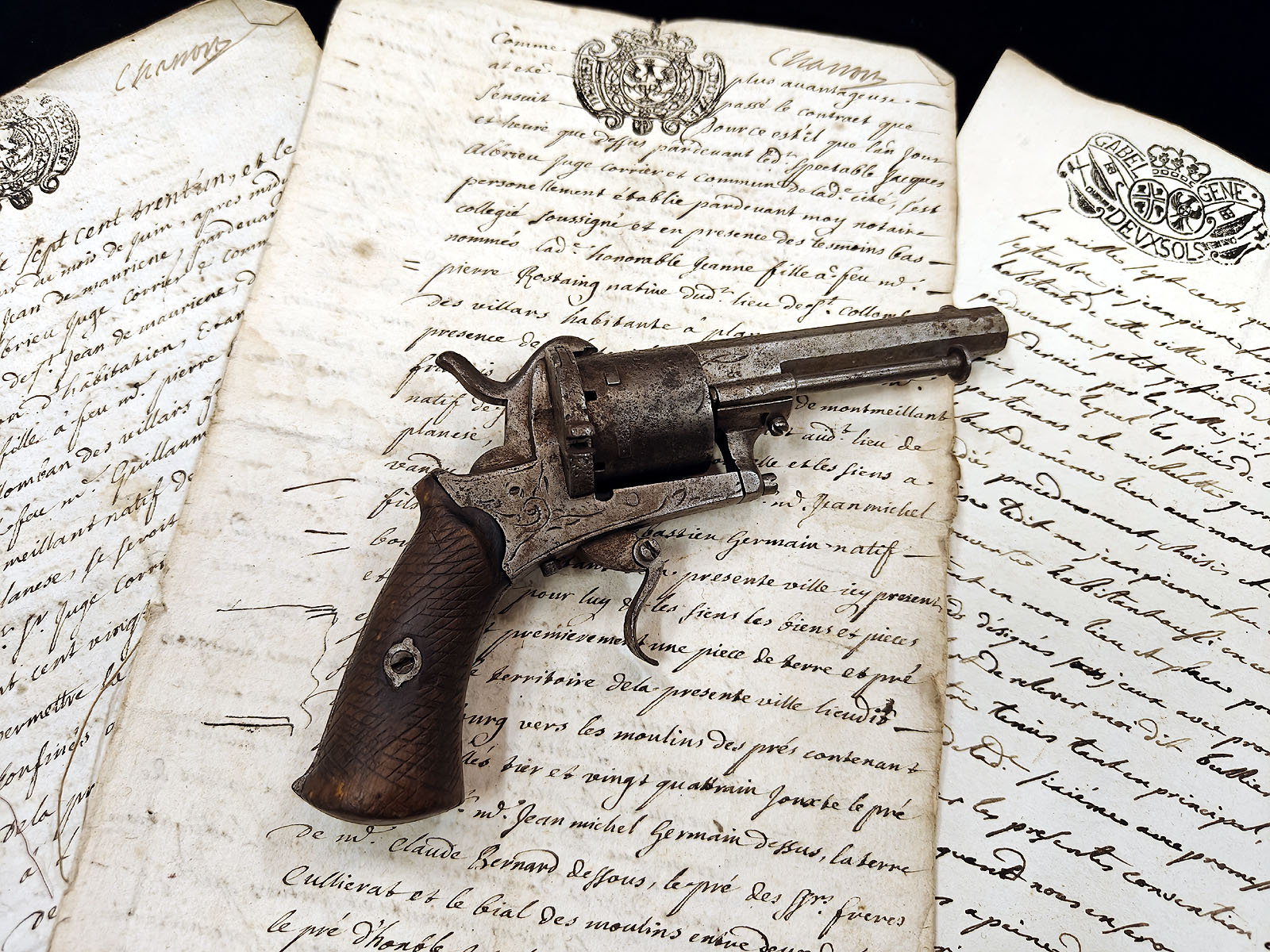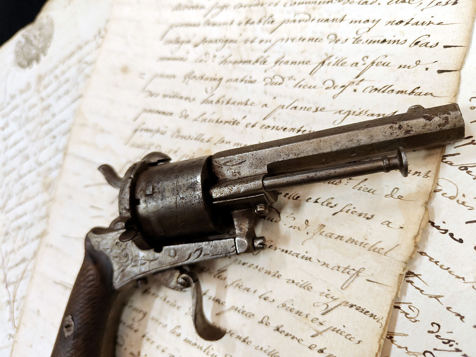 Muuta: Tämä 18-senttinen piikkipatruunarevolveri on näyttävä esimerkki 1800-luvun puolivälin siviiliaseista. Vaikka aseesta puuttuvat valmistajan leimat, sen runkoon ja rullaan tehdyt sirot kaiverrukset sekä kahvan muotoilu viittaavat vahvasti belgialaiseen käsityöhön, jota vietiin laajasti ympäri Eurooppaa 1860-luvulla. Ase edustaa klassista Lefaucheux-järjestelmää, joka oli ensimmäinen laajalle levinnyt metallipatruunaa hyödyntävä keksintö.
