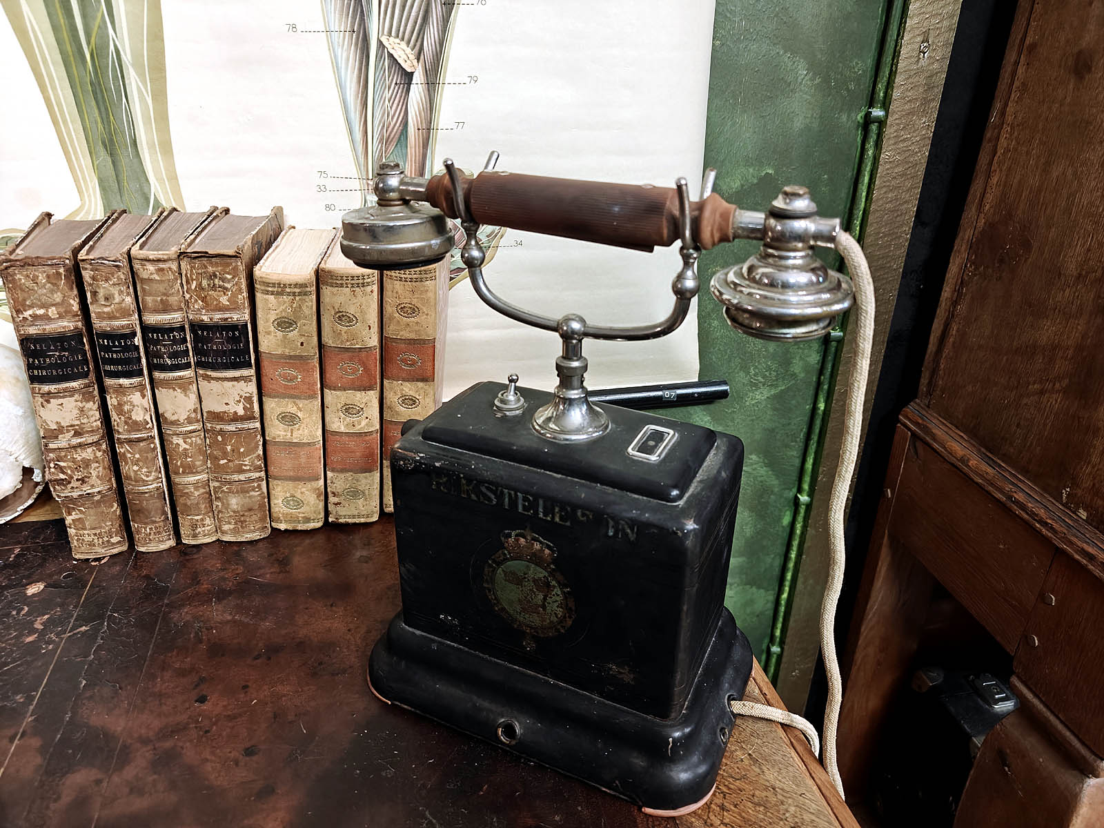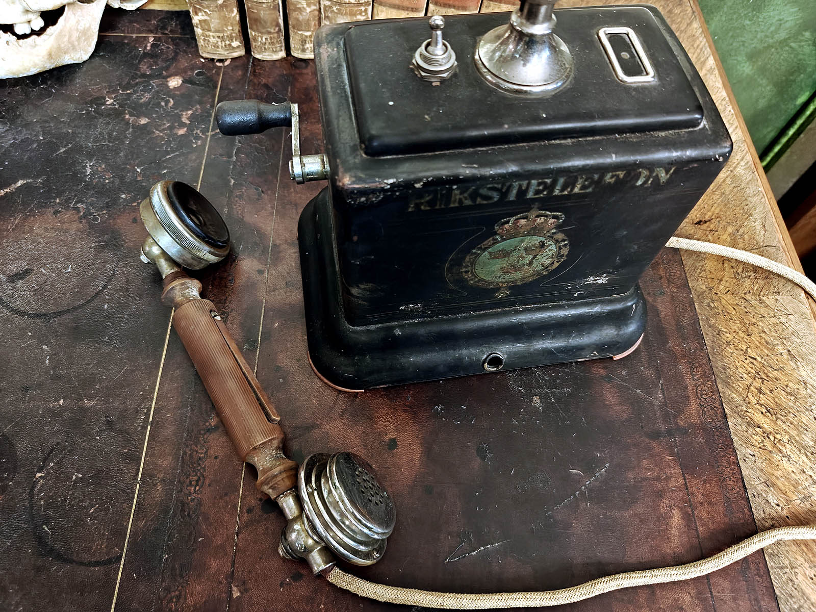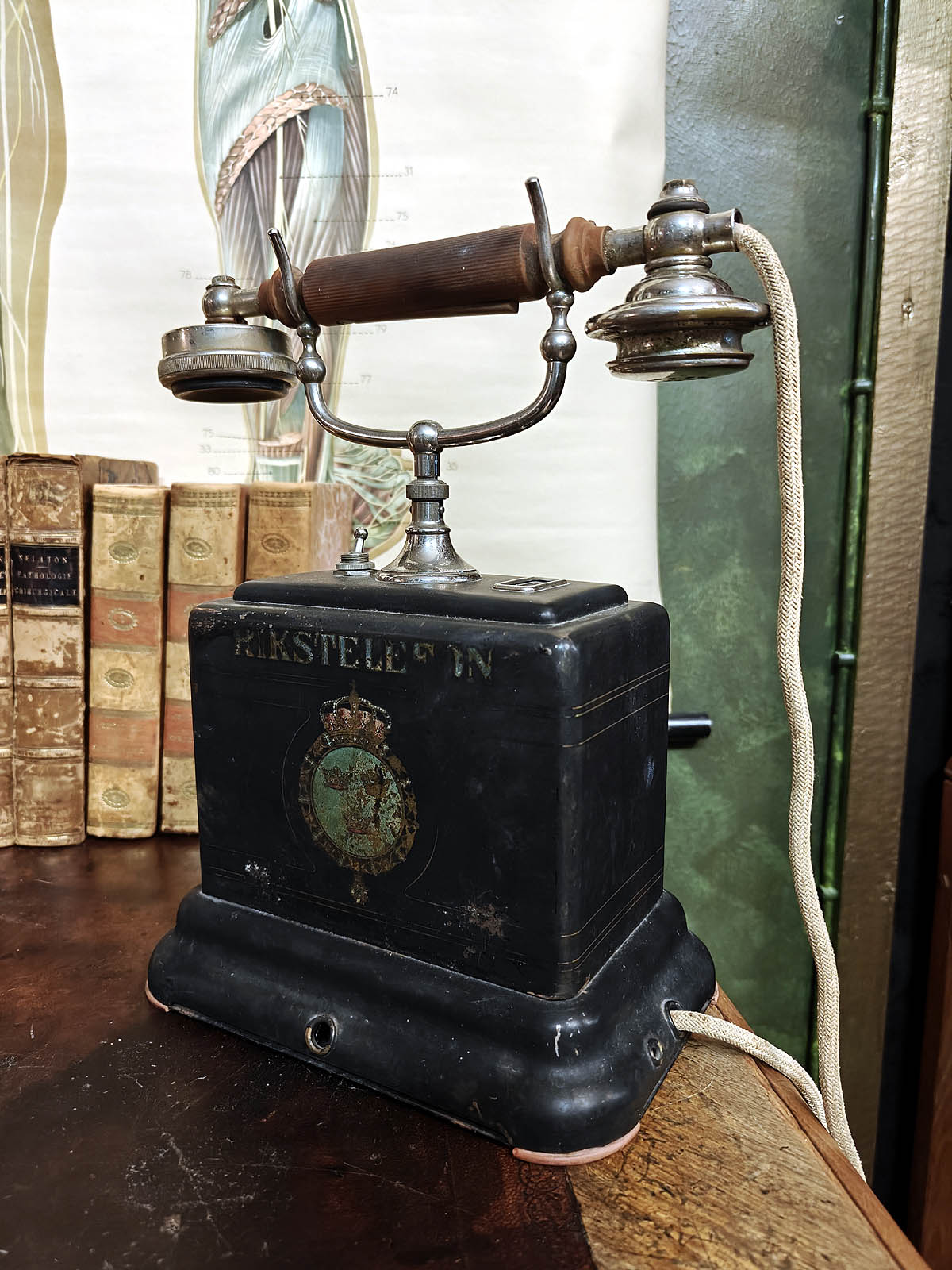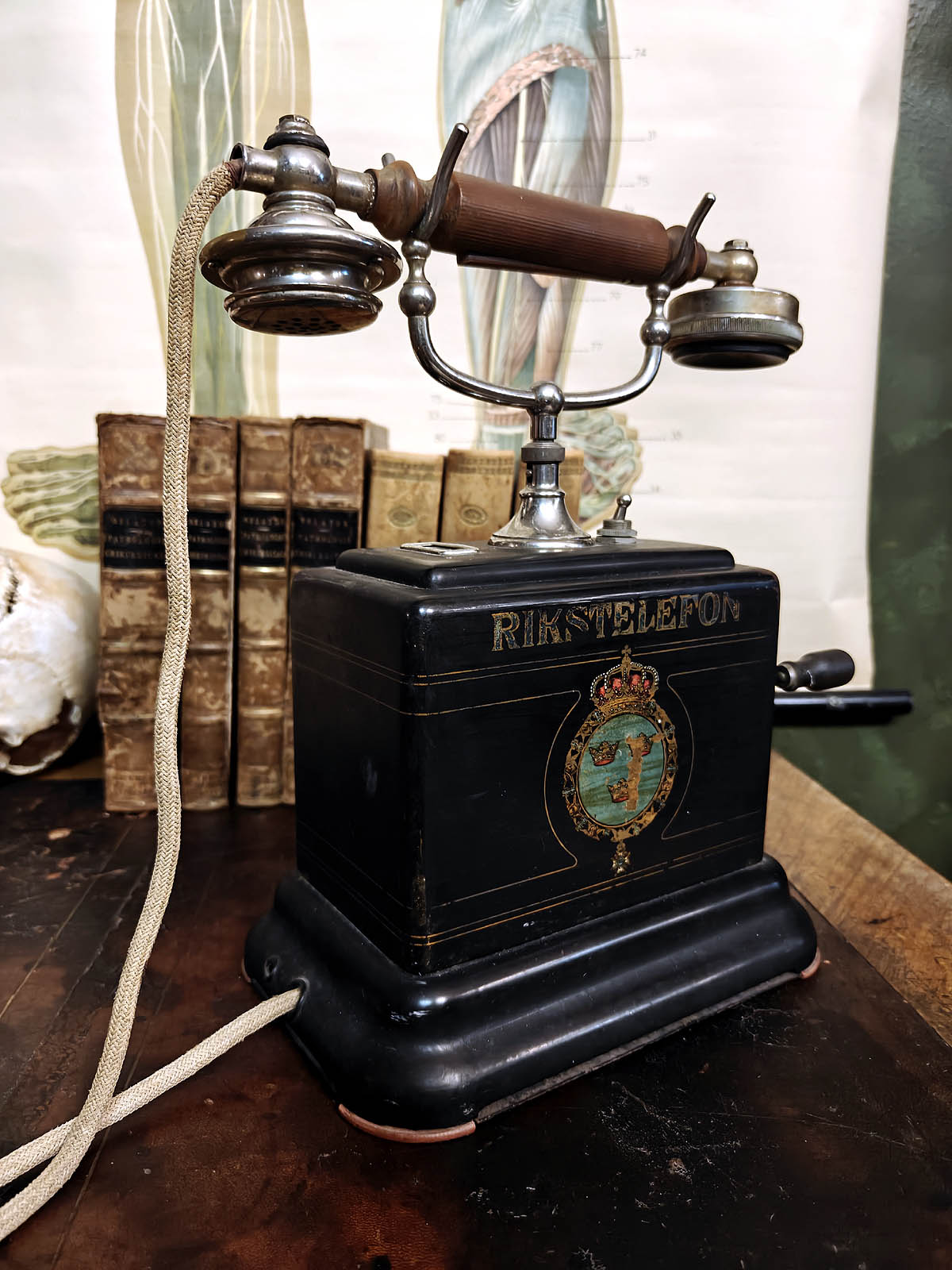 Muuta: Tämä L. M. Ericsson & Co:n valmistama kampipuhelin edustaa pohjoismaisen telekommunikaation varhaisinta aikaa, jolloin puhelin ei ollut vielä arkinen esine, vaan ennemminkin tekninen ihme. Etupaneelin Rikstelefon embleemi kertoo, että puhelin on ollut osa Ruotsin valtakunnallista puhelinverkkoa, joka oli aikansa edistyksellisimpiä Euroopassa. Puhelimen rakenne on suorastaan ikoninen; erillinen kuuloke, kiinteä puhemikrofoni ja sivukampi, jonka pyöräyttäminen herätti puhelinkeskuksen magnetovirralla. Tämä oli aikakausi ennen automaattivaihteita, jolloin jokainen puhelu alkoi fyysisellä liikkeellä ja yhteyden muodosti ihminen koneen sijaan.