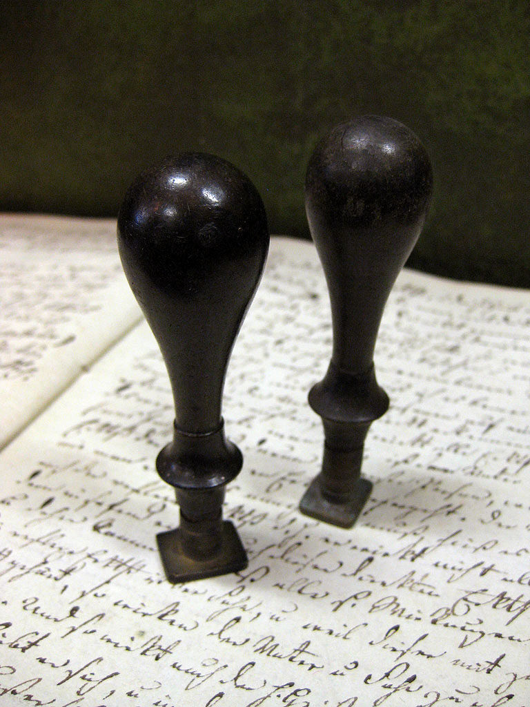 Muuta: Hienot ja laadukkaasti käsityönä valmistetut leimasimet herrasmiehen työpöydälle. Molemmissa leimasimissa monogrammit: ”RC” ja ”MF”.