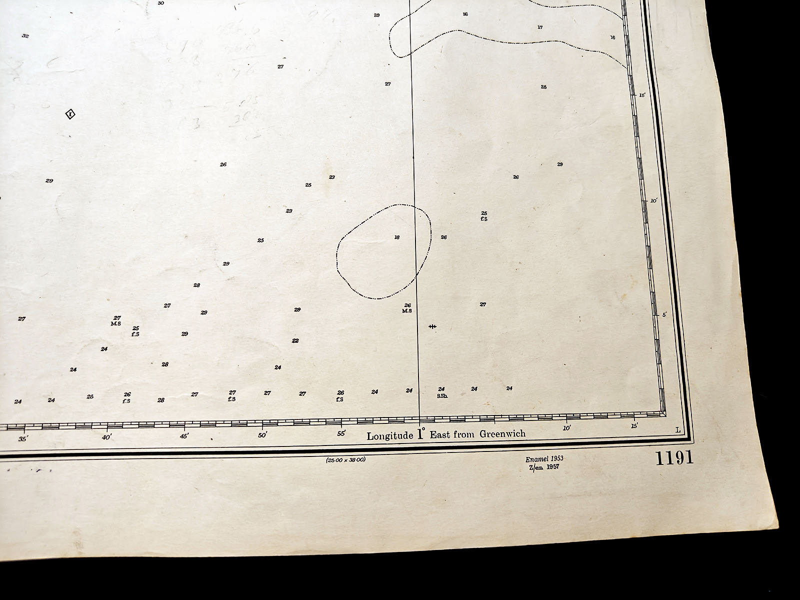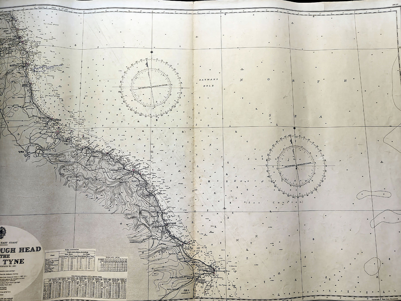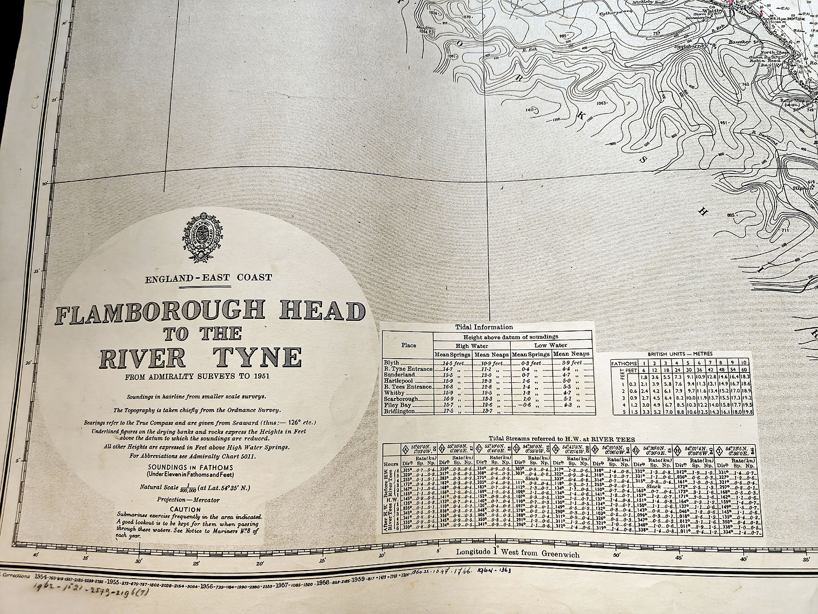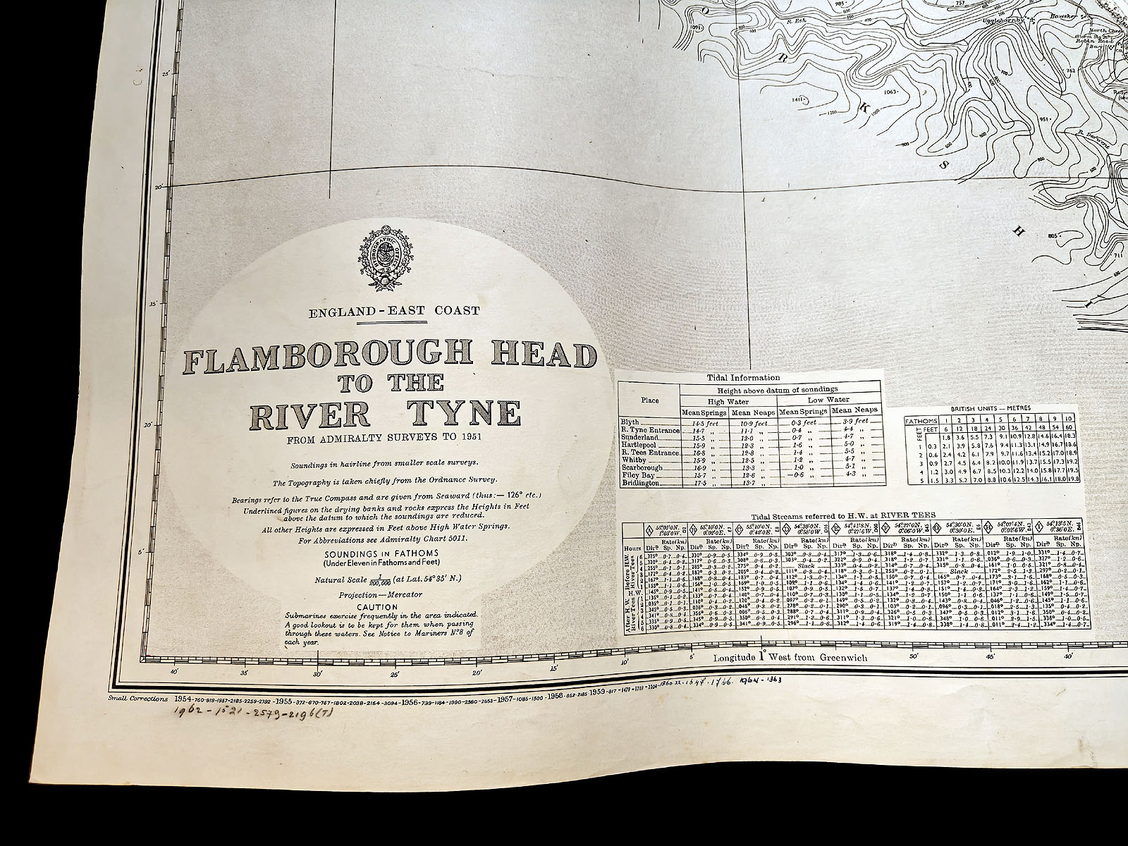 Muuta: Tämä Admiraltyn alkuperäinen merikartta kattaa Englannin itärannikon Flamborough Headin ja River Tynen välisen alueen, eli yhden Britannian vilkkaimmista ja historiallisesti merkittävimmistä rannikkovyöhykkeistä. Kartta on painettu vuonna 1953 ja siihen on tehty virallisia korjauksia aina 1960-luvun lopulle saakka, mikä kertoo sen pitkästä käytöstä merenkulussa. Kartta on ollut osa navigointiaikakautta, jolloin jokainen syvyyslukema, poiju- ja vuorovesimerkintä oli ratkaiseva turvallisen kulun kannalta.