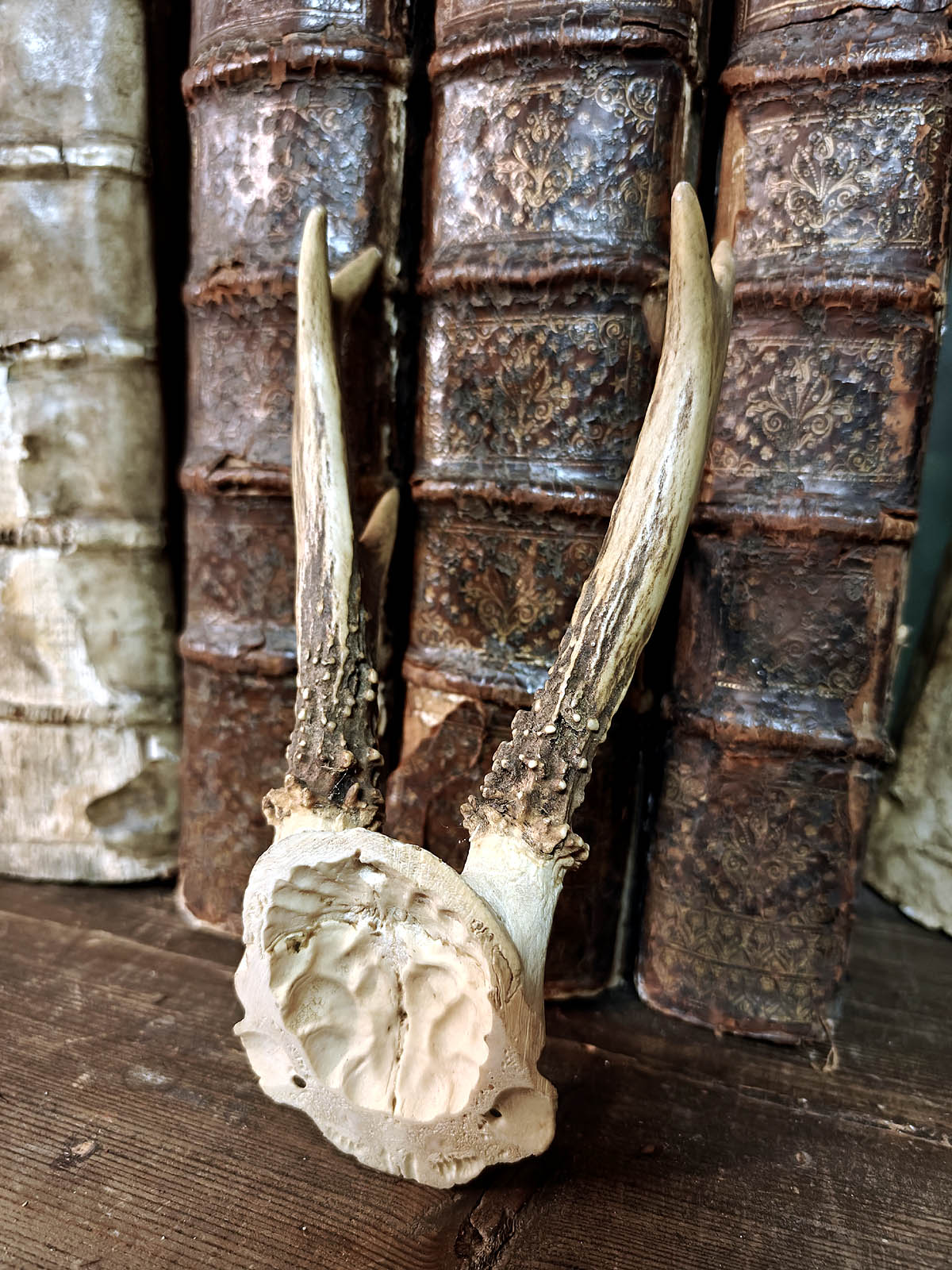 Rakenne: Trofeeksi sahattu yläkallo (kallonpohja), johon sarvet ovat kiinnittyneet luonnollisessa muodossaan. Metsäkauriille tyypilliset sarvet, helmimäinen tyviosa ja siro, kevyt kallorakenne. Luun pinta on vaalea ja tasainen, sarvien sävy lämmin ruskea. HUOM! Kyseisiä kalloja on meillä muutama ja ne voivat poiketa hiukan kuvassa olevasta.