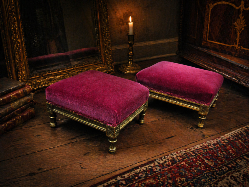 Alkuperä: Ruotsi Valmistusajankohta: 1800-luku Koko: Leveys 31 cm, syvyys 25 cm, korkeus 19 cm Kunto: Hyvä, pinnoissa ajan mukaista kulumaa / patinaa Muuta: Hieno myöhäiskustavilaisen aikakauden taburettipari. Kankaat uusittu jossain vaiheessa, niilläkin ikää jo reilusti. Kaunis kuninkaallinen viininpunainen väri, rungon koristeluissa upeat yksityiskohdat. Alkuperäinen kultaus.