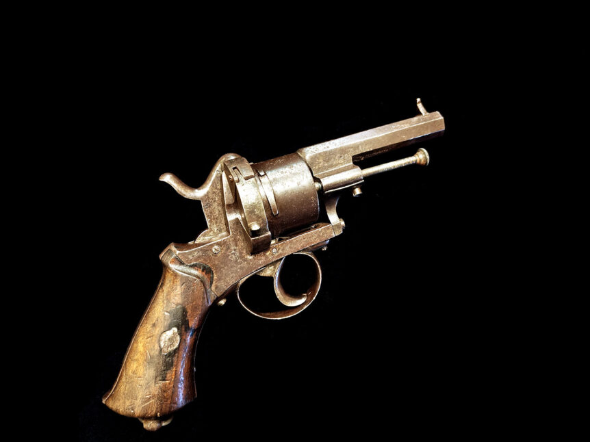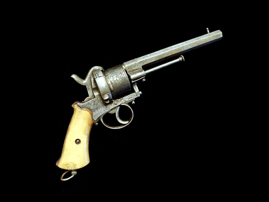 Alkuperämaa: Belgia tai Ranska Valmistusajankohta: 1860-luku Lupa: Ase on ikänsä puolesta lupavapaa, eli et tarvitse erillistä lupaa kohteen ostoon, myyntiin tai säilyttämiseen Merkinnät: Ei näkyviä leimauksia Mekanismi: Kaksitoiminen piikkipatruunarevolveri Pituus: 22 cm Rulla: 6 patruunapesää Piipunreiän halk.: 11 mm Rihlaus: Ei (sileä piippu) Kunto: Hyvä, mekanismi toimii hienosti sekä yksi- että kaksitoimisesti. Pinnat ovat säilyneet arvokkaasti, ja niissä on aseen …
