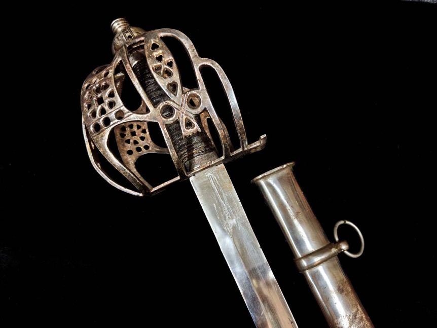 Alkuperämaa: Skotlanti Valmistusajankohta: 1900-luvun alku Valmistaja: Ei tiedossa Signeeraus/Merkinnät: – Pituus: 105 cm Tuppi: Kyllä, alkuperäinen, kunto hyvä Kunto: Hyvä, pinnoissa jonkin verran kulumaa ja tummentumaa Muuta: Kyseessä on yksi ehkä tunnistetuimmista miekoista sillä kohteena on skottilainen basket hilt- lyömämiekka (engl. Scottish Basket Hilt Broadsword). Kyseinen miekkatyyppi on otettu käyttöön jo 1500-luvulla josta se sitten vähitellen jalostui esim. skottilaisten menestyksekkääksi taistelumiekaksi. …