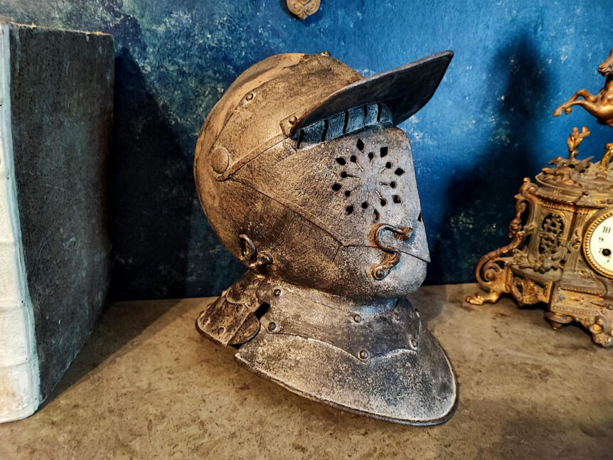 Kohde: Ritarin (ratsuväensotilaan) kypärä Alkuperä: Italia Valmistusajankohta: 1800-luvun alkupuoli Mitat: Korkeus 35 cm. Sisäaukon halkaisija 20 cm ja sitä saa myös raotettua, samoin visiiri aukeaa jonkin verran. Kunto: Hyvä, ajanmukaista kulumaa / patinaa Muuta: Kohteena erittäin poikkeuksellinen kohde, sillä kyseessä on vanha italialainen ritarin, tai oikeammin ratsuväensotilaan, esittelykäyttöön tehty taistelukypärä. Kypärä on kaikin puolin hieno ja se on alkuperäisin mitä …