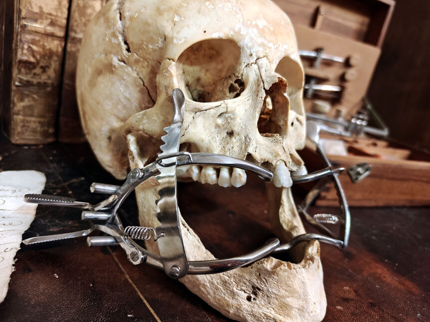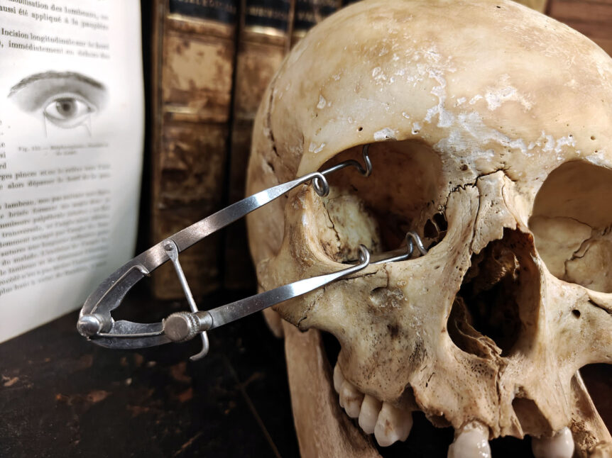 Alkuperä: Eurooppa Valmistaja: Ei tiedossa (ei leimoja) Valmistusajankohta: 1900-luvun puoliväli Koko: Leveys 17 cm, maksimikorkeus 8 cm Materiaali: Teräs Kunto: Hyvä, pinnassa vähäistä kulumaa, hapettumaa ja patinaa Muuta: Tämä vaikuttava kirurginen instrumentti on suunlevitin, jota on käytetty suun, nielun ja hammaskirurgian toimenpiteissä. Laitteen hammastettu säätömekanismi ja jousivoima mahdollistivat leuan vakaan ja turvallisen lukitsemisen avoimeen asentoon. Tämä oli elintärkeää erityisesti varhaisissa …