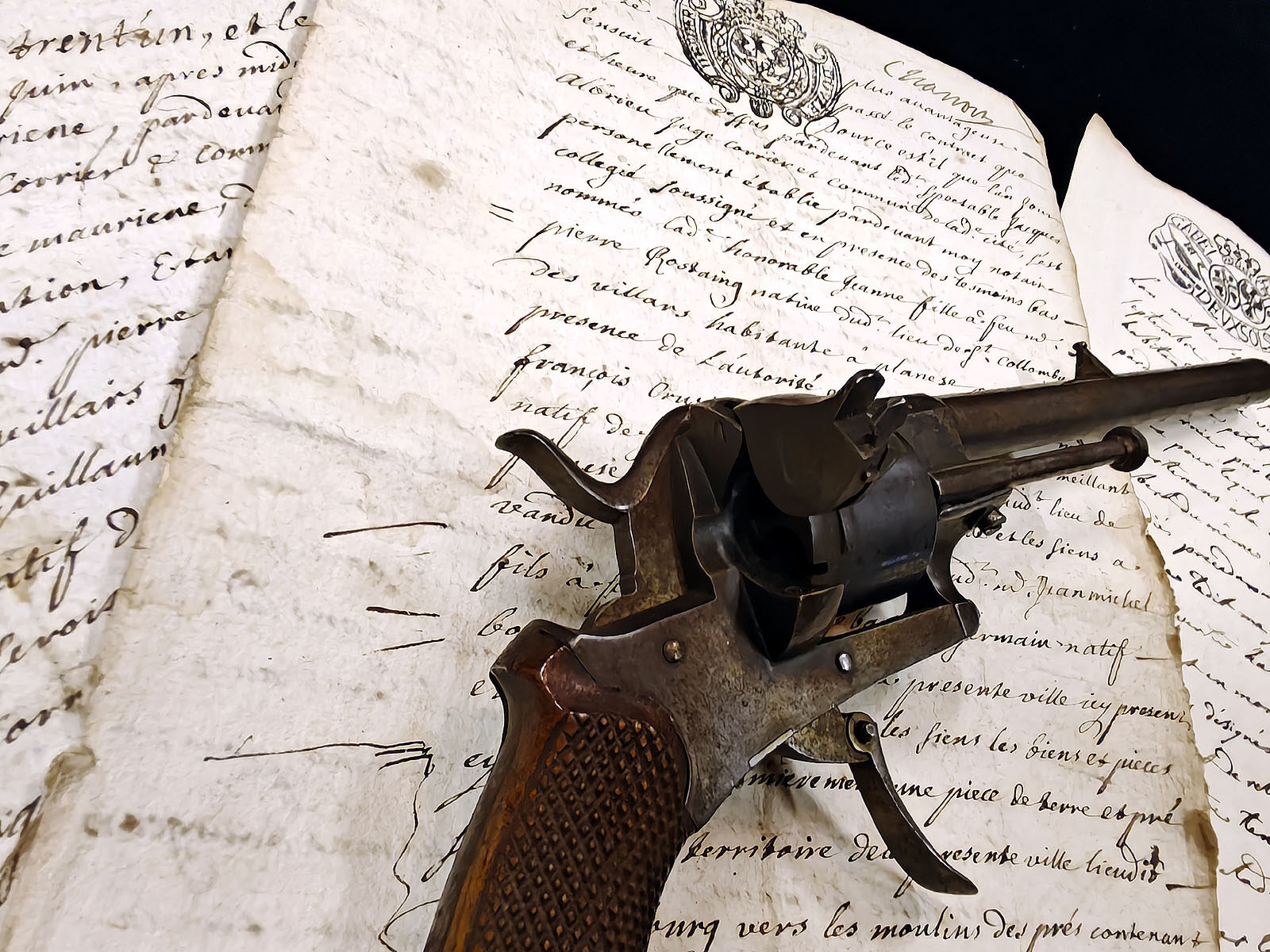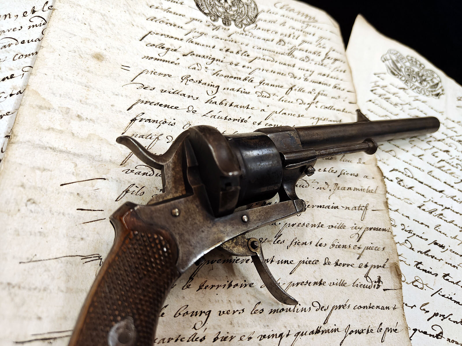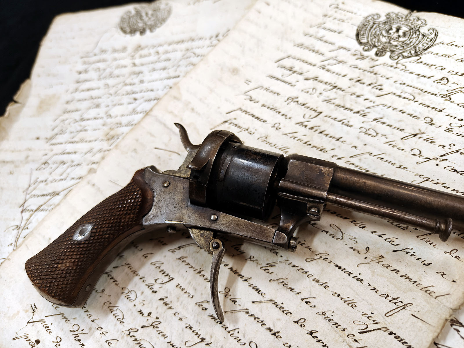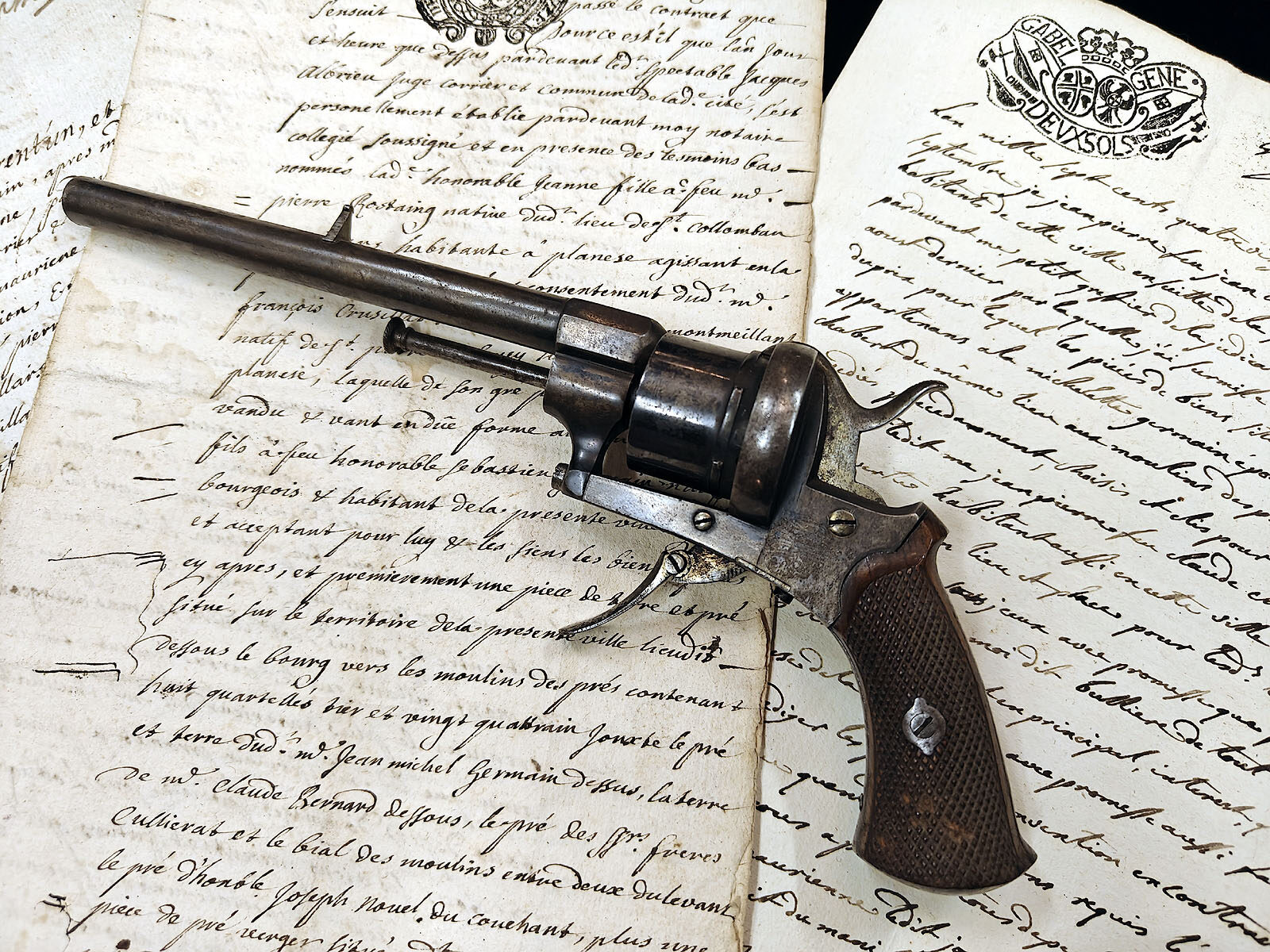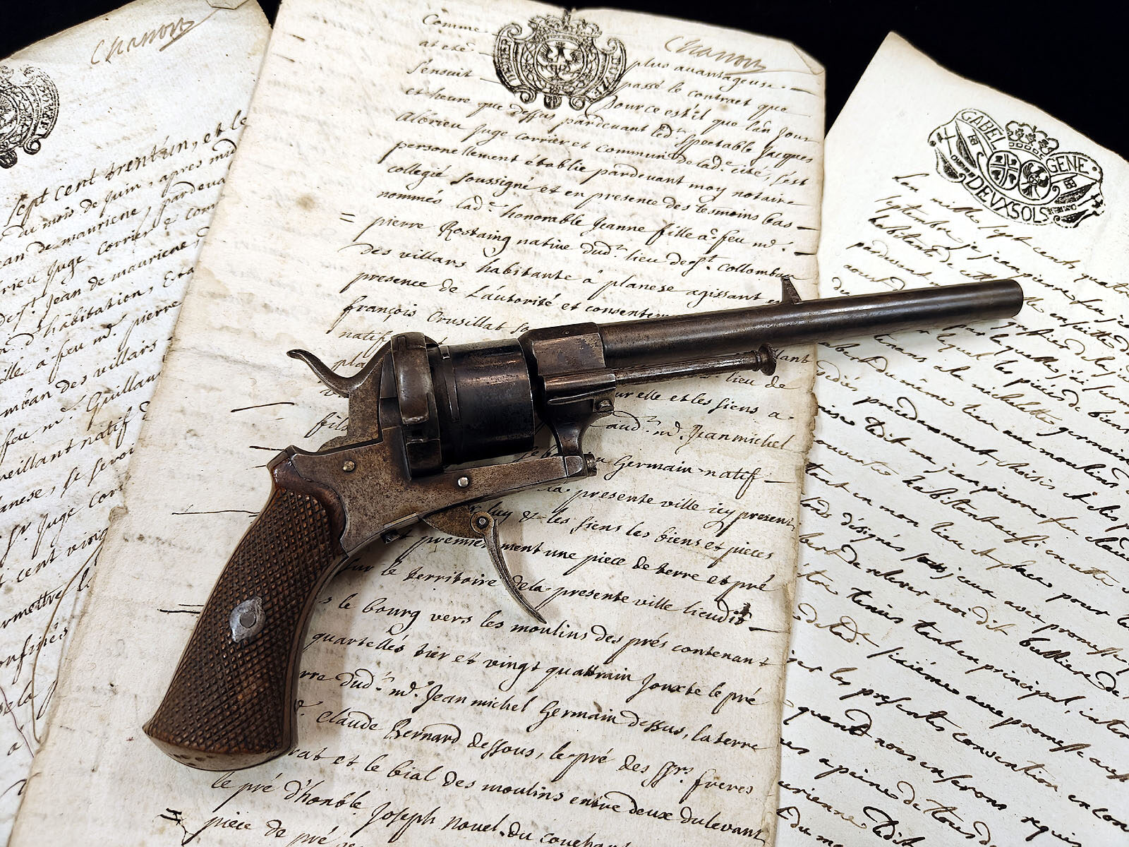 Muuta: Tämä upeassa kunnossa oleva 1860-luvun perinteinen belgialainen piikkipatruunarevolveri edustaa ranskalaisen Eugène Lefaucheux’n kehittämää asetyyppiä, joka oli historiallisesti merkittävä askel siirryttäessä mustaruudista nykyaikaisiin metallihylsyisiin patruunoihin. Ase on kokonaispituudeltaan 24,5 cm ja sen 7mm kaliiperisessa piipussa on alkuperäinen rihlaus, mikä on laadun merkki tämän tyyppisessä revolverissa. Aseesta ei löydy leimauksia, mutta sen rakenteelliset yksityiskohdat ja viimeistely viittaavat vahvasti Belgian aseteollisuuden kultakauteen.