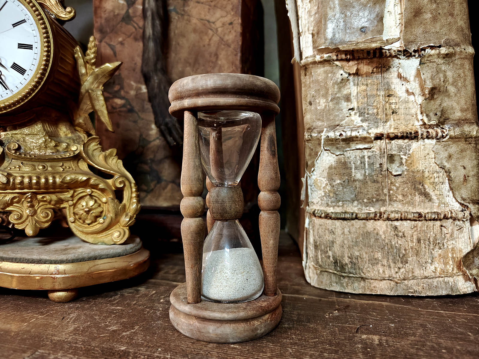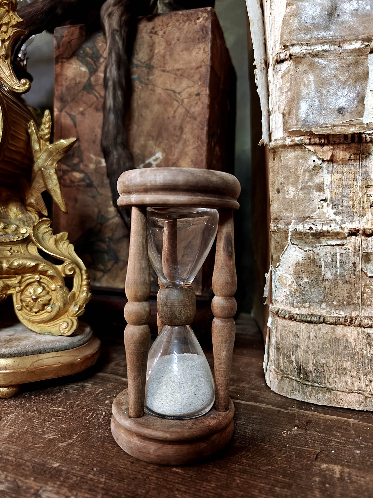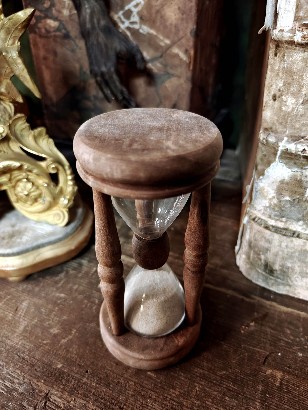 Muuta: Tämä poikkeuksellisen kaunis tiimalasi edustaa 1800‑luvun lopun eurooppalaista käsityötaitoa. Kolme sorvattua, balusterimaisesti muotoiltua puupilaria ovat tyylipiirre, joka yhdistää barokin koristeellisuuden ja varhaisen uusklassismin selkeyden. Tumma lehtipuu, kulunut pinta ja hiekan luonnollinen sävy kertovat esineen pitkästä käytöstä. Tämänkaltaisia tiimalaseja käytettiin aikanaan mm. kirkoissa saarnatiimalaseina ja laivoilla lokilaseina, joilla mitattiin aluksen nopeutta. Nämä ovat harvinaisia kohteita löytää aidosti vanhoina.