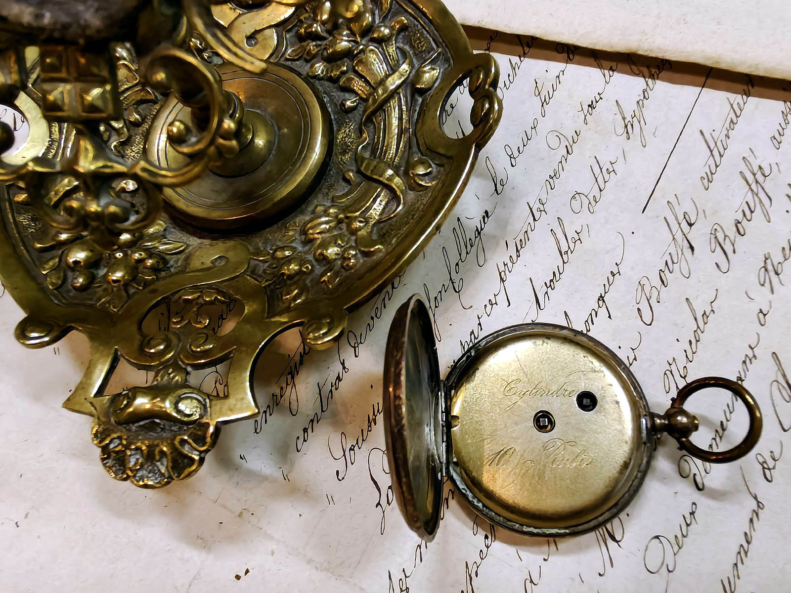 Muuta: Tämä koristeellinen ranskalainen ”leidin” kelloteline edustaa 1800–1900‑lukujen vaihteen rokokoo- ja art nouveau ‑tyylien yhdistelmää. Messinkivalu on täynnä yksityiskohtia: mytologisia hahmoja, kaarevia ornamentteja ja pieni tarjotinalusta, joka viittaa ranskalaiseen alkuperään. Tällaisia jalustoja käytettiin erityisesti viktoriaanisella ja edwardiaanisella aikakaudella, jolloin taskukello asetettiin yö- tai lipaston päälle toimimaan pöytäkellona, eli käytännöllisenä mutta samalla esteettisenä esineenä.