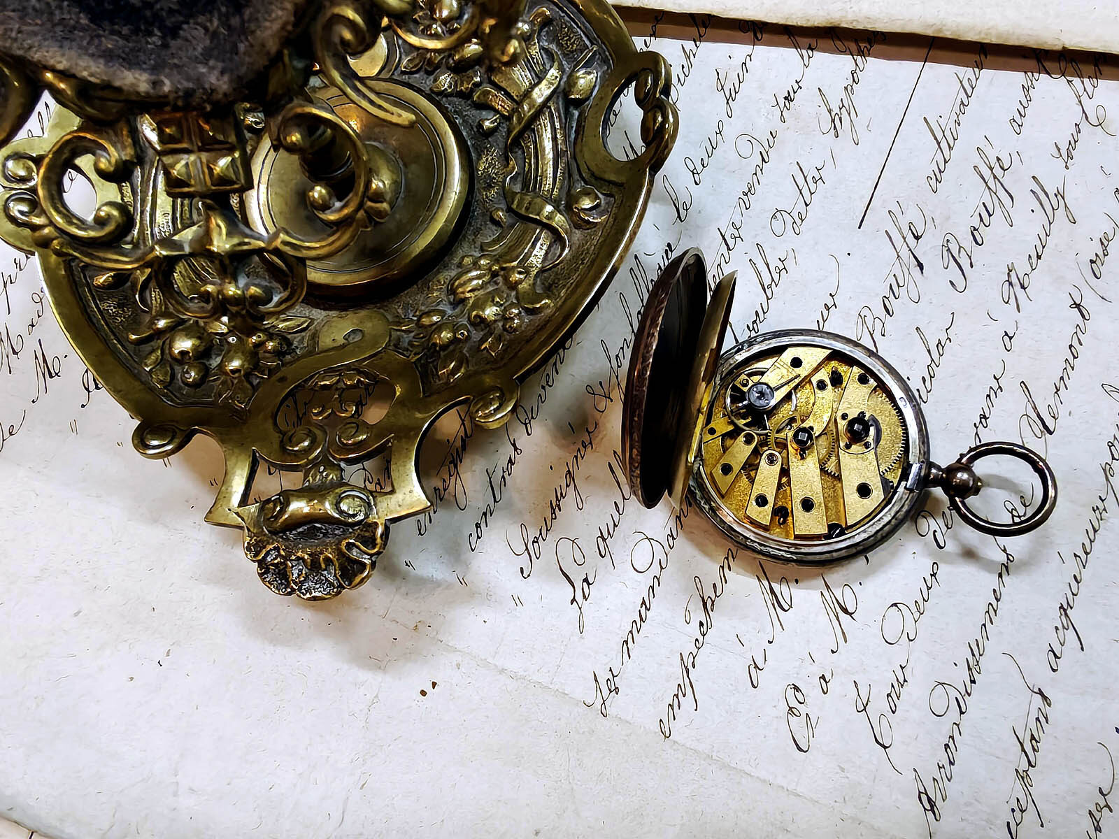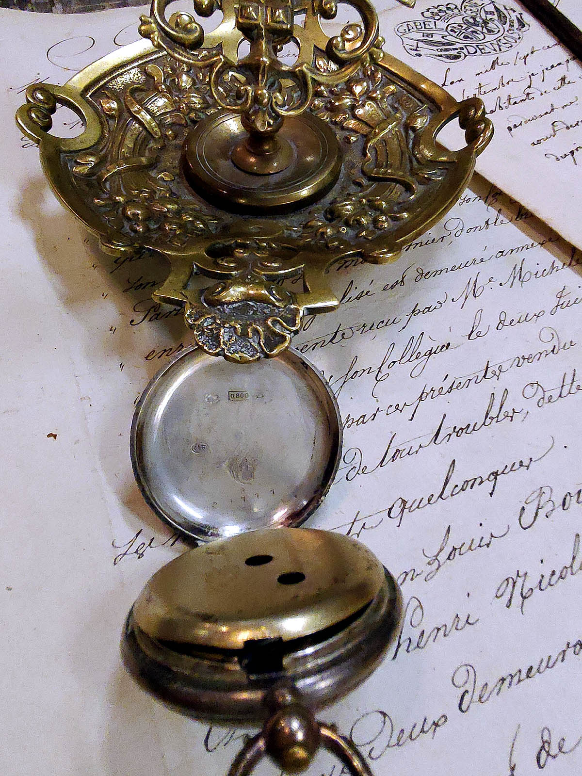 Mukana oleva taskukello on avainvetoinen open-face‑malli, valmistettu todennäköisesti Sveitsissä tai Ranskassa. Sen koneistossa on 10 rubiinilaakeria ja sylinterikäynti, joka oli aikakauden yleinen ja kustannustehokas ratkaisu. Kellotaulu on valkoista emalia, roomalaisin numeroin, sinistetyin osoittimin ja erillisellä sekuntitaululla. Kotelo on valmistettu 800-pitoisesta hopeasta, ja ajan asetus tapahtuu erillisellä avaimella kellotaulun keskeltä. Vaikka kellon valmistaja on tuntematon, kokonaisuus edustaa aikansa käsityöperinnettä ja koristeellista eleganssia. Aikas upea kohde millaiseen tahansa esillepanoon!