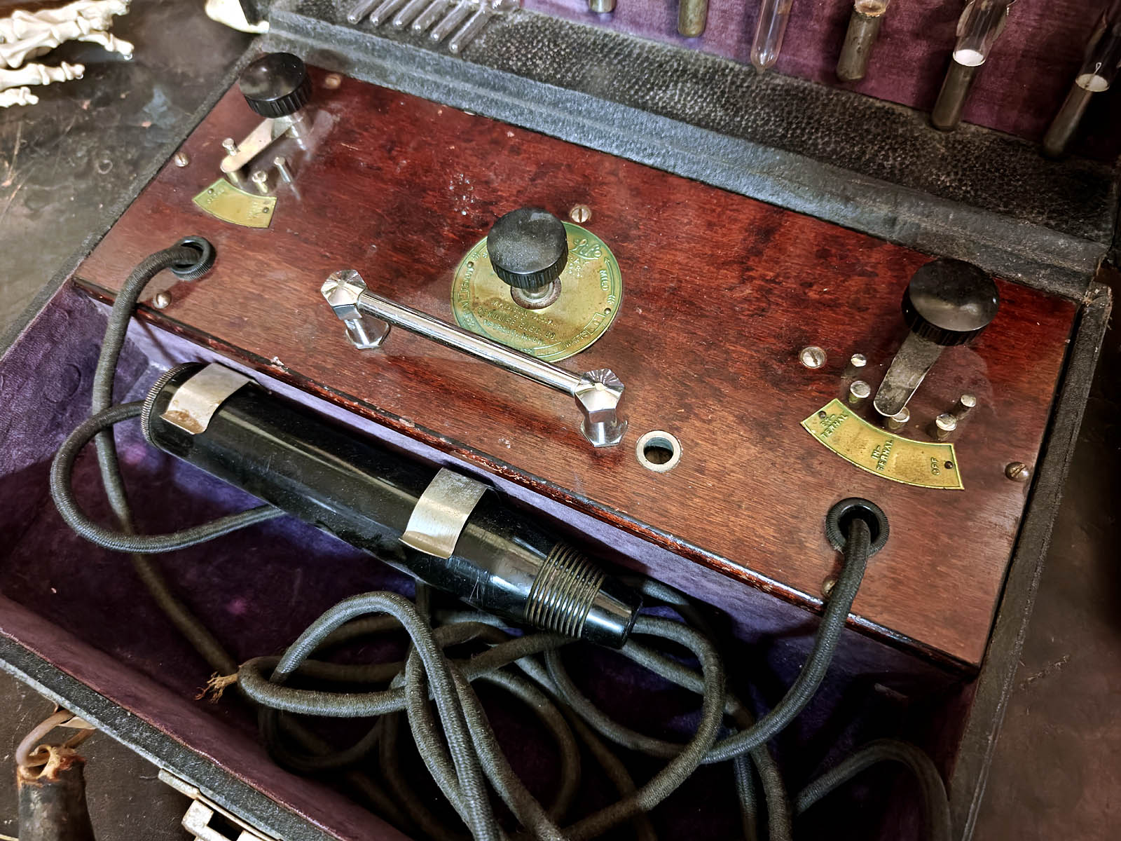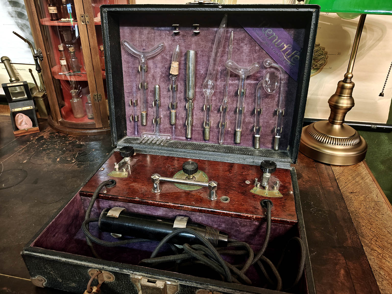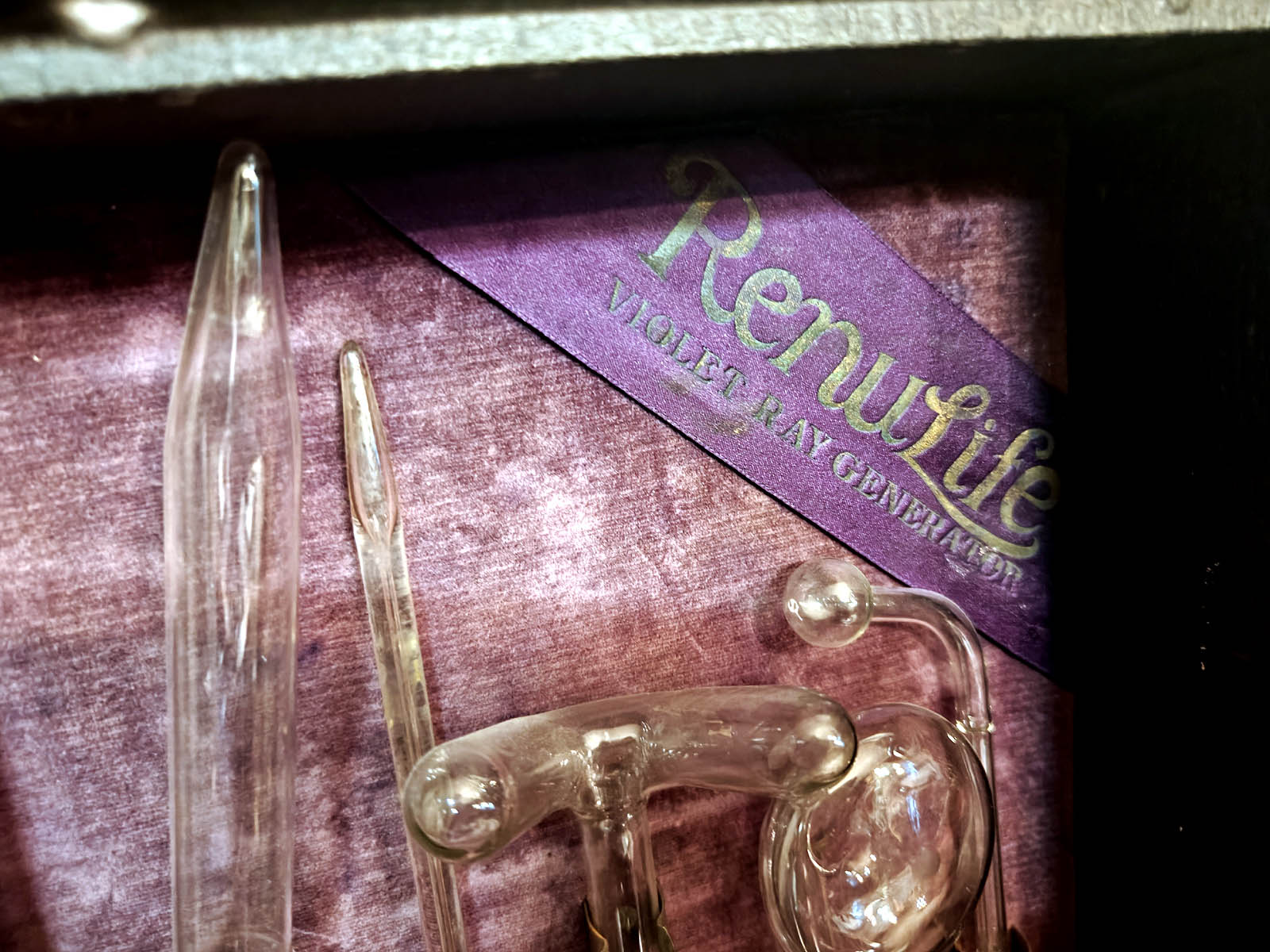 Muuta: Tämä RenuLife Violet Ray Generator on yksi tunnetuimmista ja näyttävimmistä esimerkeistä 1900-luvun alun sähköterapialaitteista, jolloin sähköä pidettiin lähes rajattoman parantavana voimana ja kotikäyttöiset ”ihmelaitteet” levisivät nopeasti. Renulife Electric Company markkinoi laitteitaan elegantteina, modernin tieteen tuotteina ja niiden violettina hehkuvat lasielektrodit tekivät niistä aikansa futuristisia symboleja.