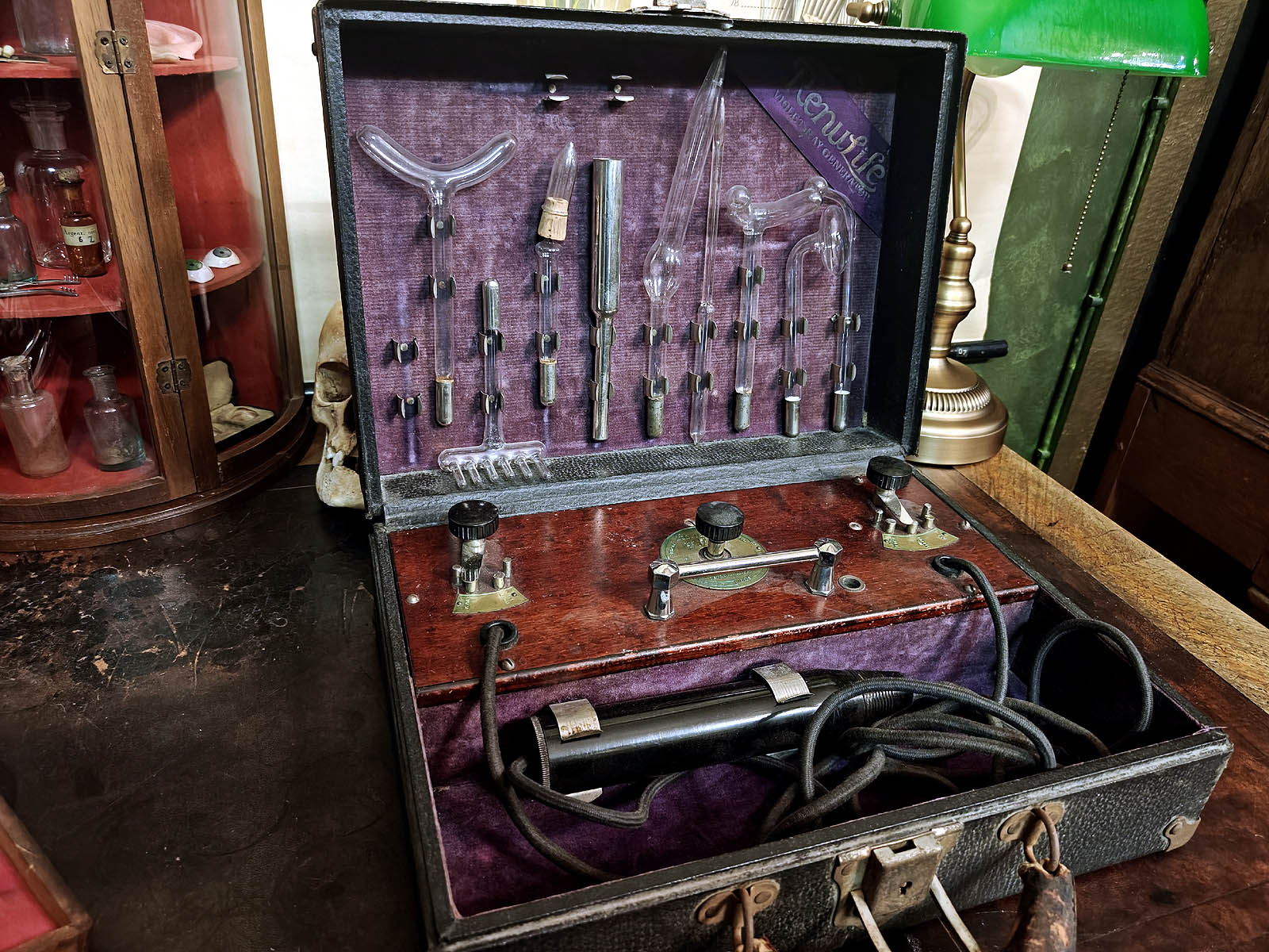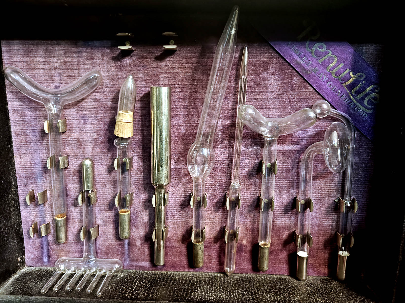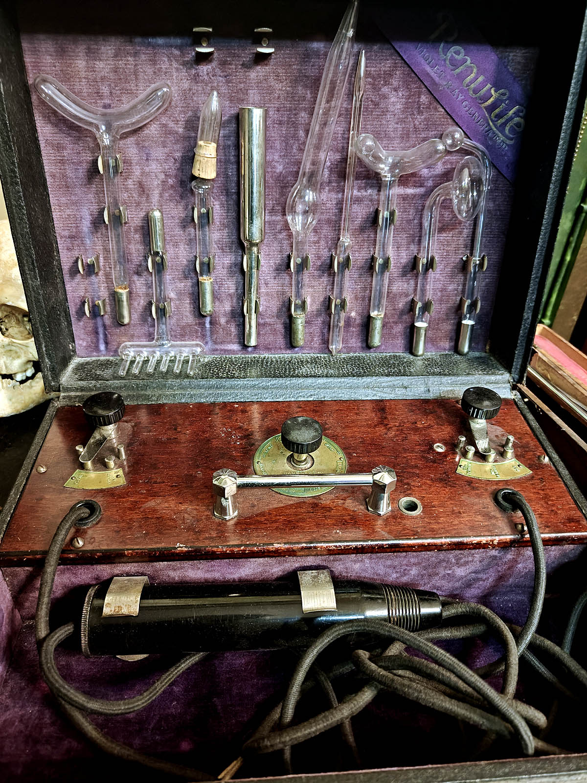 Muuta: Tämä RenuLife Violet Ray Generator on yksi tunnetuimmista ja näyttävimmistä esimerkeistä 1900-luvun alun sähköterapialaitteista, jolloin sähköä pidettiin lähes rajattoman parantavana voimana ja kotikäyttöiset ”ihmelaitteet” levisivät nopeasti. Renulife Electric Company markkinoi laitteitaan elegantteina, modernin tieteen tuotteina ja niiden violettina hehkuvat lasielektrodit tekivät niistä aikansa futuristisia symboleja.