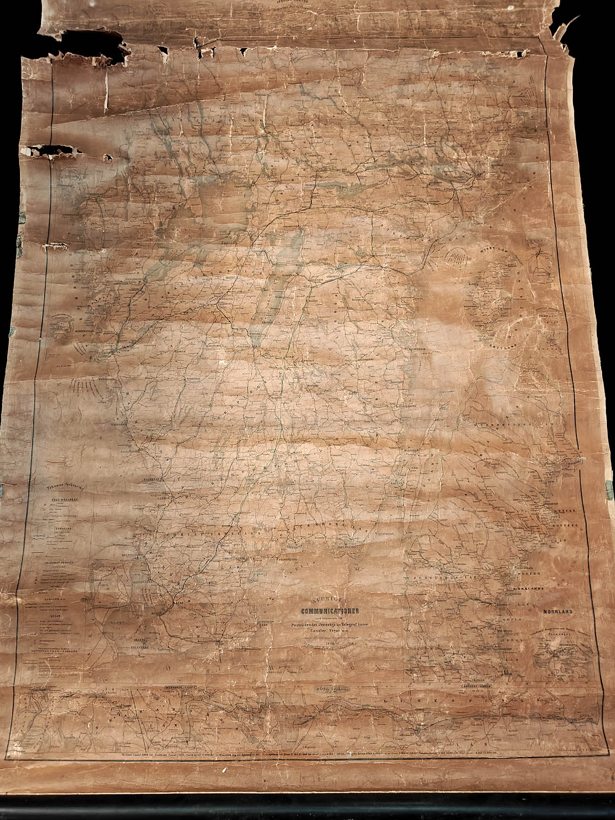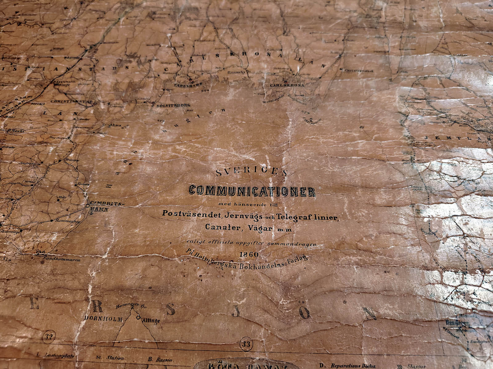 Muuta: Tämä suuri ja vaikuttava seinäkartta on yksi varhaisimmista kokonaisesityksistä Ruotsin valtakunnan liikenne- ja viestintäverkosta aikana, jolloin maa oli vasta astumassa modernin infrastruktuurin aikakauteen. Kartan otsikko “Sveriges Communicationer med hänseende till Postväsendet, Jernvägs och Telegraf linier, Canaler, Vägar mm” kertoo sen laajuudesta: se kokoaa yhteen postireitit, varhaiset rautatielinjat, lennätinverkoston, kanavat ja maantiet virallisten tietojen pohjalta.