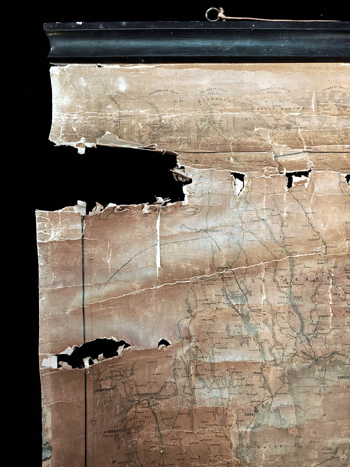 Kartan painopinta on valmistettu puuvillapohjaisesta paperista, jota käytettiin 1800‑luvun virallisissa seinäkartoissa sen kestävyyden vuoksi. Suuret kartat vuorattiin ohuella puuvillakankaalla, jotta ne kestäisivät rullauksen ja opetuskäytön. Ylä- ja alareunan puulistat ovat osa alkuperäistä ripustusjärjestelmää. Kartan kulunut pinta, repeämät ja kellastuminen ovat osa sen autenttista historiaa – tämä on kartta, joka on todella ollut käytössä.