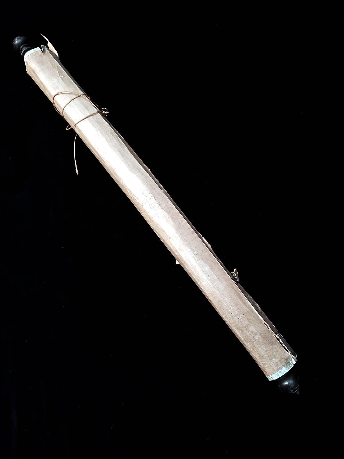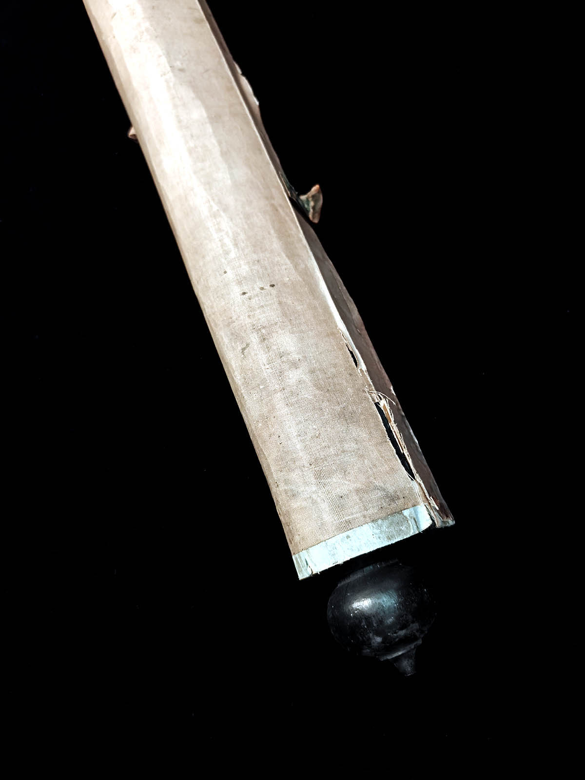 Materiaali: Puuvillapohjainen paperi (rag paper) taustakankaalla; puulistat ylä- ja alareunassa