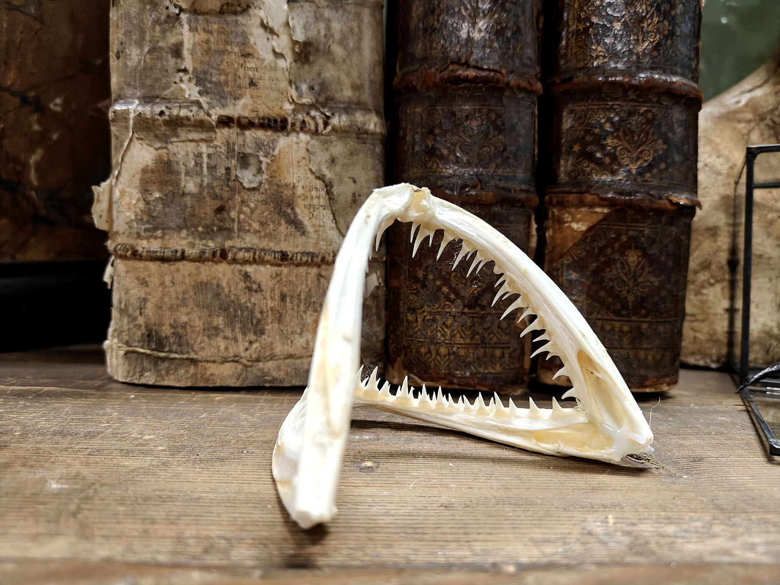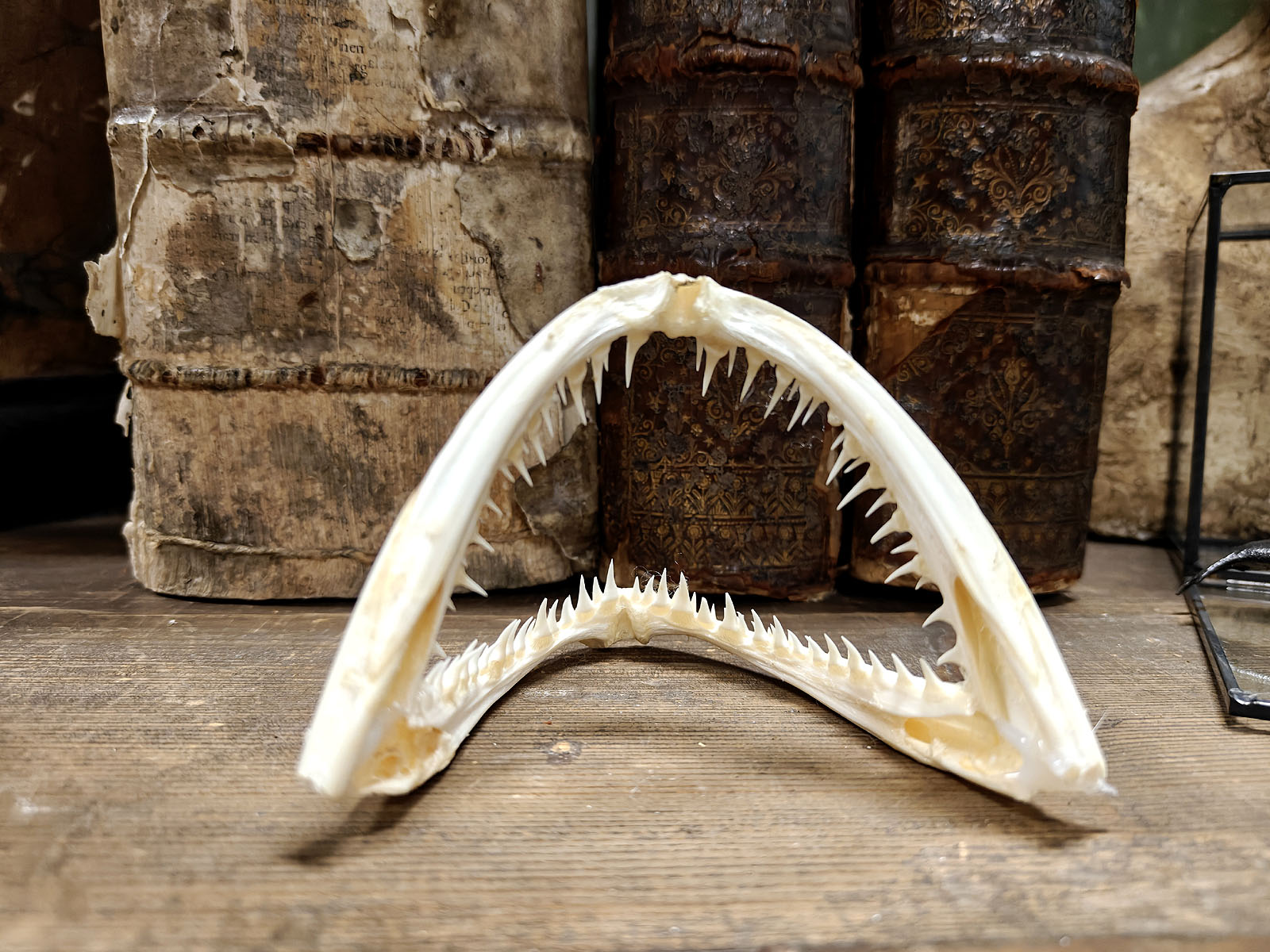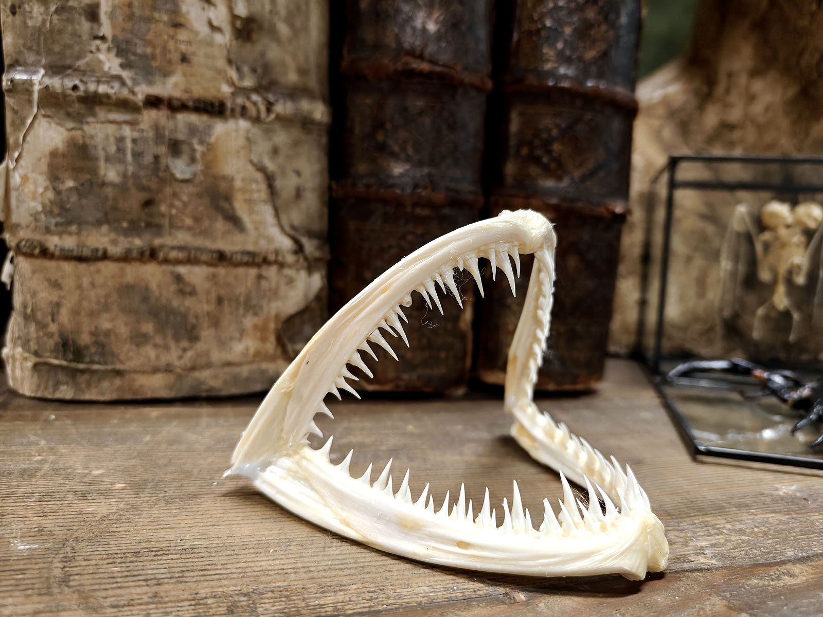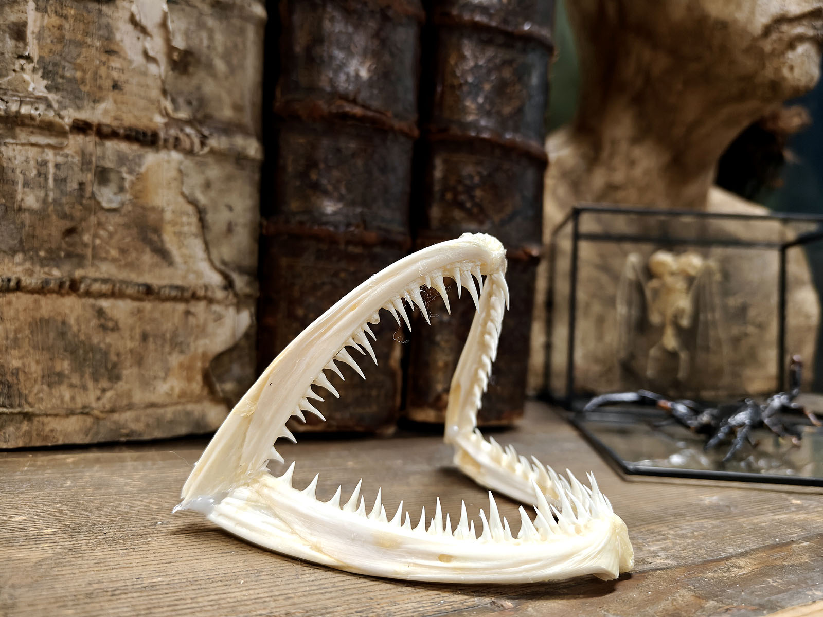 Tämä purukalusto on kuin luonnonmuotoilun mestariteos, eli kevyt, kestävä ja tappavan tehokas. Sen rakenne kertoo evoluution pitkästä historiasta ja siitä, miten syvänmeren saalistaja on muovautunut täydelliseksi väijyjäksi. Hampaat eivät vain leikkaa, vaan ne myös lukitsevat. Ja kun saalis on sisällä, paluuta ei ole. Mielettömän hieno kohde vaikka mihin esillepanoon!