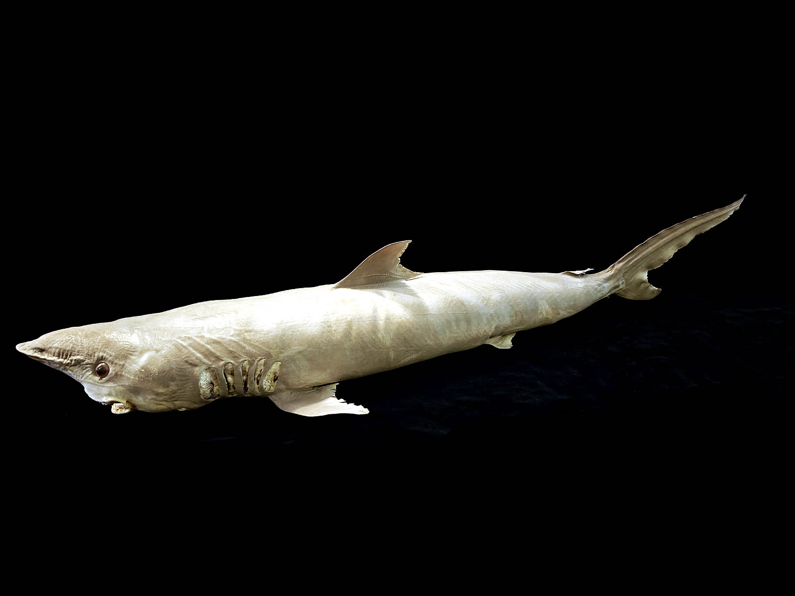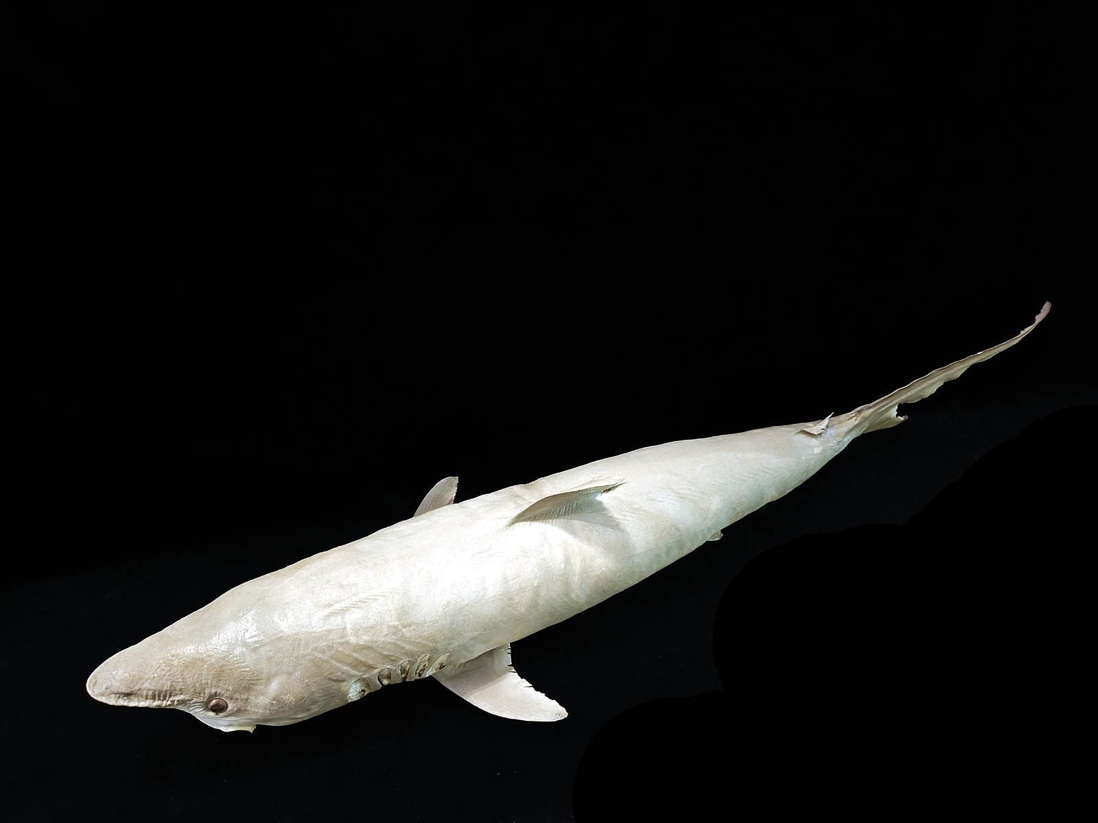 Muuta: Tässä sellainen kohde, joita ei ihan joka päivä ole saatavilla! Tämä poikkeuksellisen upea taksidermia-näyte on mustatäplähai (Carcharhinus sealei), jonka alkuperä on Madagaskarilla. Kyseessä on pienikokoinen (mutta silti metrin mittainen!) siro hailaji, joka elää Intian valtameren ja Länsi-Tyynenmeren rannikkovesissä. Lajin tunnistaa helposti sen pitkänomaisesta, pyöreästä nokasta, suurista soikeista silmistä ja kulmikkaista hampaista, jotka ovat tyypillisiä pienille Carcharhinus-suvun petohaille.
