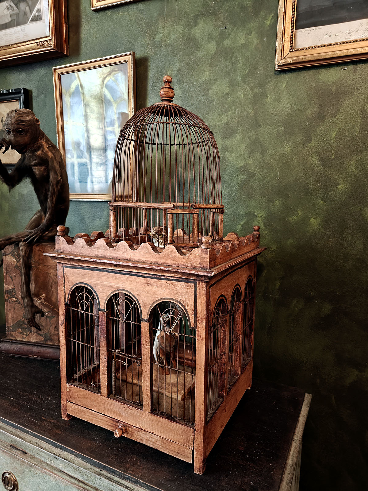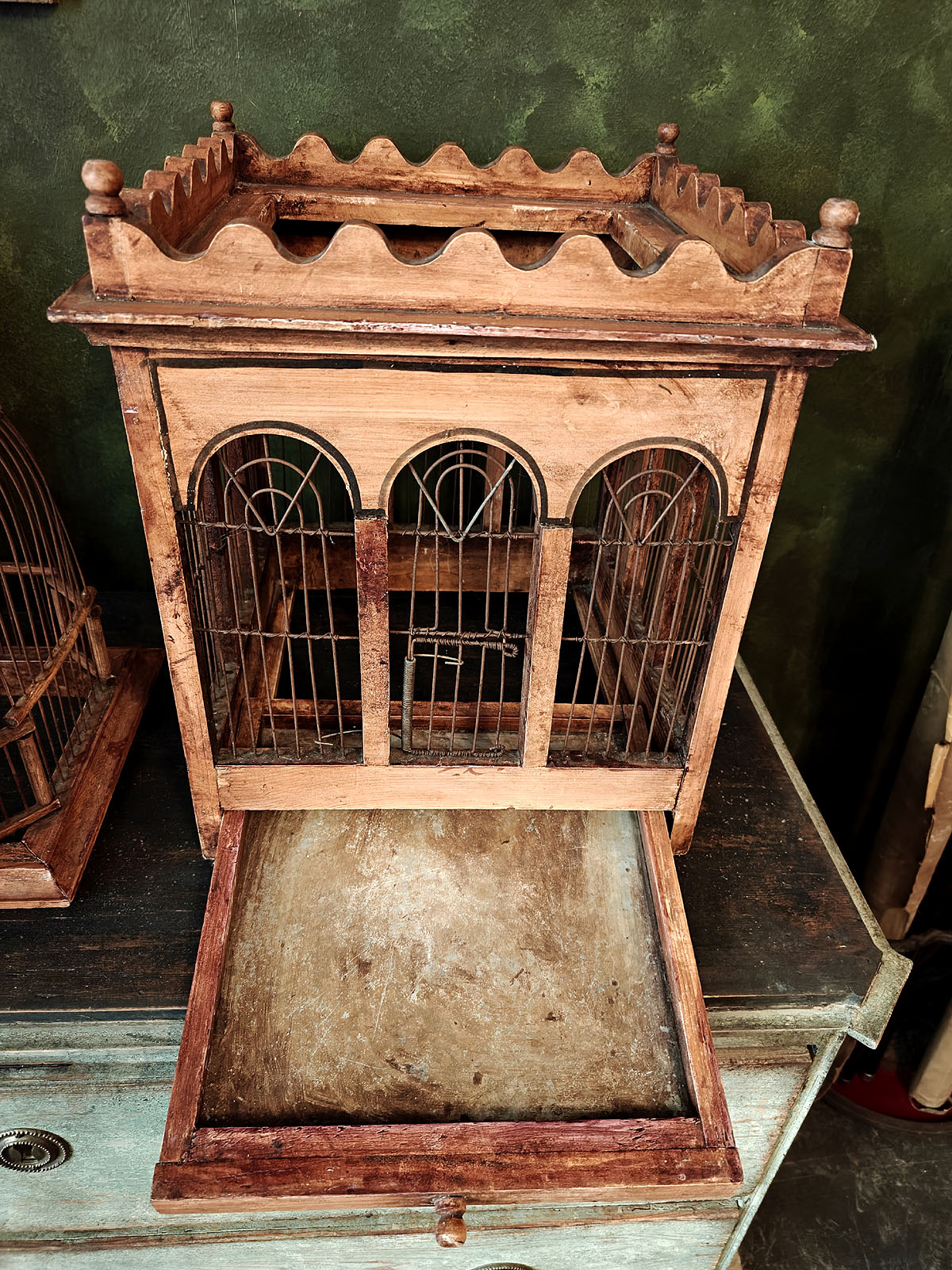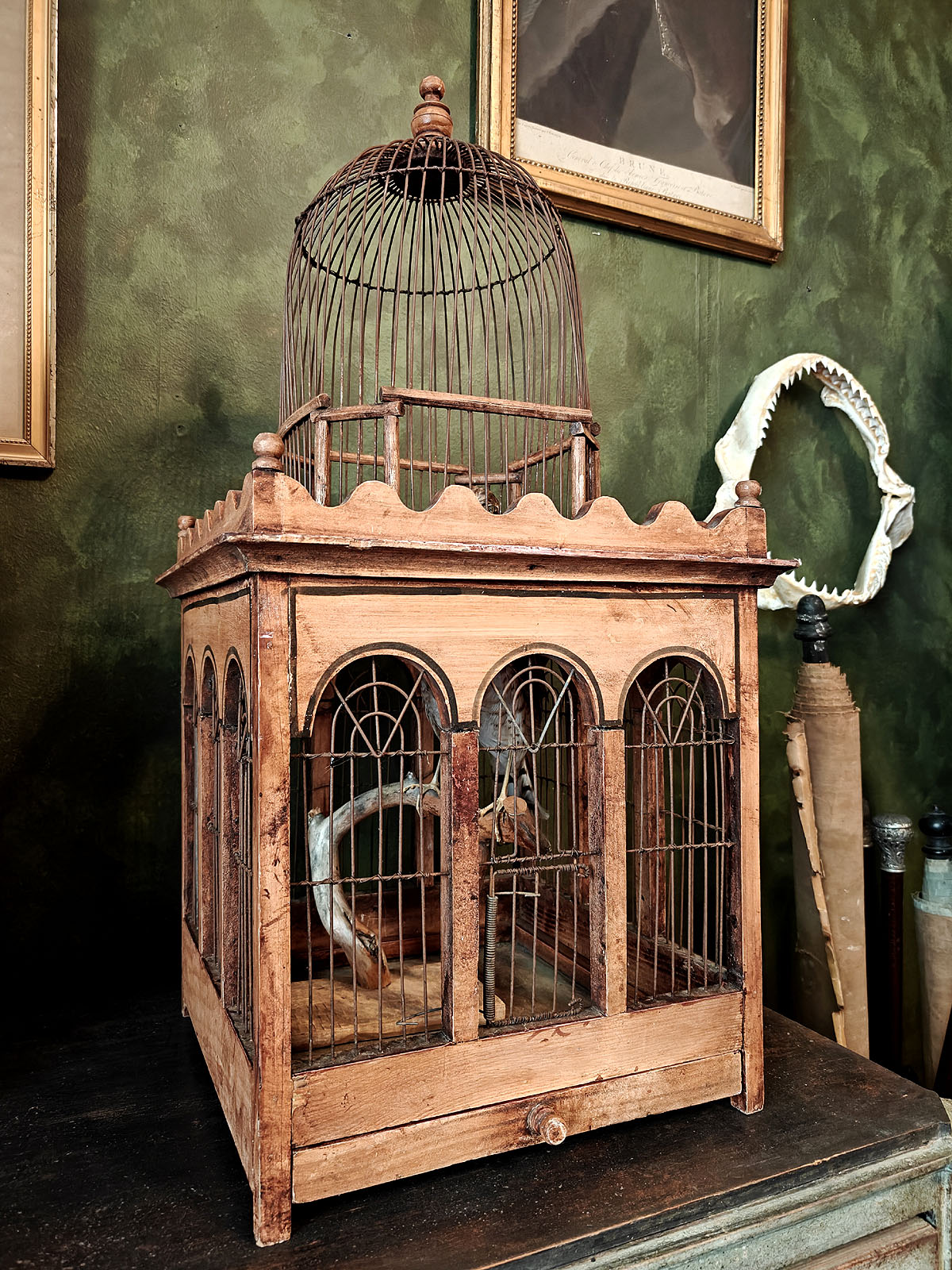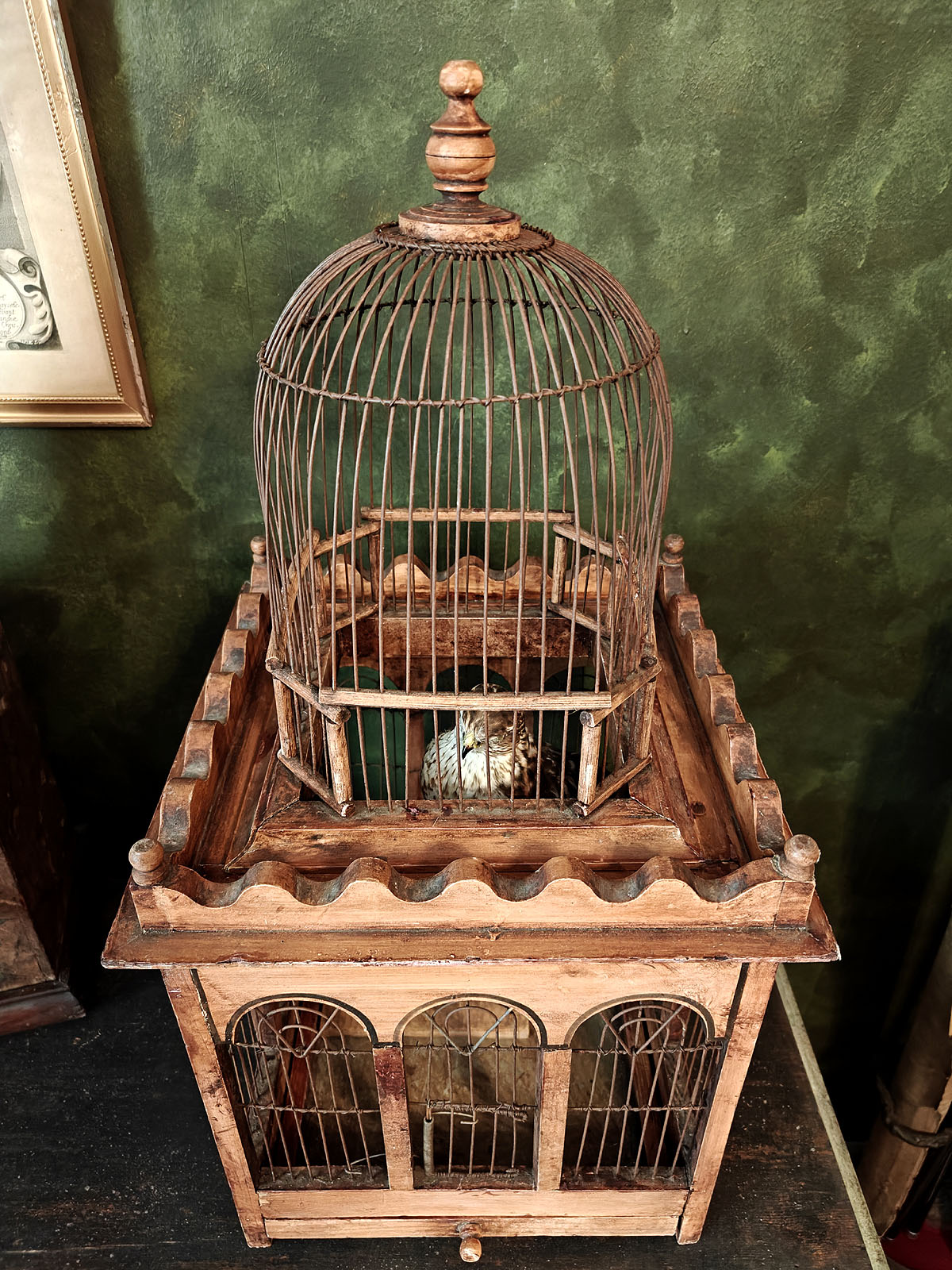 Häkin yläosaa kiertää koristeellinen, sakaramainen puukaide, joka antaa esineelle linnamaisen ulkonäön. Tällaiset häkit olivat porvariskotien loisteliaita sisustuselementtejä ja nykyään ne ovat erittäin haluttuja ”Wunderkammer” -tyylisten kokoelmien keskipisteiksi. Esine huokuu menneen ajan eleganssia ja on kookkaana huonekalumaisena elementtinä harvoin tarjolla. Huom! Jos kuvassa näkyvä ”häkin asukki” kiinnostaa, se on ostettavissa myös erikseen mukaan.