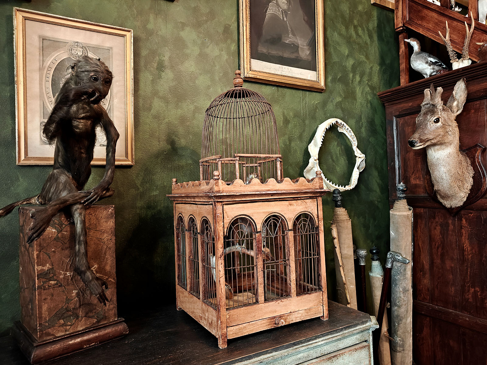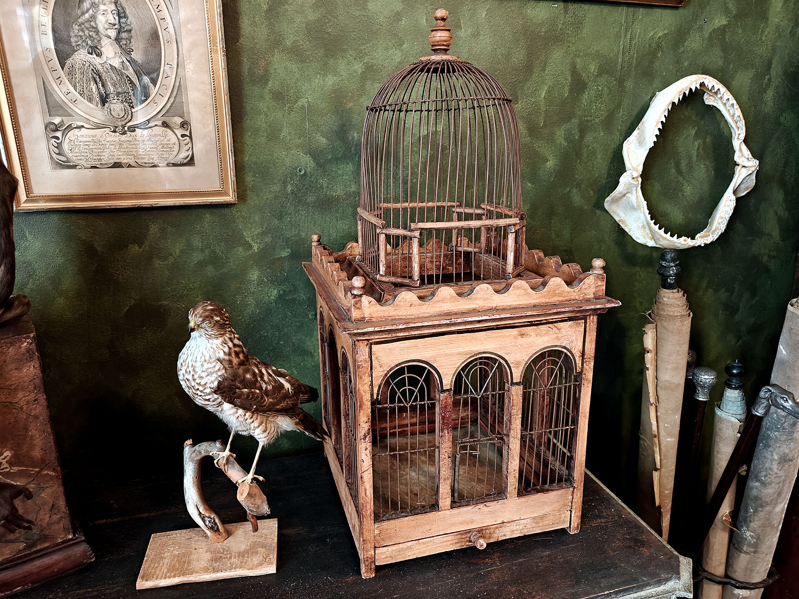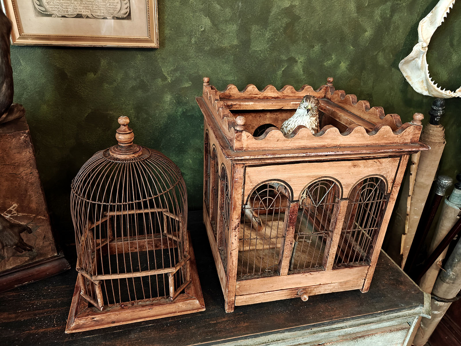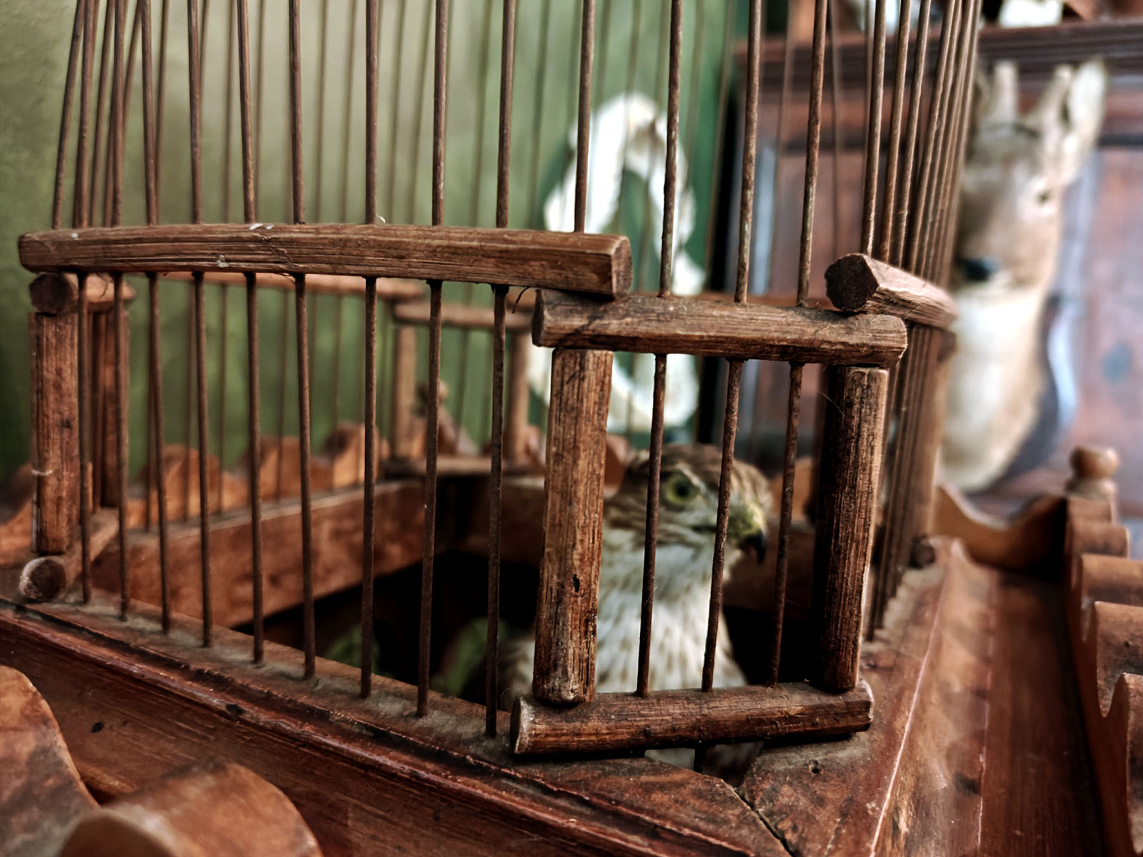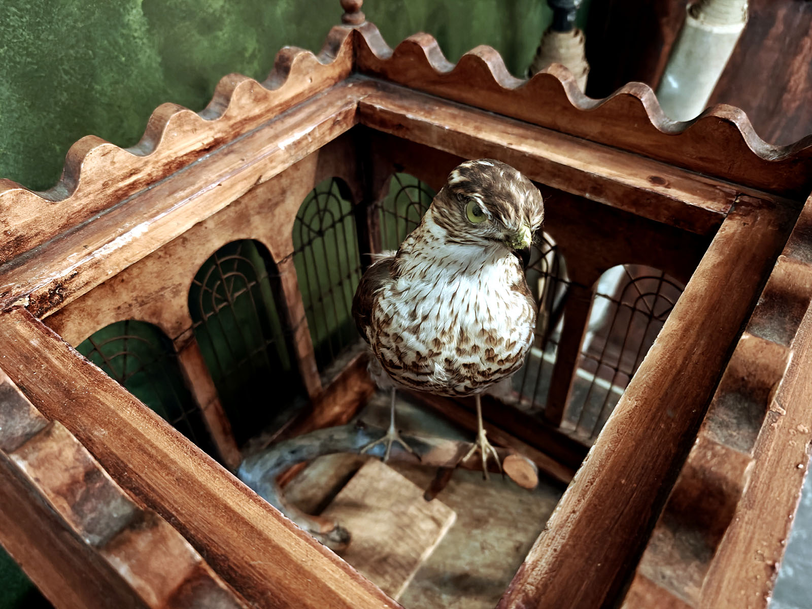 Häkin yläosaa kiertää koristeellinen, sakaramainen puukaide, joka antaa esineelle linnamaisen ulkonäön. Tällaiset häkit olivat porvariskotien loisteliaita sisustuselementtejä ja nykyään ne ovat erittäin haluttuja ”Wunderkammer” -tyylisten kokoelmien keskipisteiksi. Esine huokuu menneen ajan eleganssia ja on kookkaana huonekalumaisena elementtinä harvoin tarjolla. Huom! Jos kuvassa näkyvä ”häkin asukki” kiinnostaa, se on ostettavissa myös erikseen mukaan.