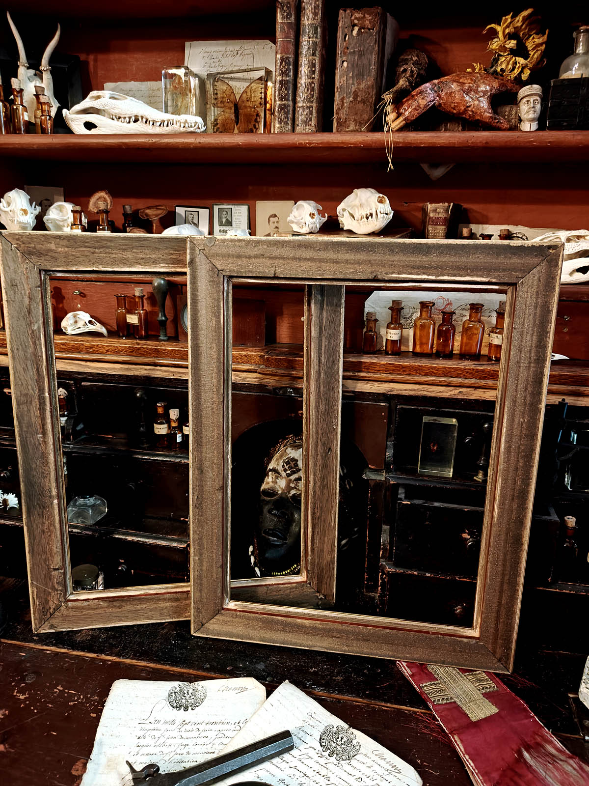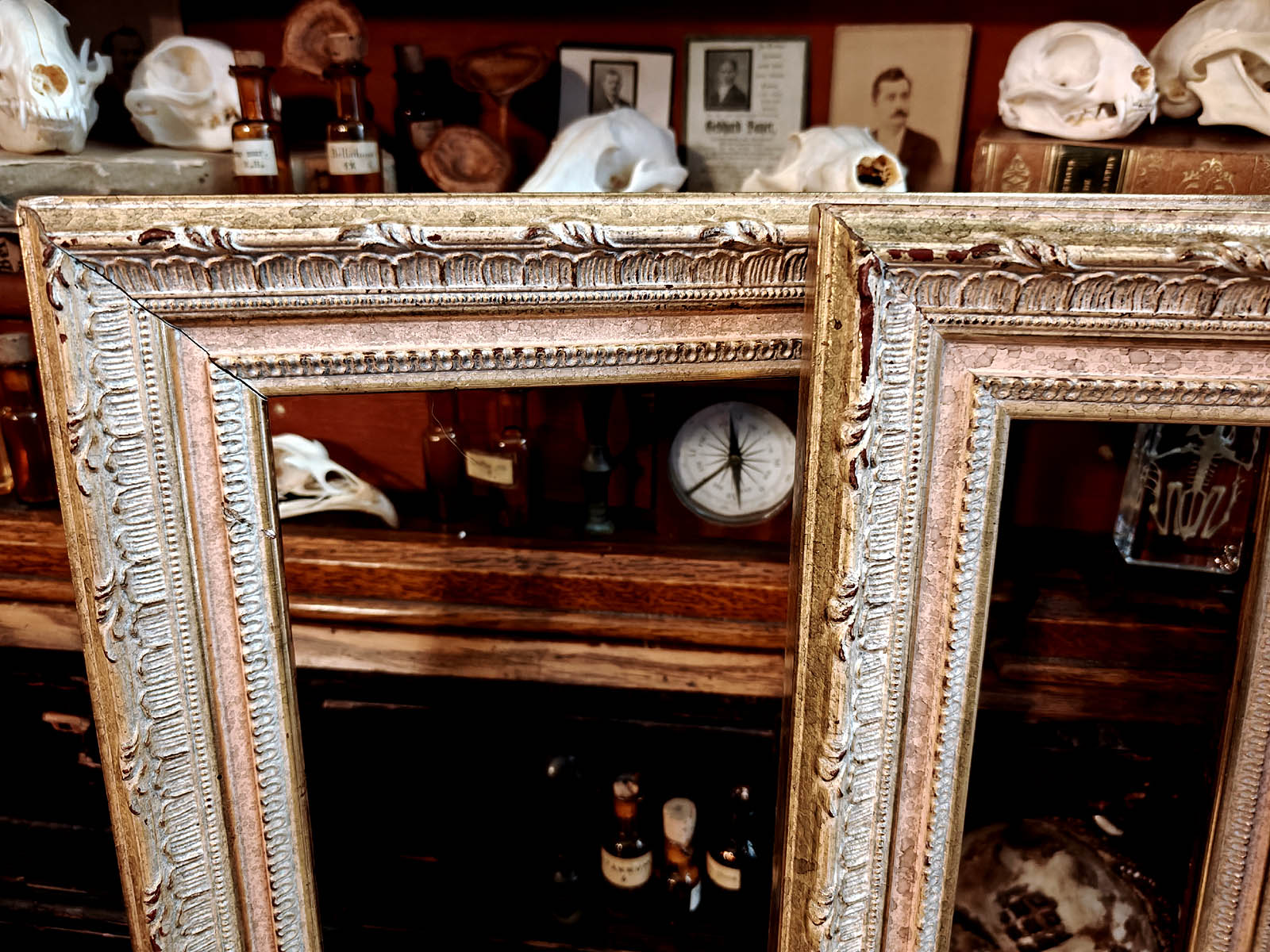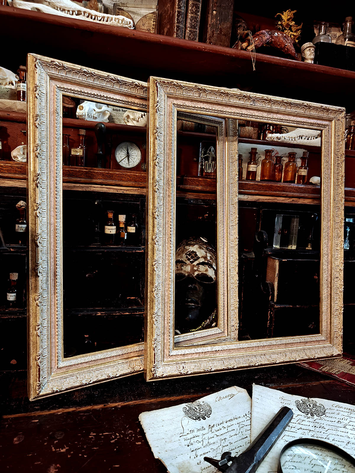 Kehysten muotokieli ammentaa juurensa myöhäisbarokin ja rokokoon uudelleentulkinnasta, joka oli suosittua 1900‑luvun alun ranskalaisissa salongeissa ja kirjastoissa. Tämä upea kehyspari toimii hienosti sisustuksessa sellaisenaan, tai niihin voi kehystää esim. peilin tai itselle tärkeän teoksen. Todella haastava kohde löytää aidosti vanhana ja näin hyvässä kunnossa.