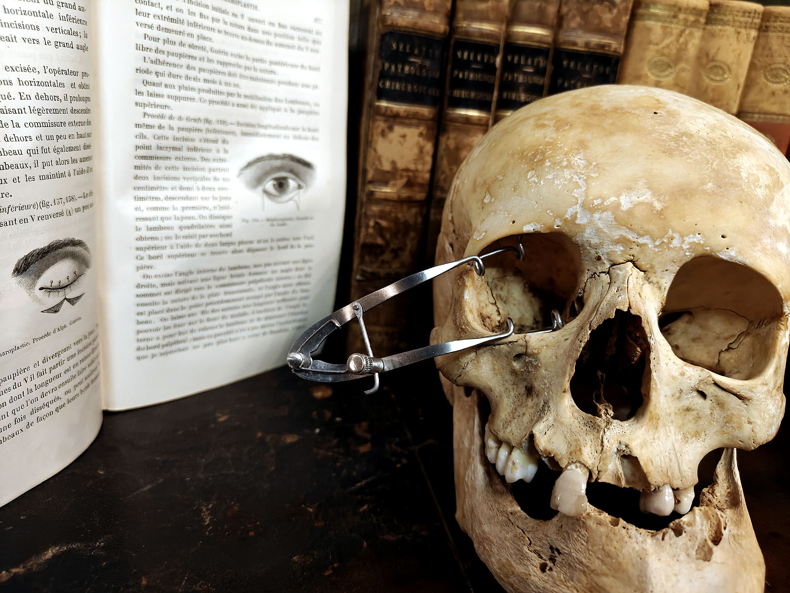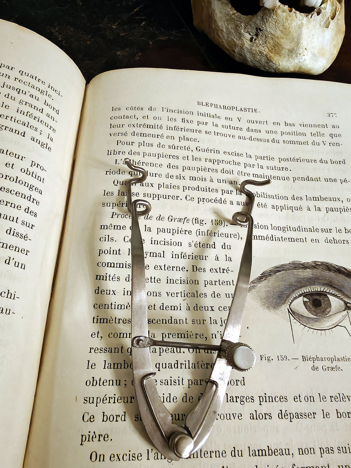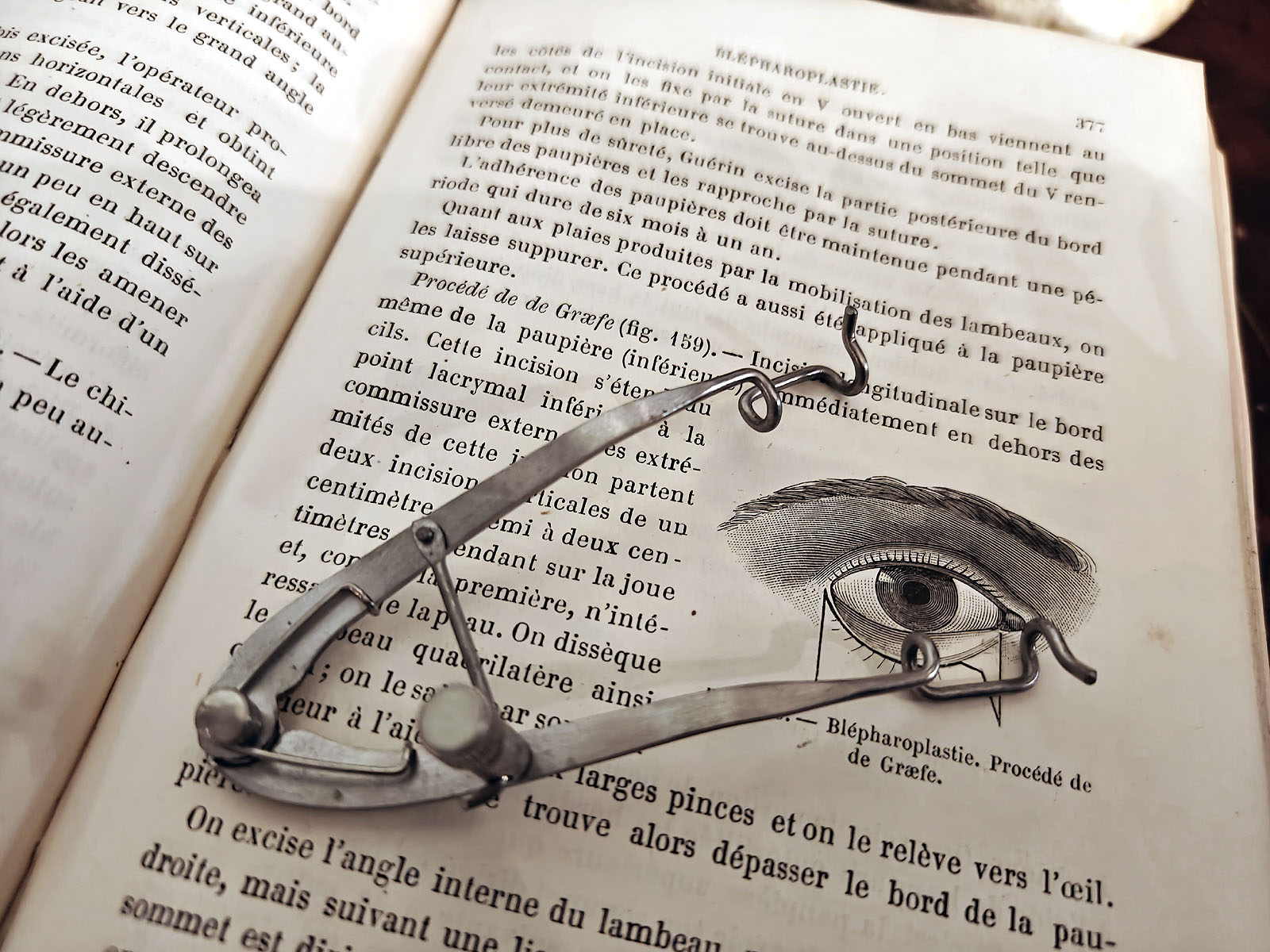 Muuta: Tämä hienomekaaninen instrumentti on antiikkinen silmäluomen levitin, eli blefarostaatti, jota käytettiin 1800- ja 1900-lukujen silmäkirurgiassa. Sen jousi- ja ruuvimekanismi mahdollisti luomien hallitun ja vakaan avauksen leikkauksen aikana. Tämä oli ratkaiseva ominaisuus tarkkuutta vaativissa toimenpiteissä, kuten luomen korjausleikkauksissa (blepharoplastie).