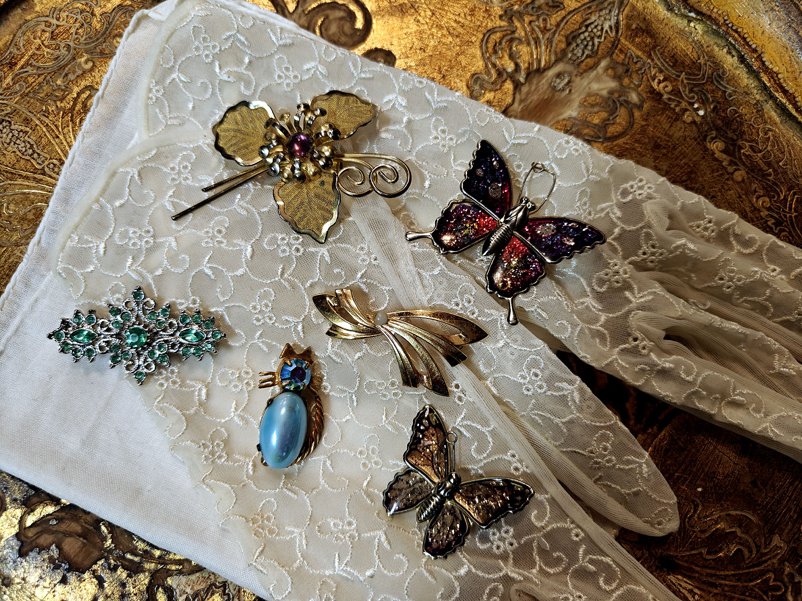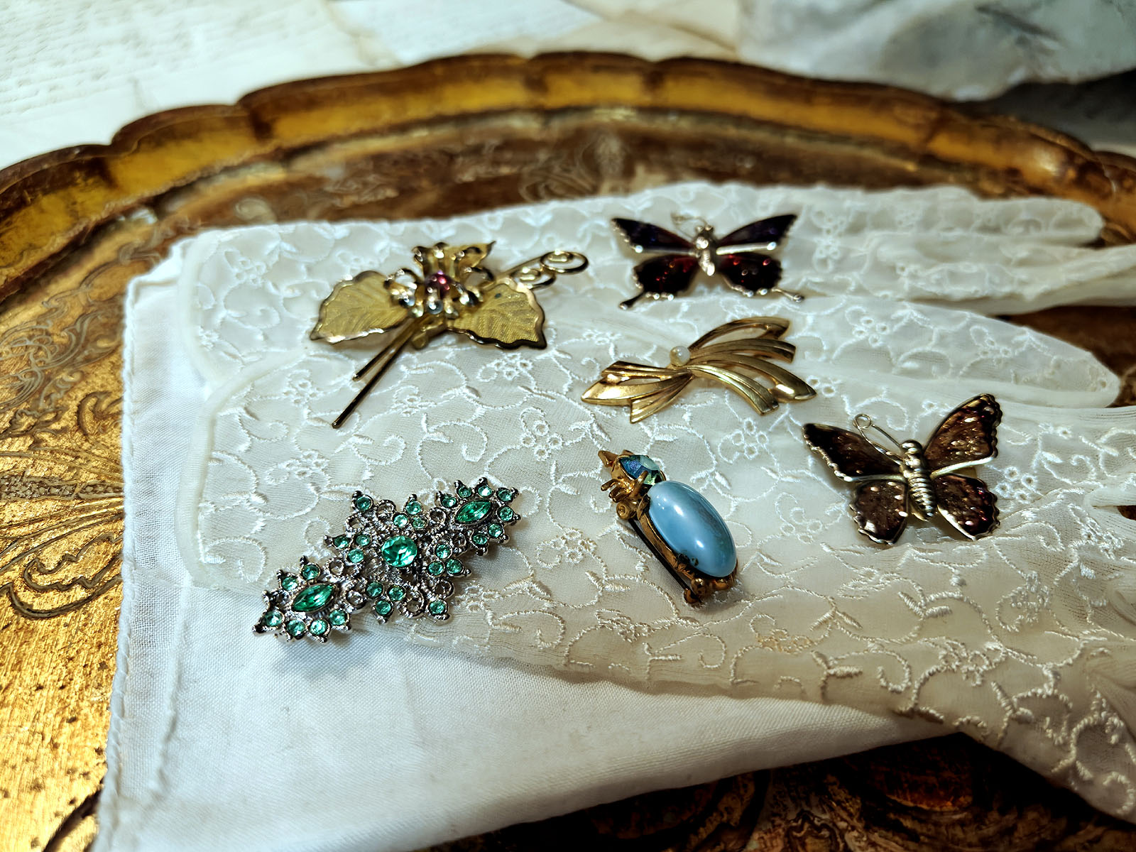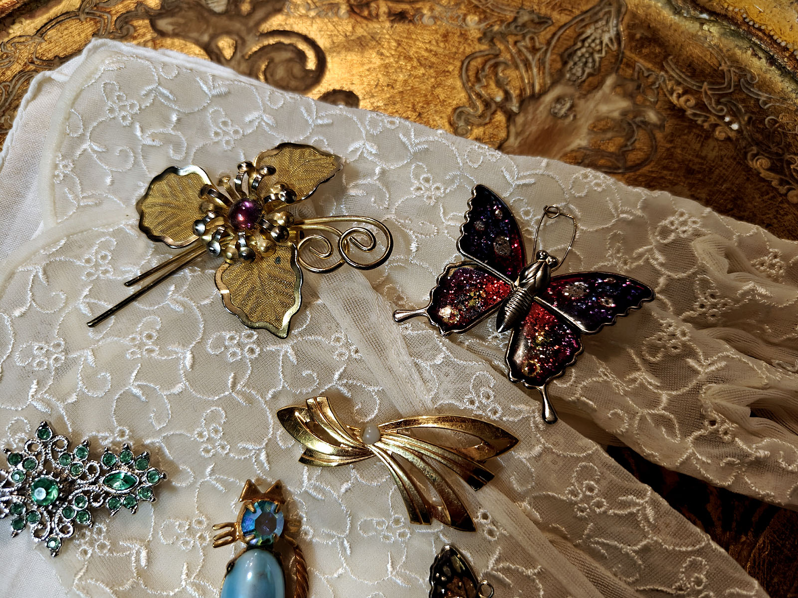 Kokoelman sisällä on useita eri tyylisuuntia: glitter‑pintaiset perhoset edustavat 1960‑luvun iloista ja kokeilevaa muotia, kun taas kultainen kukkaneula ja nauhamainen helmielementti heijastavat klassisempaa, ajattomampaa estetiikkaa. Hopeinen vihreäkivinen brooch tuo mukaan art deco ‑henkistä symmetriaa ja sinikivinen kissarintaneula lisää kokonaisuuteen kepeää charmia ja huumoria. Jokainen koru on kuin oma pieni tarinansa ja yhdessä ne muodostavat intiimin katsauksen yhden ihmisen makuun, tyyliin ja elämänvaiheisiin.
