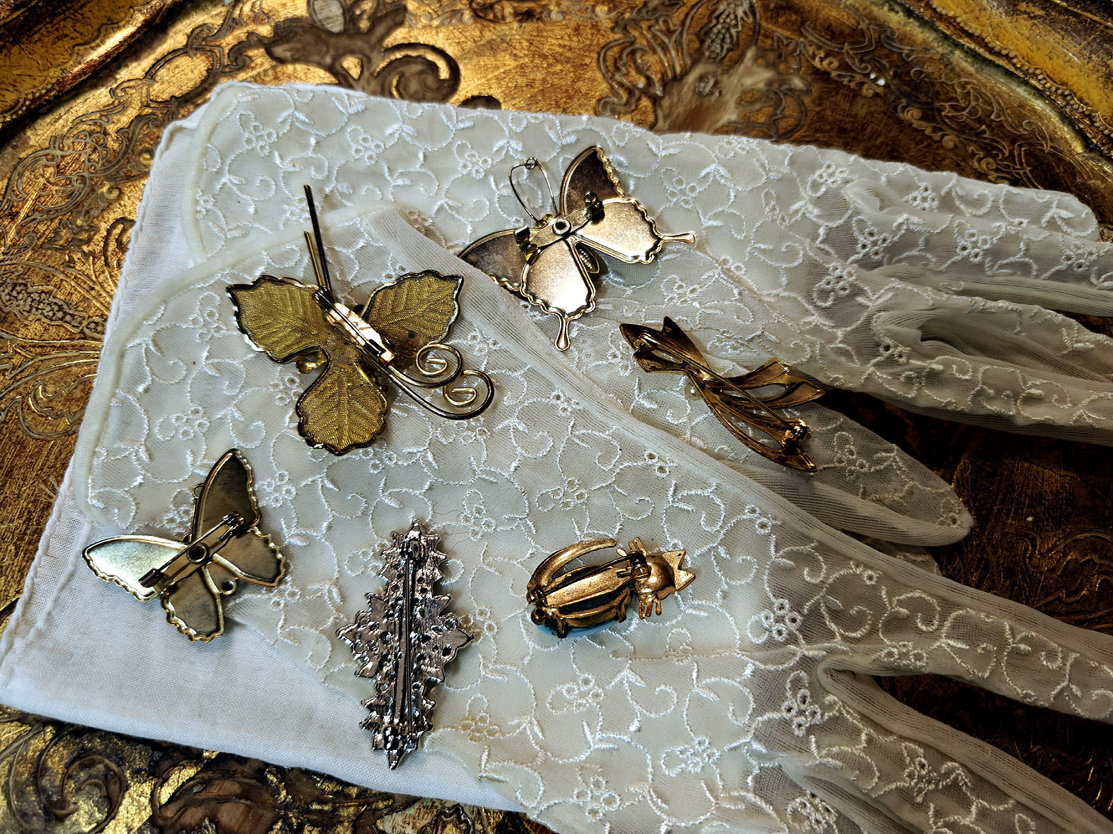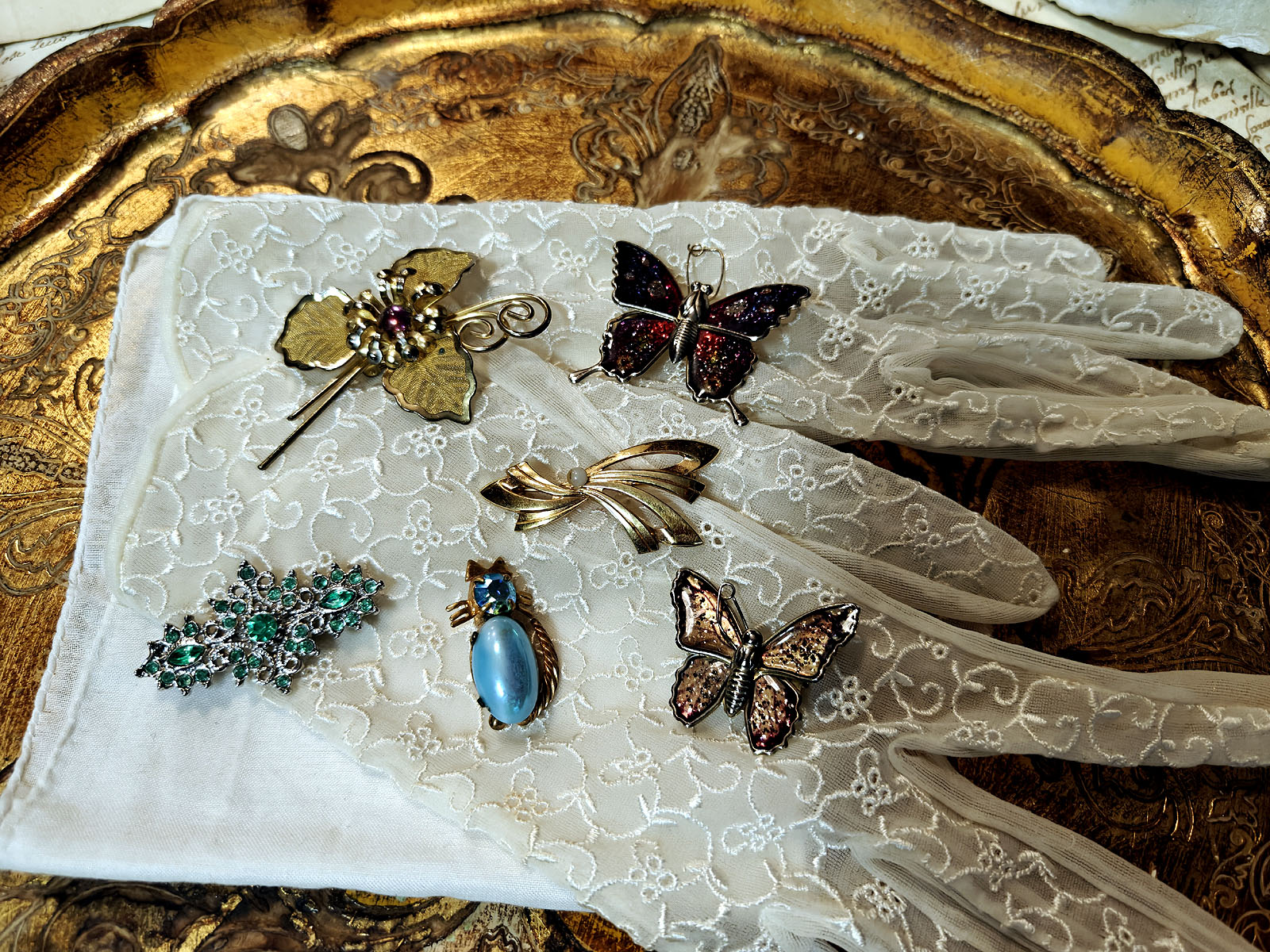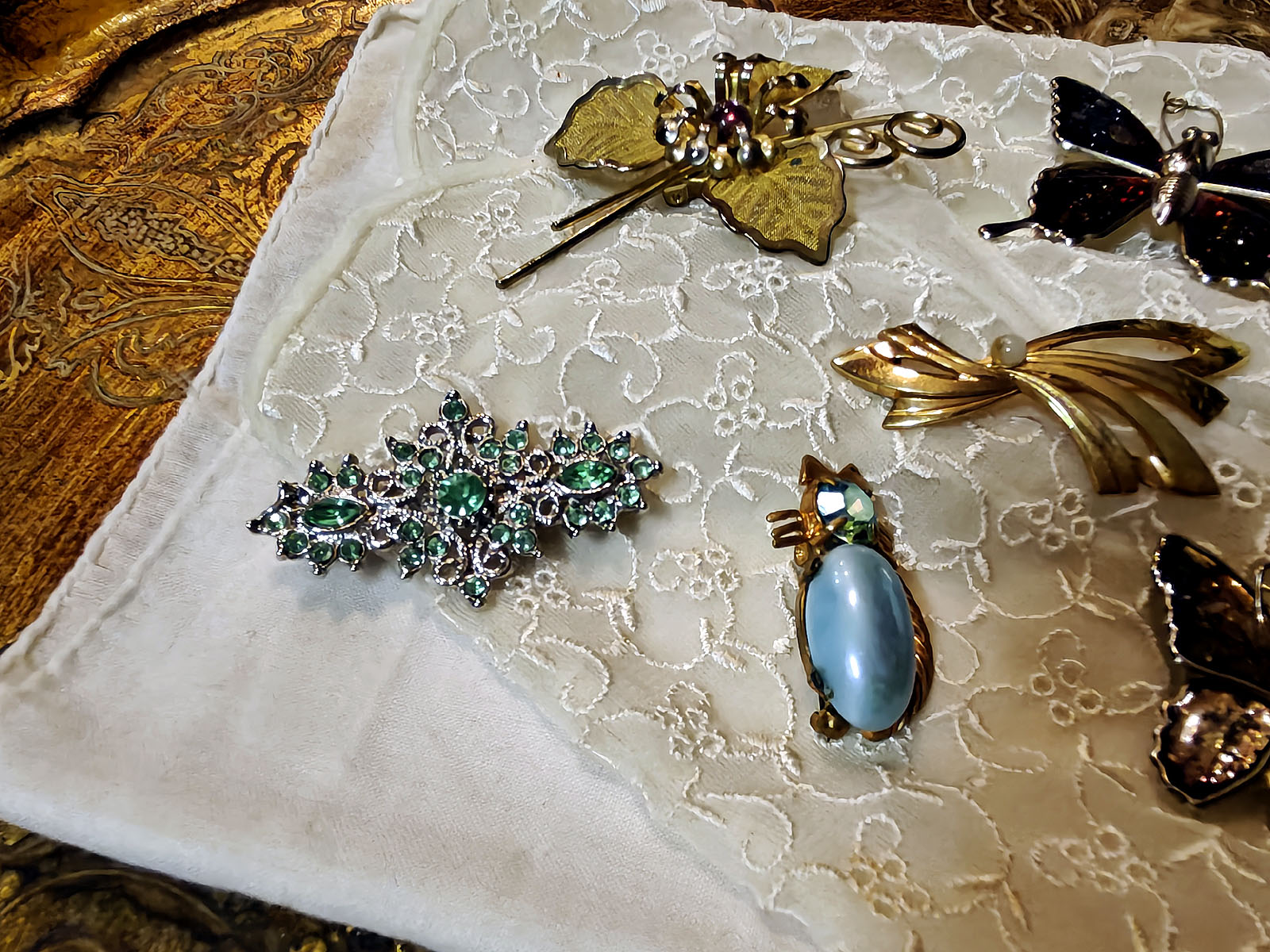 Kokoelman sisällä on useita eri tyylisuuntia: glitter‑pintaiset perhoset edustavat 1960‑luvun iloista ja kokeilevaa muotia, kun taas kultainen kukkaneula ja nauhamainen helmielementti heijastavat klassisempaa, ajattomampaa estetiikkaa. Hopeinen vihreäkivinen brooch tuo mukaan art deco ‑henkistä symmetriaa ja sinikivinen kissarintaneula lisää kokonaisuuteen kepeää charmia ja huumoria. Jokainen koru on kuin oma pieni tarinansa ja yhdessä ne muodostavat intiimin katsauksen yhden ihmisen makuun, tyyliin ja elämänvaiheisiin.